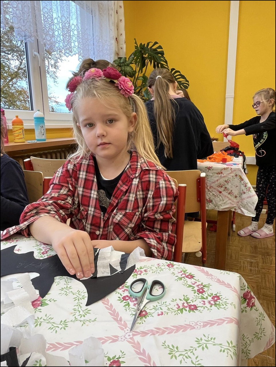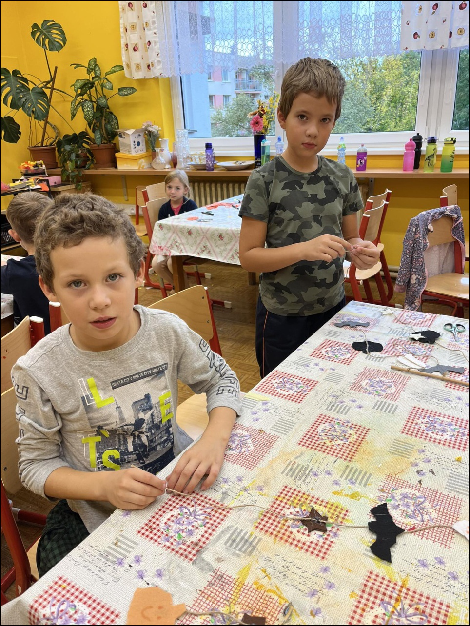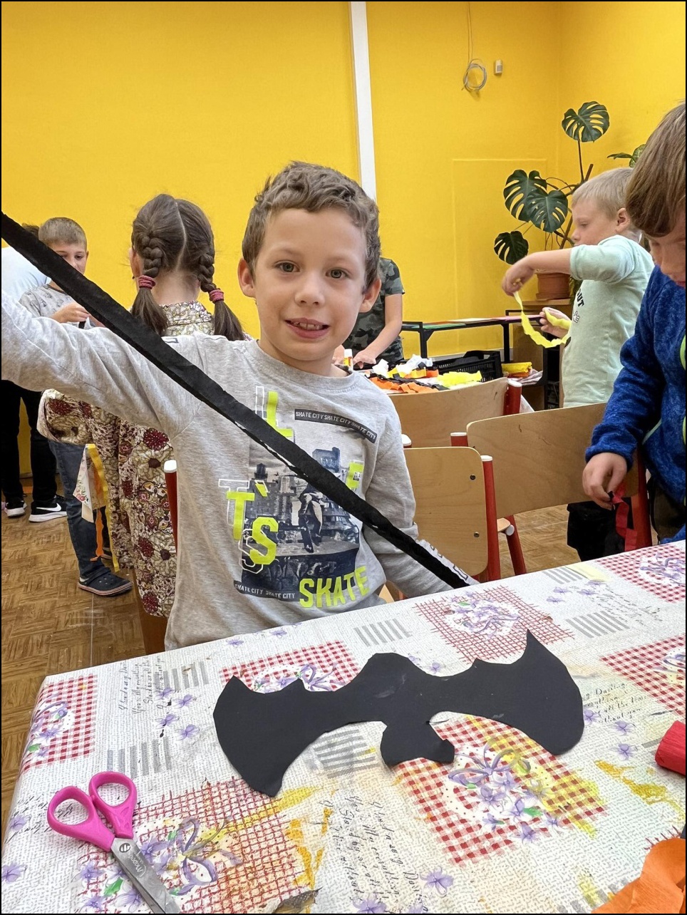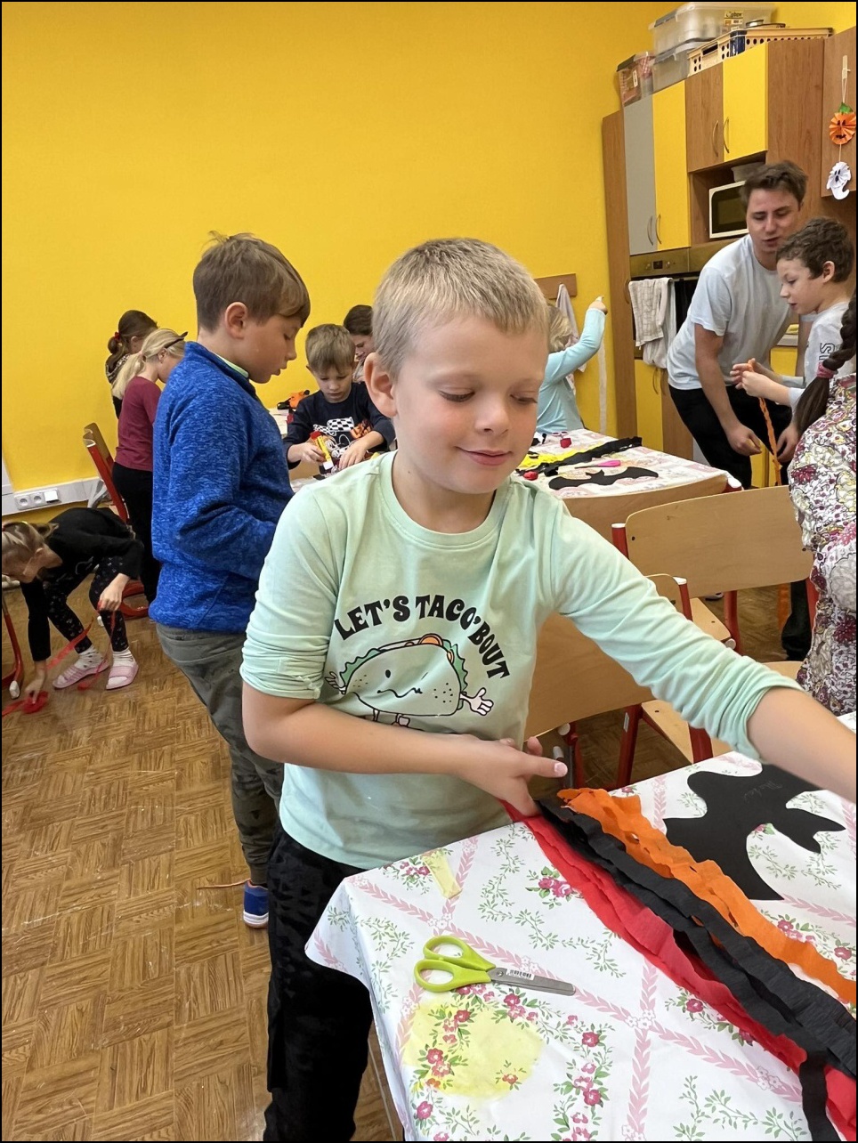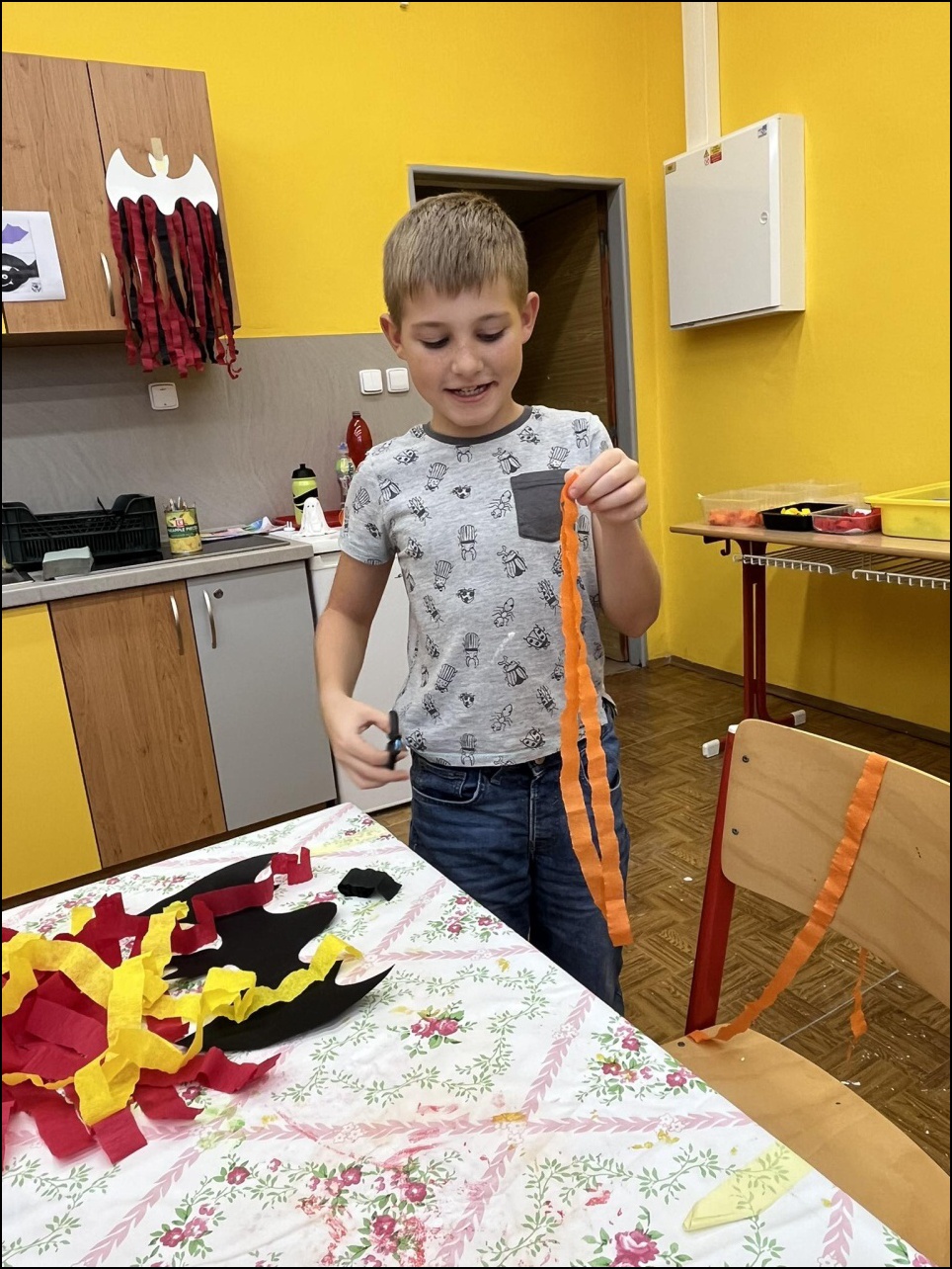 Po obědě jsme pokračovali ve výrobě strašidelných dekorací. Čekala nás příprava závěsů. Děti si z plstě vystříhaly duchy, netopýry a dýně, které následně připevňovaly na provázek. Následně jsme společně provázky přivázali k tyčce a vytvořili tím Halloweenský závěs.
