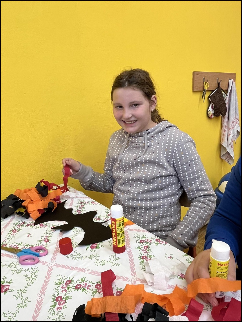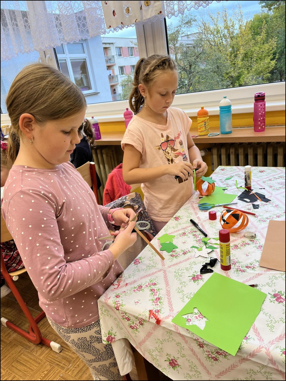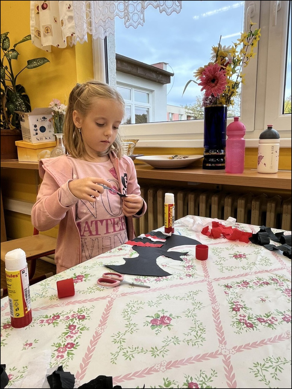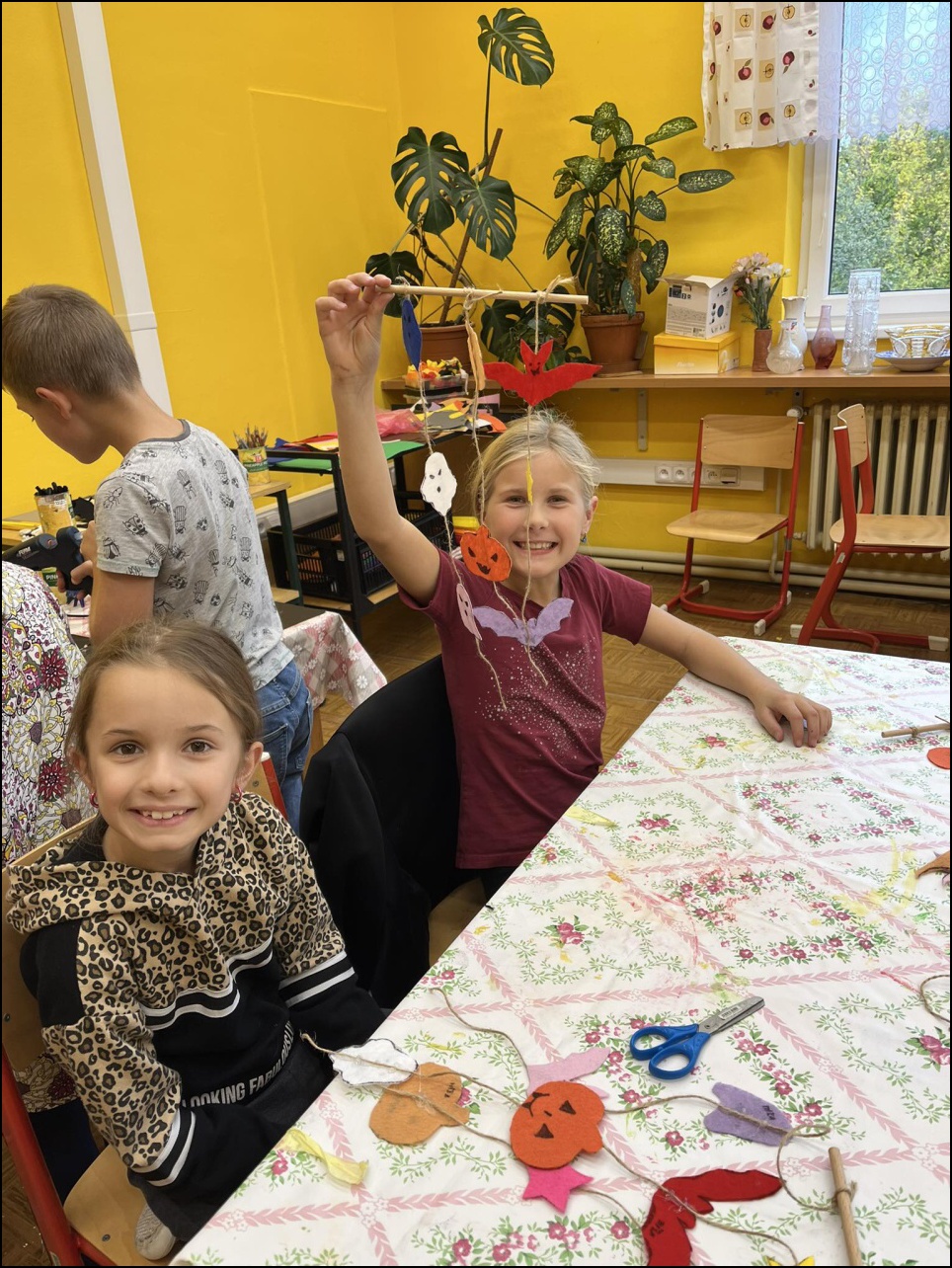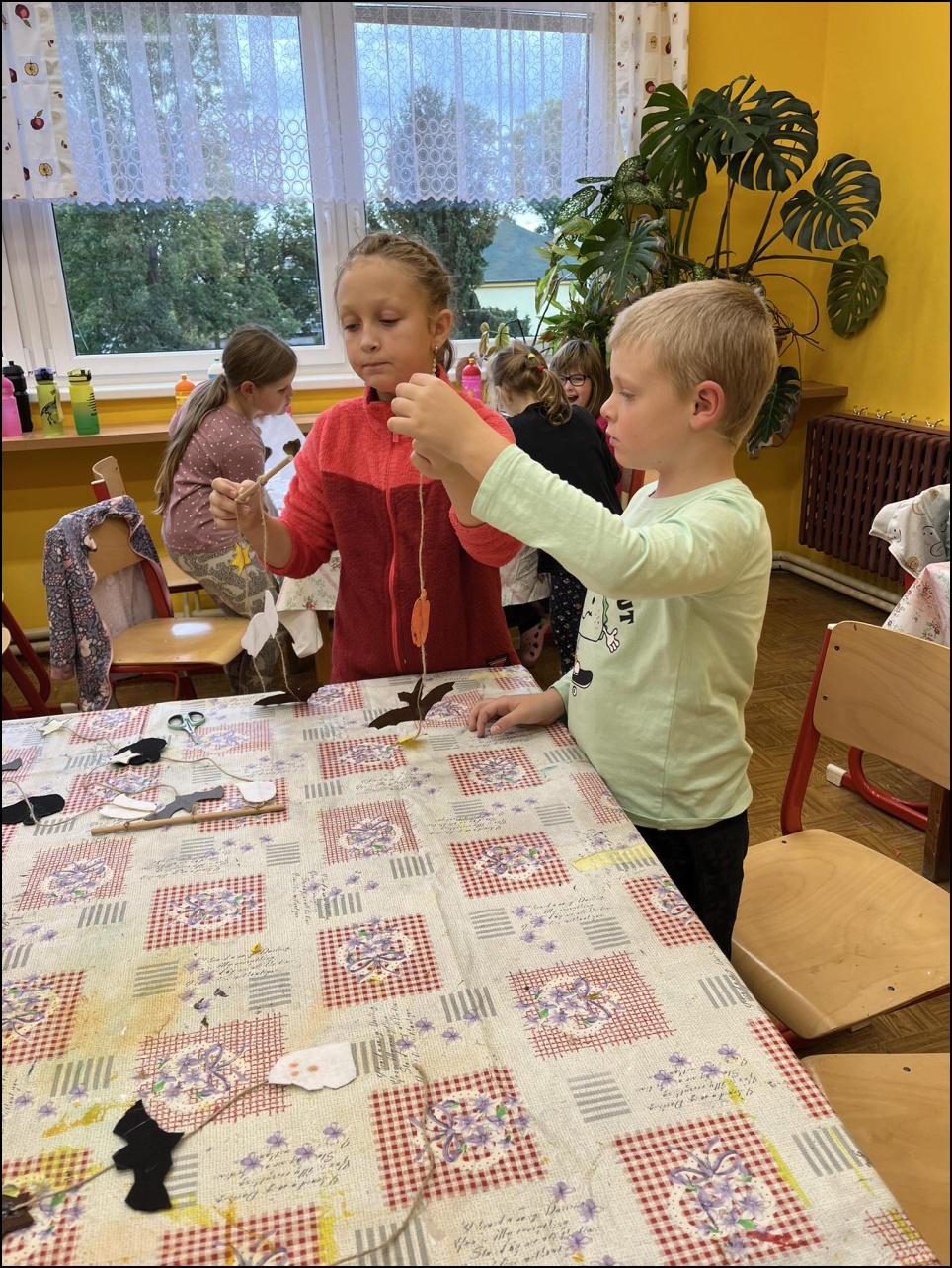 Po obědě jsme pokračovali ve výrobě strašidelných dekorací. Čekala nás příprava závěsů. Děti si z plstě vystříhaly duchy, netopýry a dýně, které následně připevňovaly na provázek. Následně jsme společně provázky přivázali k tyčce a vytvořili tím Halloweenský závěs.