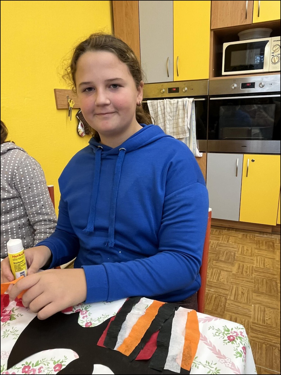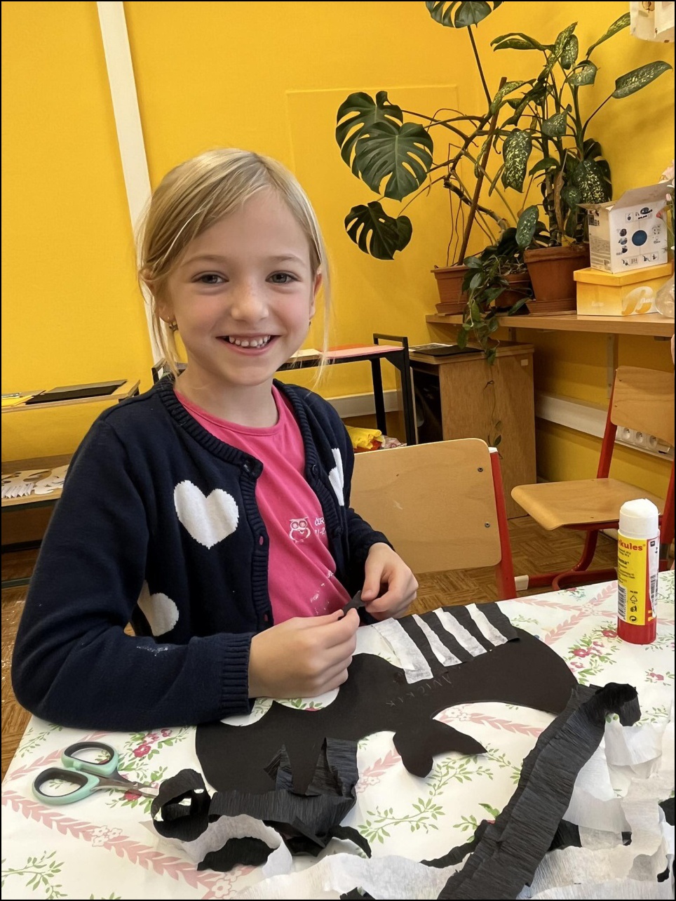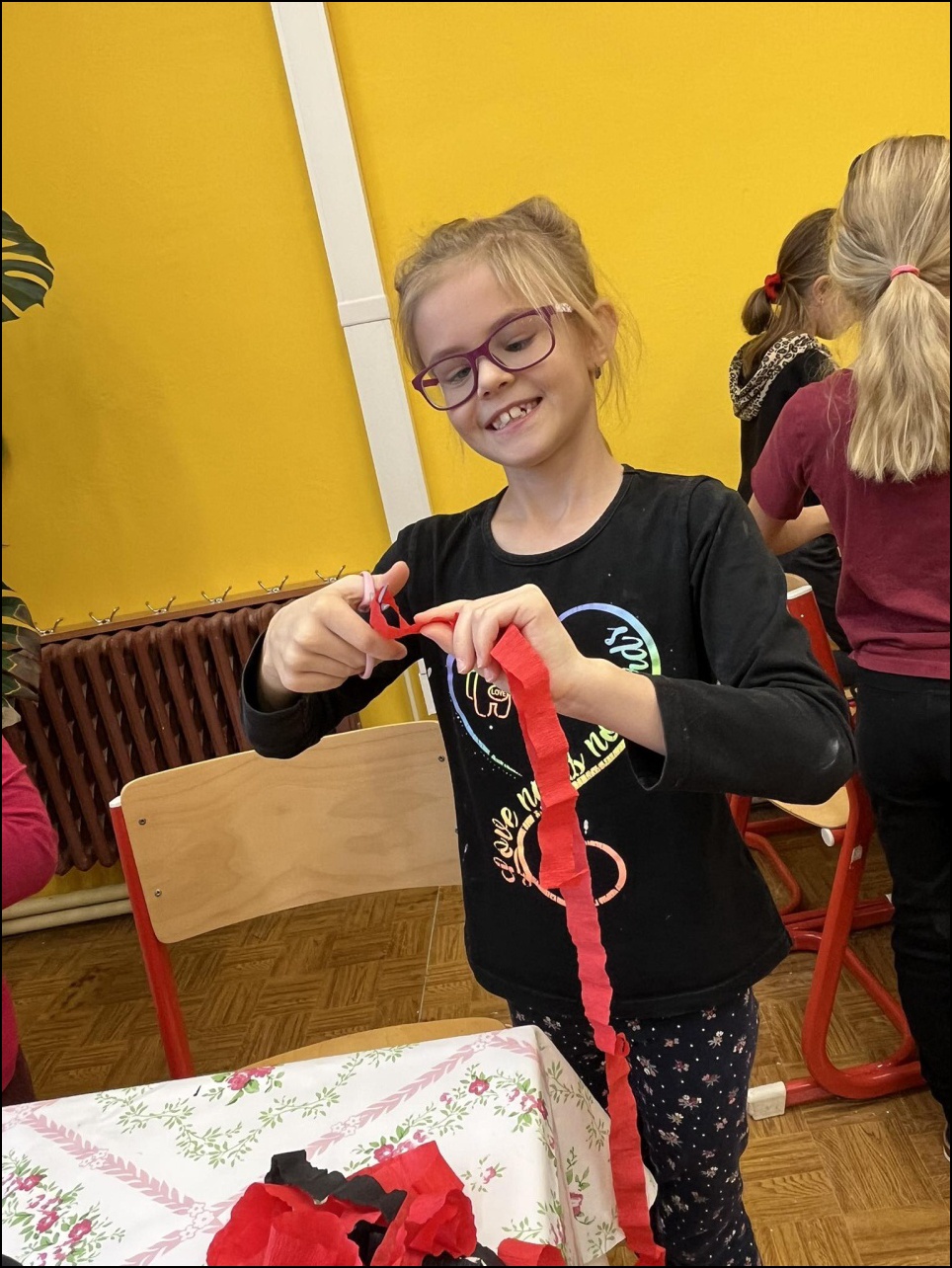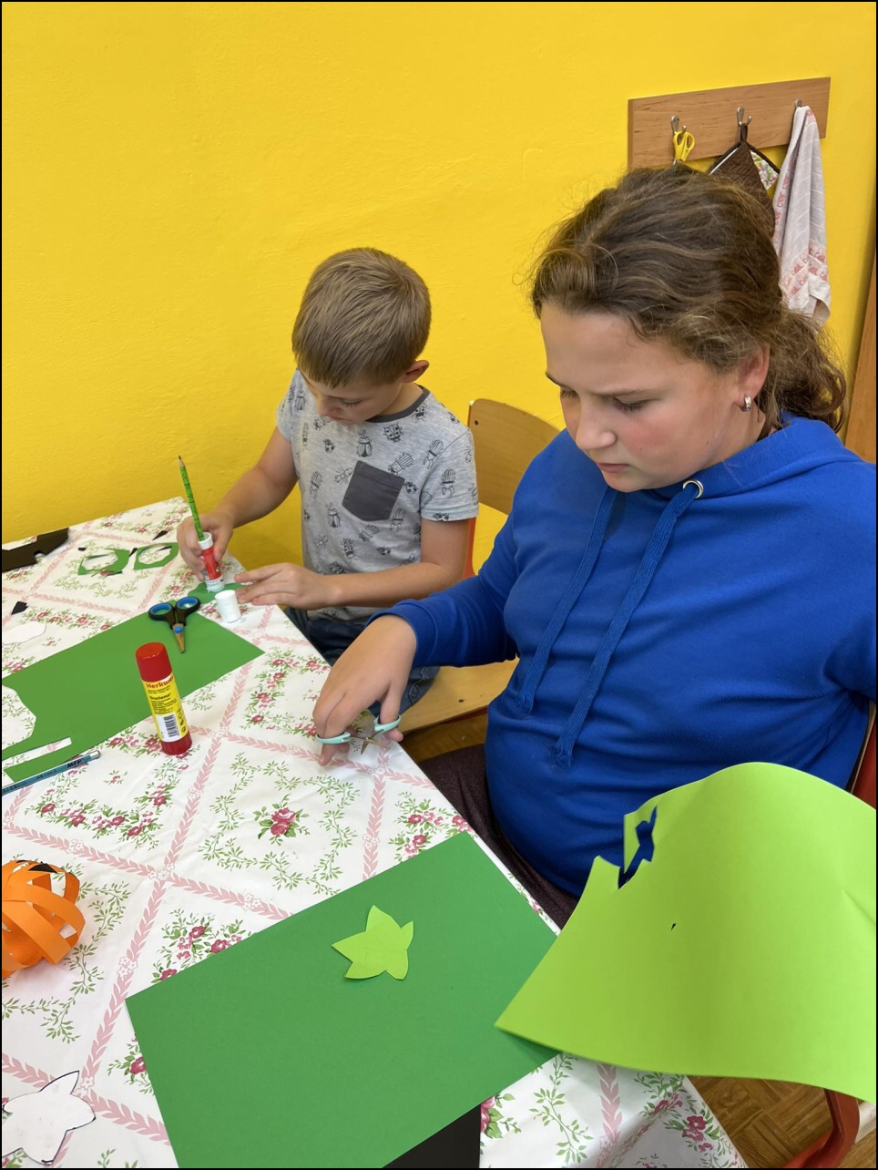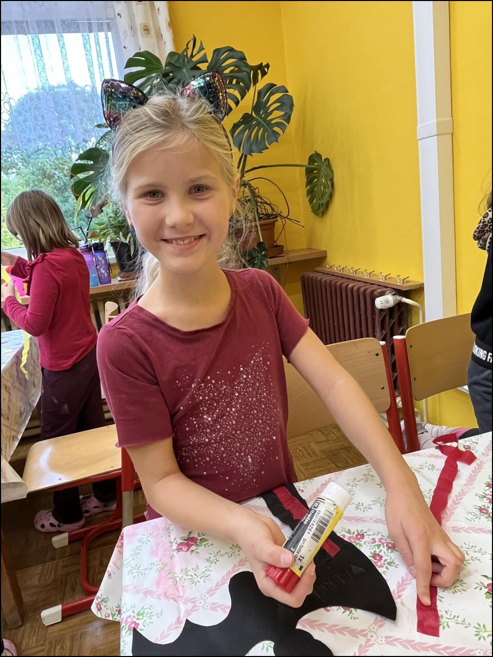 Po obědě jsme pokračovali ve výrobě strašidelných dekorací. Čekala nás příprava závěsů. Děti si z plstě vystříhaly duchy, netopýry a dýně, které následně připevňovaly na provázek. Následně jsme společně provázky přivázali k tyčce a vytvořili tím Halloweenský závěs.