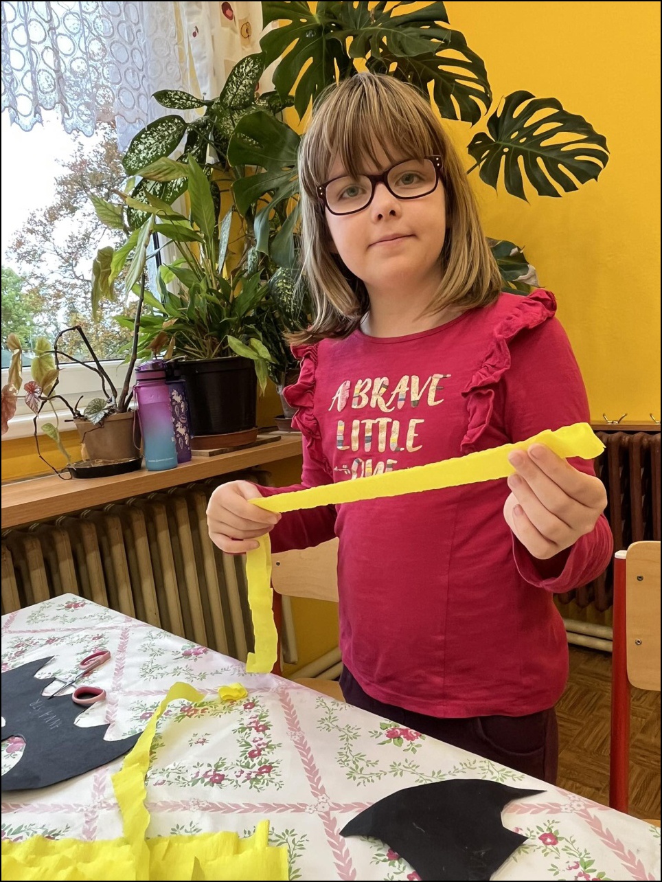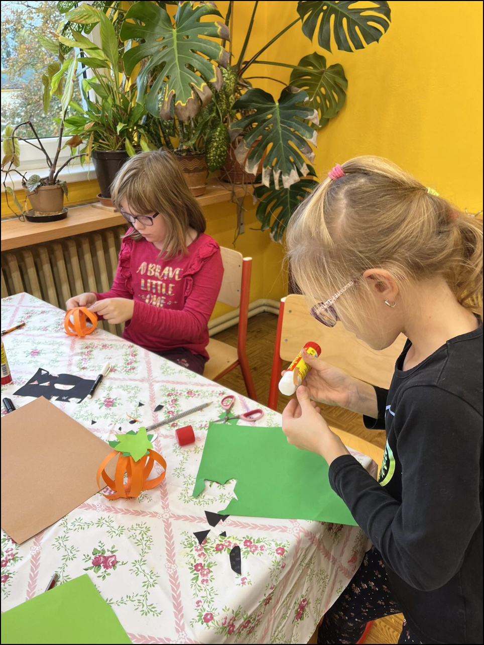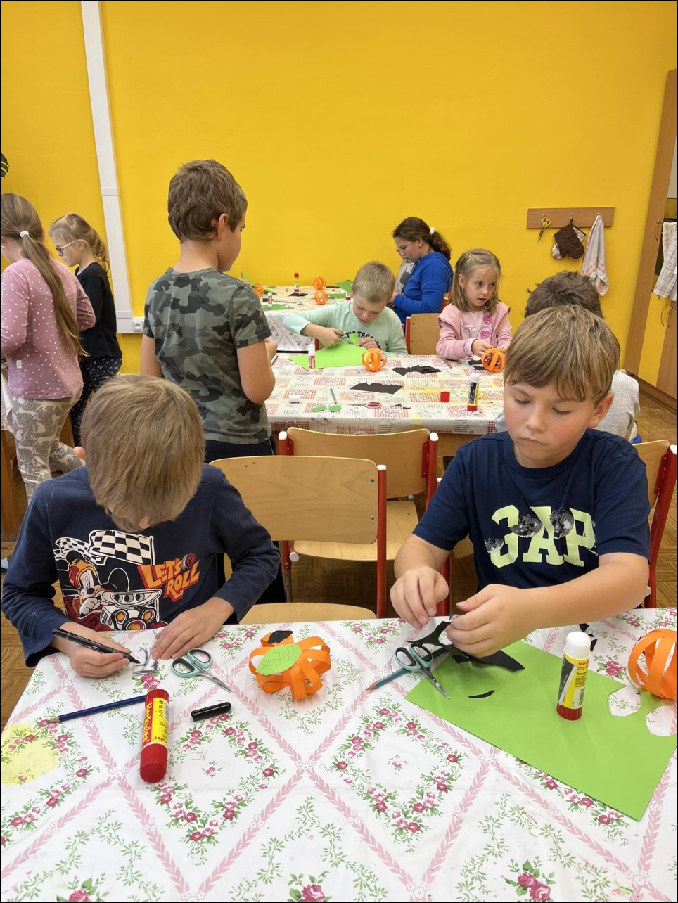 Na závěr si děti vyrobily „skákací“ dýně. Pomocí proužků z barevného papíru si vytvořily plastickou dýni, kterou ozdobily podle své fantazie. Společně jsme si užili spoustu zábavy a kreativního tvoření.