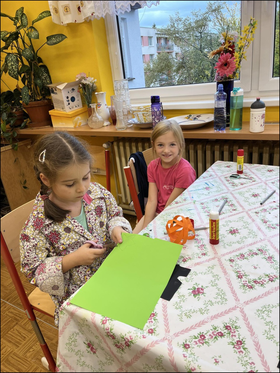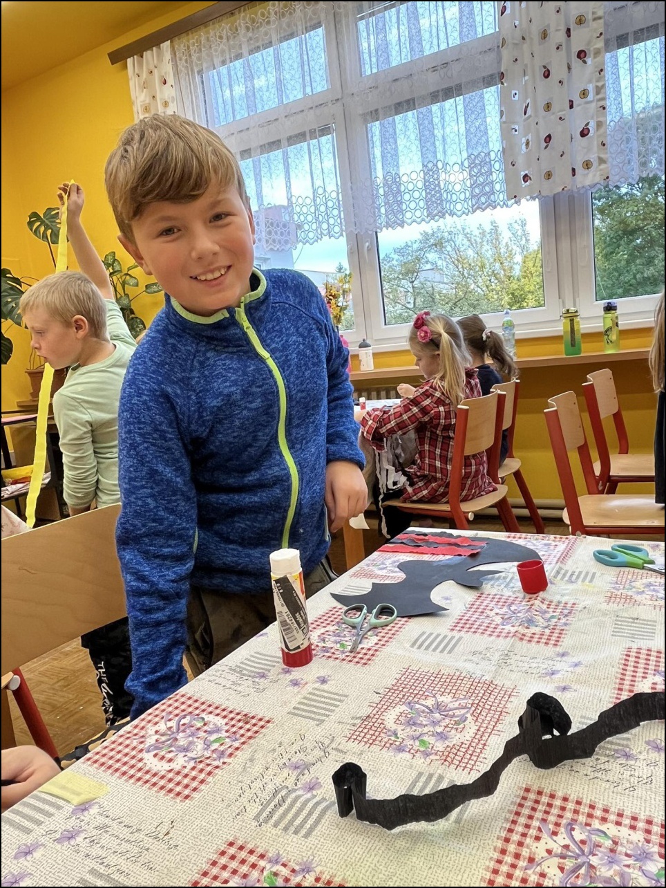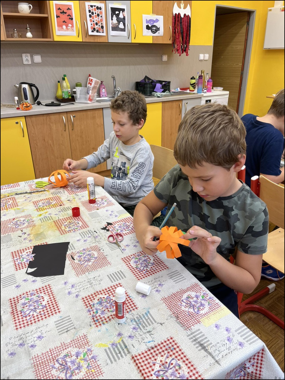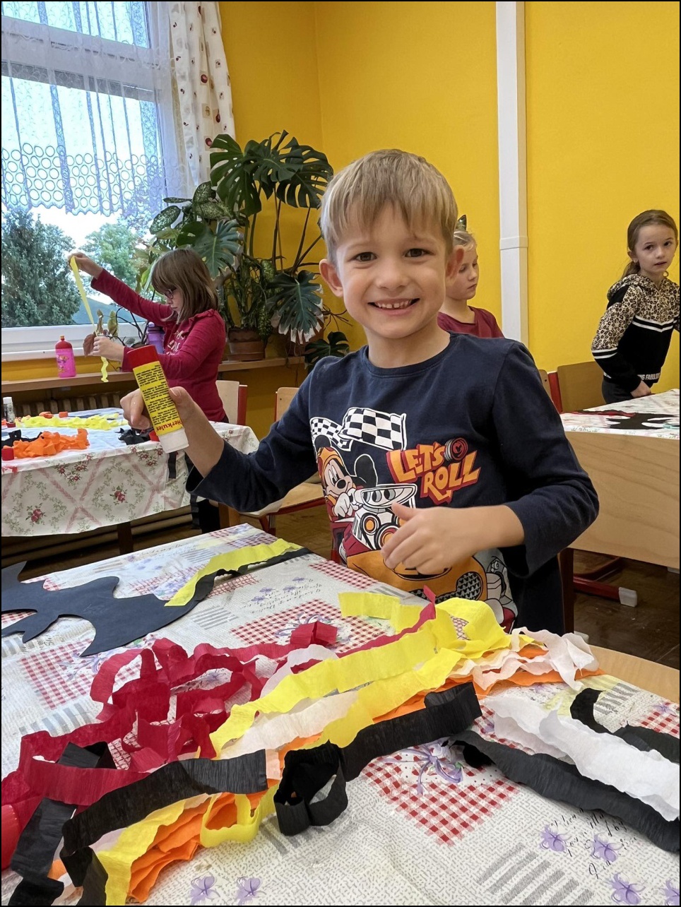 Na závěr si děti vyrobily „skákací“ dýně. Pomocí proužků z barevného papíru si vytvořily plastickou dýni, kterou ozdobily podle své fantazie. Společně jsme si užili spoustu zábavy a kreativního tvoření.