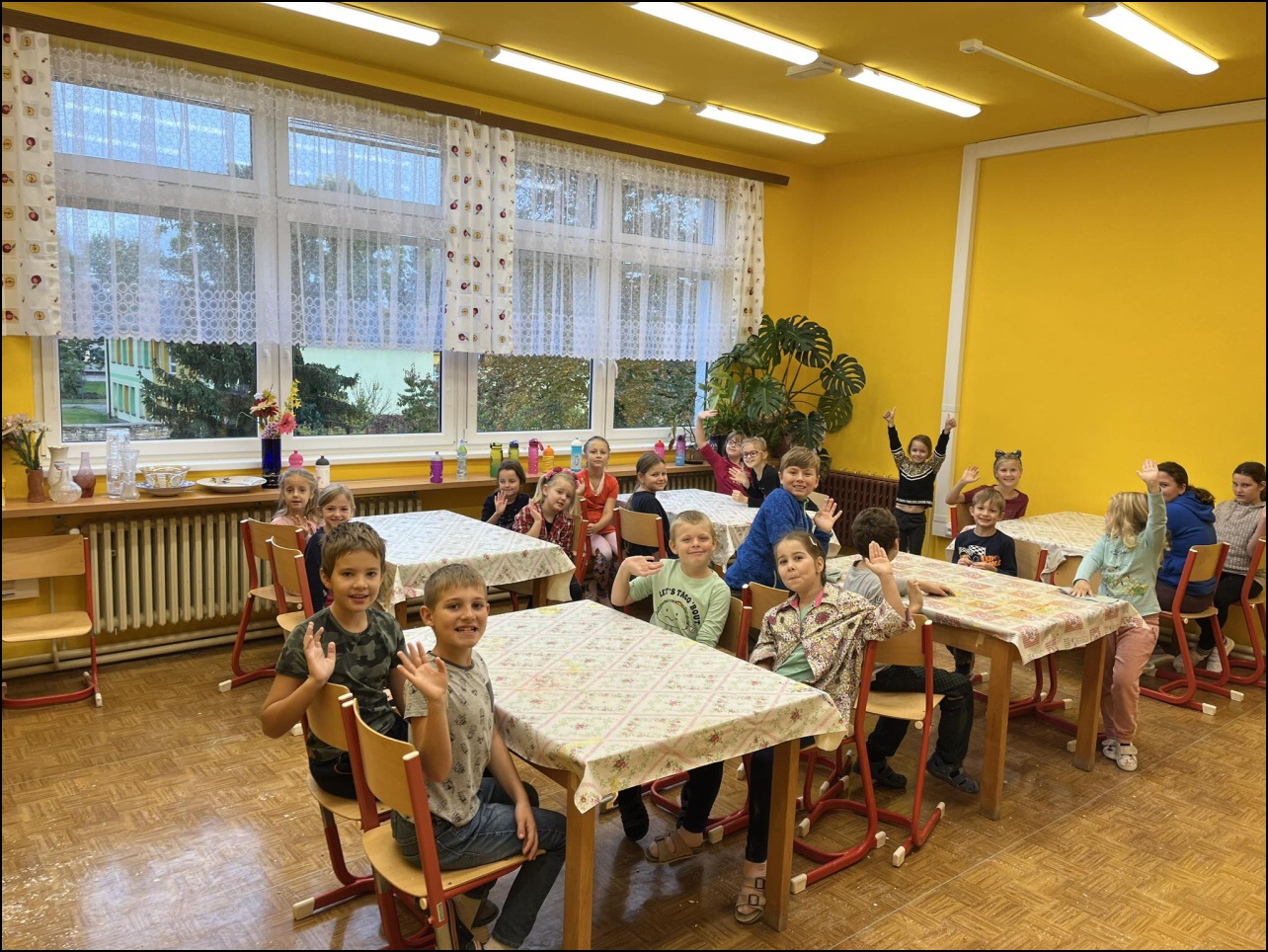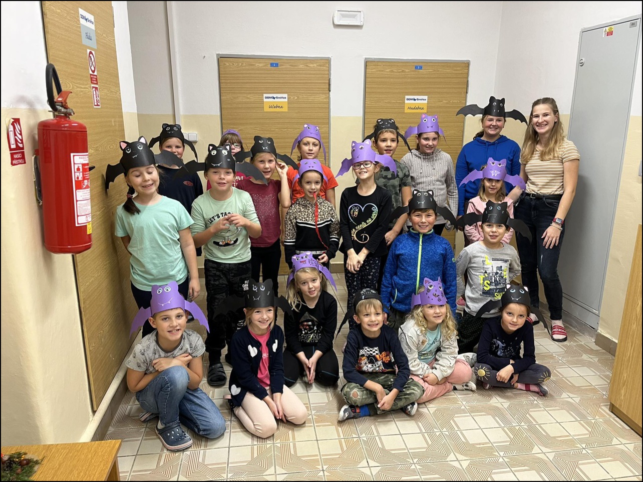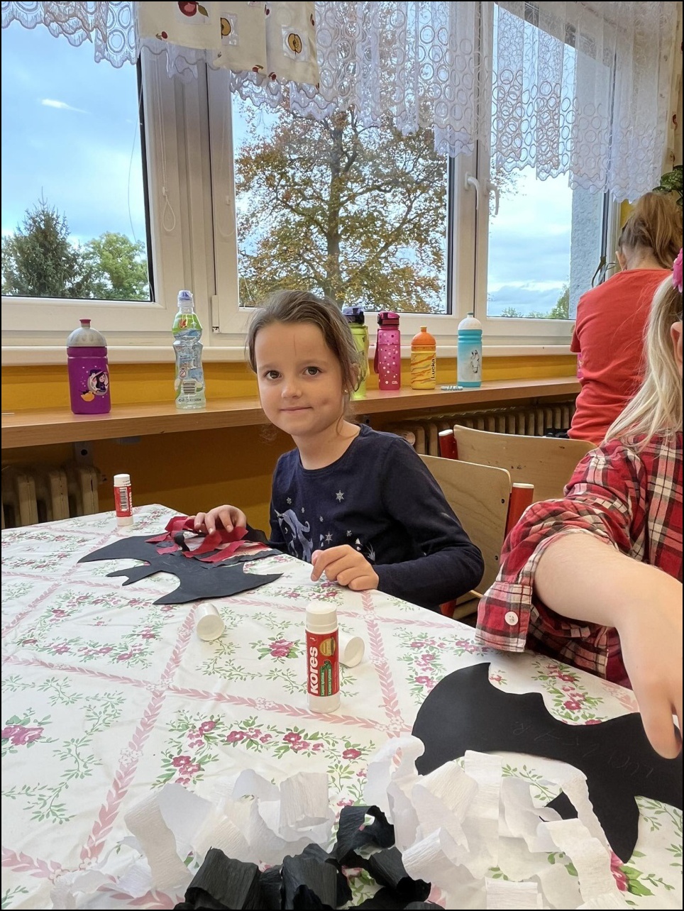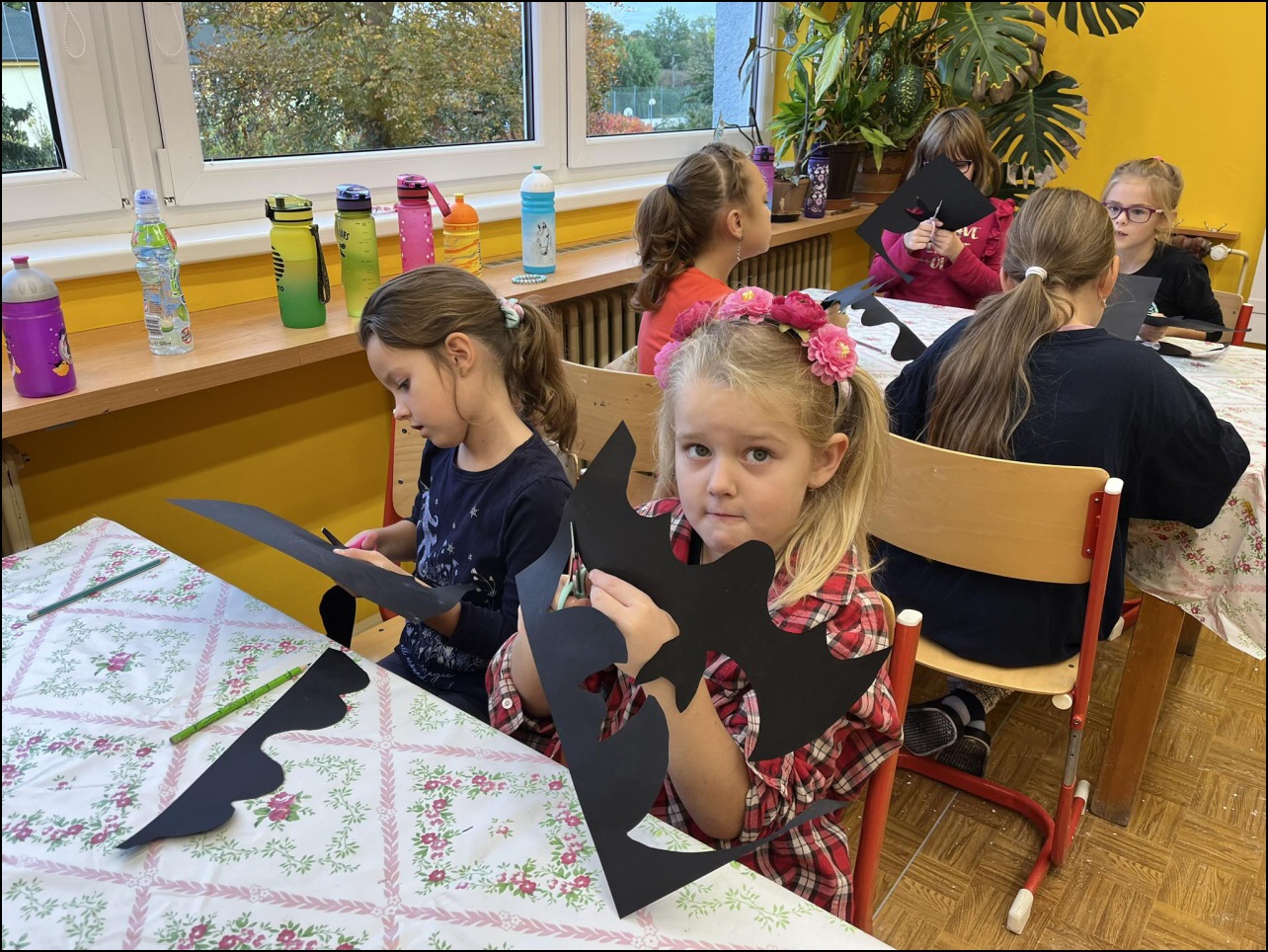 Po náročné bitvě se sádrou jsme se společně přesunuli k výrobě strašidelných netopýřích čelenek a závěsného netopýra plného barev. Po dopolední tvorbě jsme se vydali na oběd do jídelny v Holohlavech, kde nás čekal chutný kuřecí řízek.