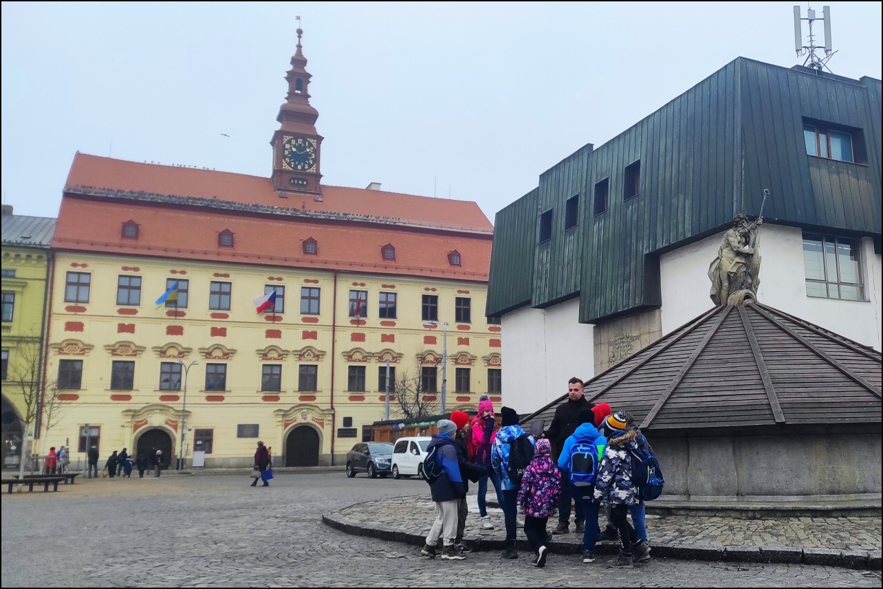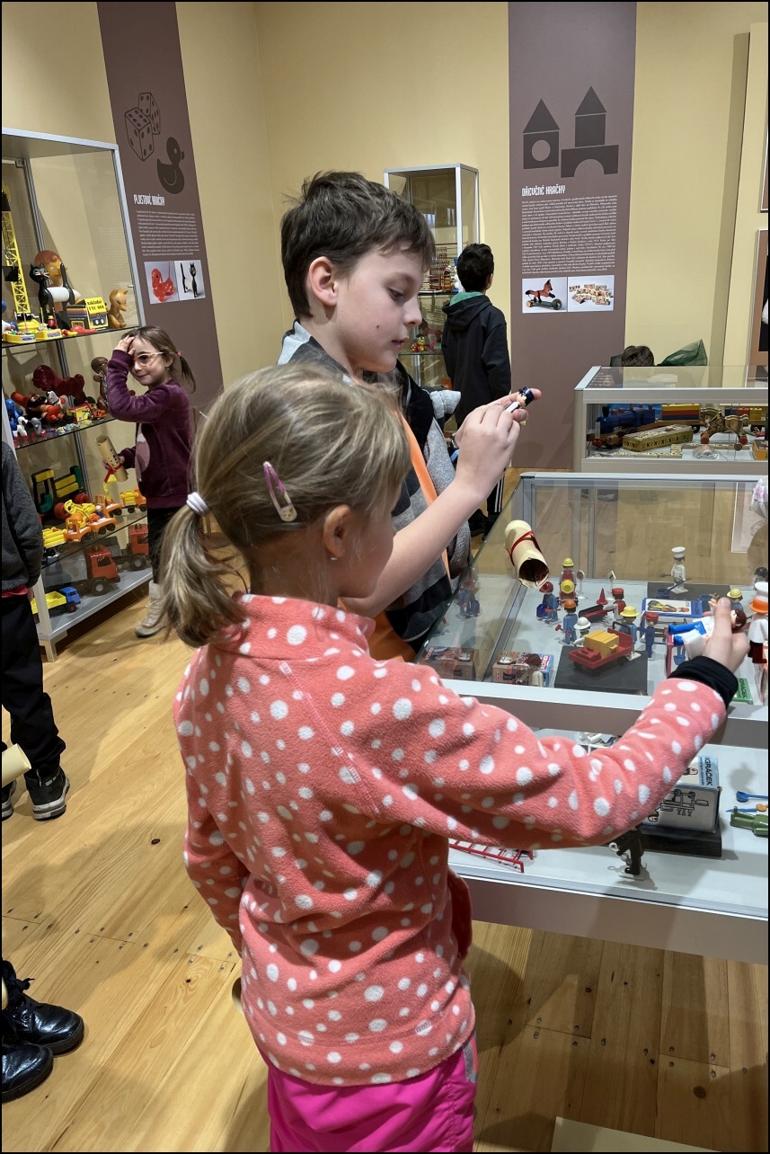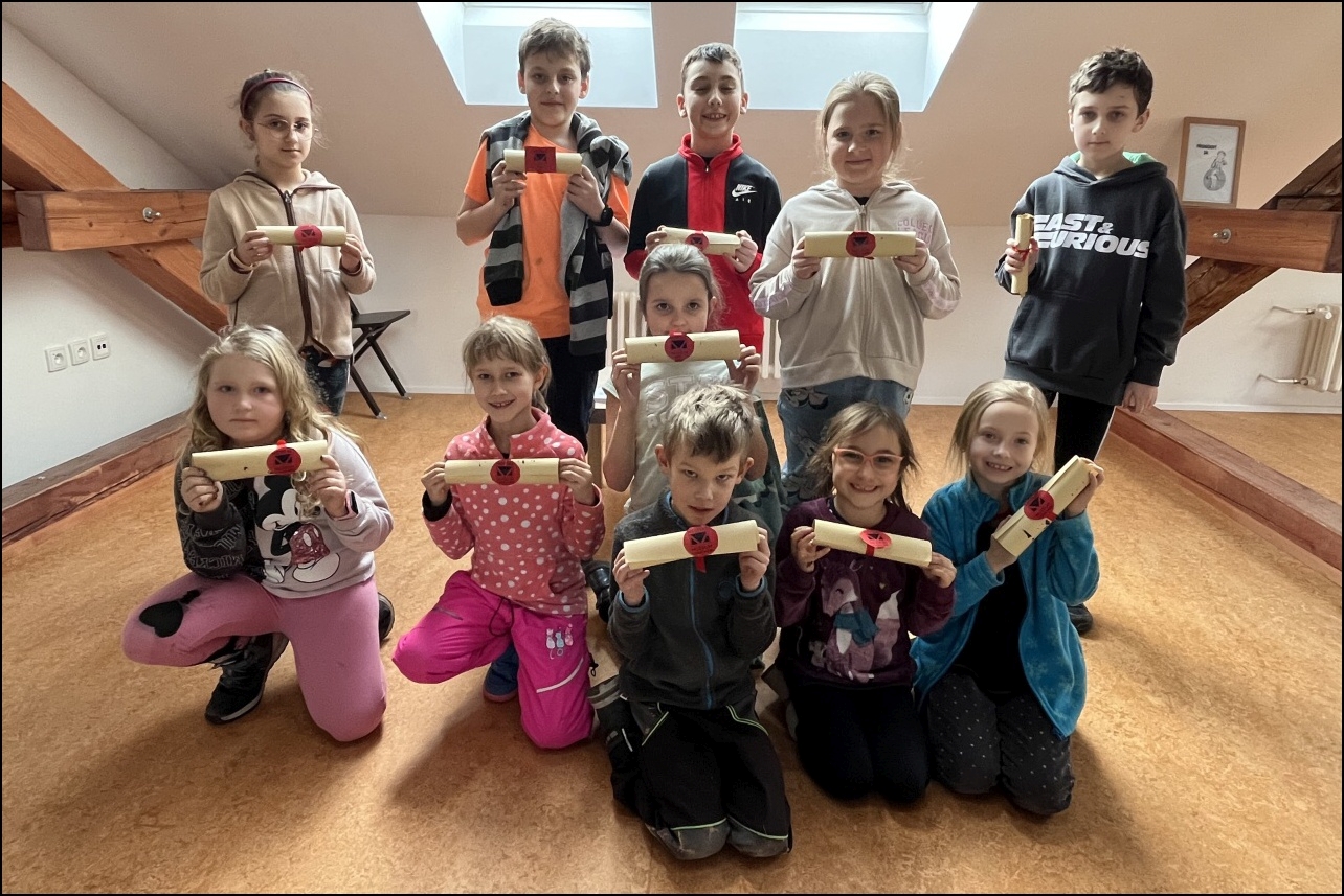 Po dopoledním tvoření jsme se přesunuli na oběd do jídelny v Holohlavech a posilněni dobrým jídlem jsme vyrazili za poznáním do muzea v Jaroměři. Čekal nás zajímavý edukační program o historii písma, kde jsme si vyzkoušeli psaní klínovým písmem a také psaní brkem. Nechybělo ani drobné „umělecké“ zašpinění tuší, ale nakonec jsme všichni úspěšně prošli zkouškou psaní! Každý jsme dostali jakýsi „pergament“, na kterém se objevovali i záludné otázky pro zvídavé hlavy. Jako bonus jsme si ještě prohlédli výstavu hraček, která v muzeu právě probíhala.