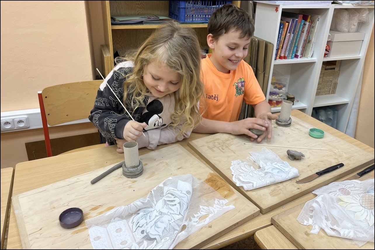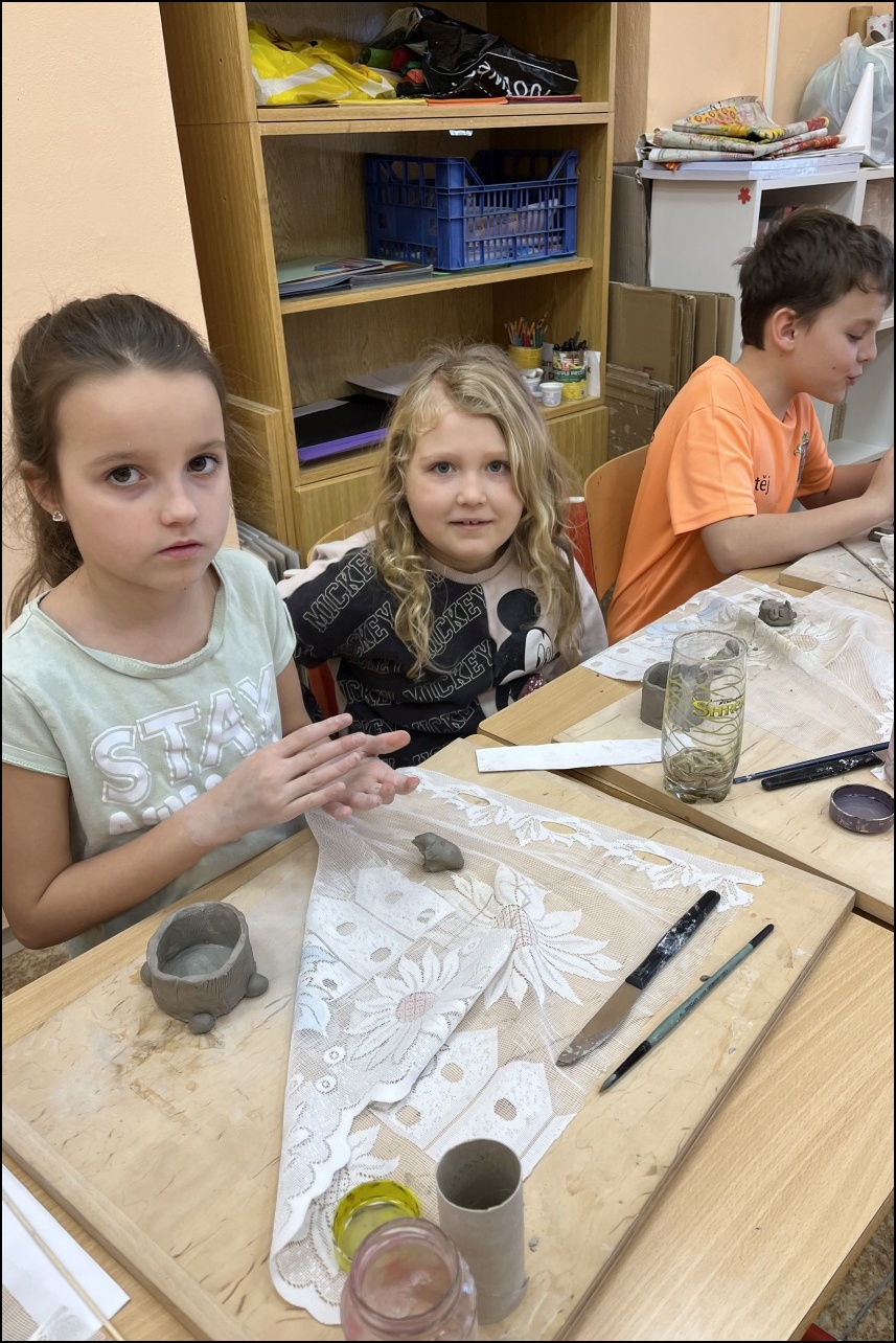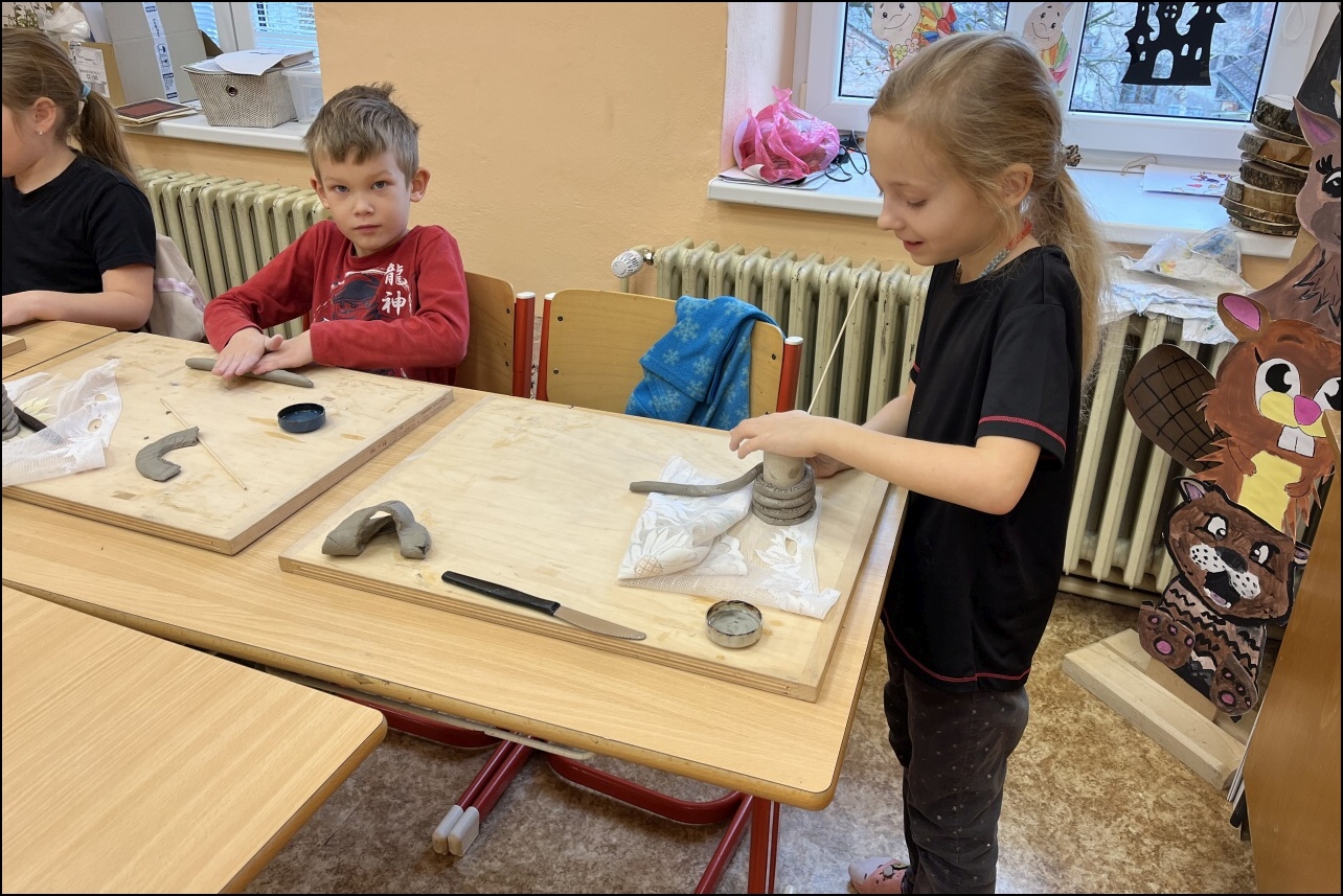 S dětmi jsme se sešli v 8:00 v DDM kde jsme pro ně měli připravené aktivity spojené s tvořením z hlíny. Pro mnoho dětí to byla úplně první zkušenost, a tak jsme si nejprve ukázali základní techniky. Na dětech bylo vidět nadšení. Nejvíce je bavilo, když se mohly „patlat“ v hlíně či s ní házet o desku. Prvním úkolem bylo vytvořit si stojánek na tužky ve tvaru hada. Vzniklo mnoho originálních hadů, někteří byli veselí, jiní strašidelní, ale všechny spojuje jedinečná fantazie malých tvůrců. Poté následovala výroba mističek ve tvaru zvířátek, kdy si každý vytvořil svého malého „společníka“.
