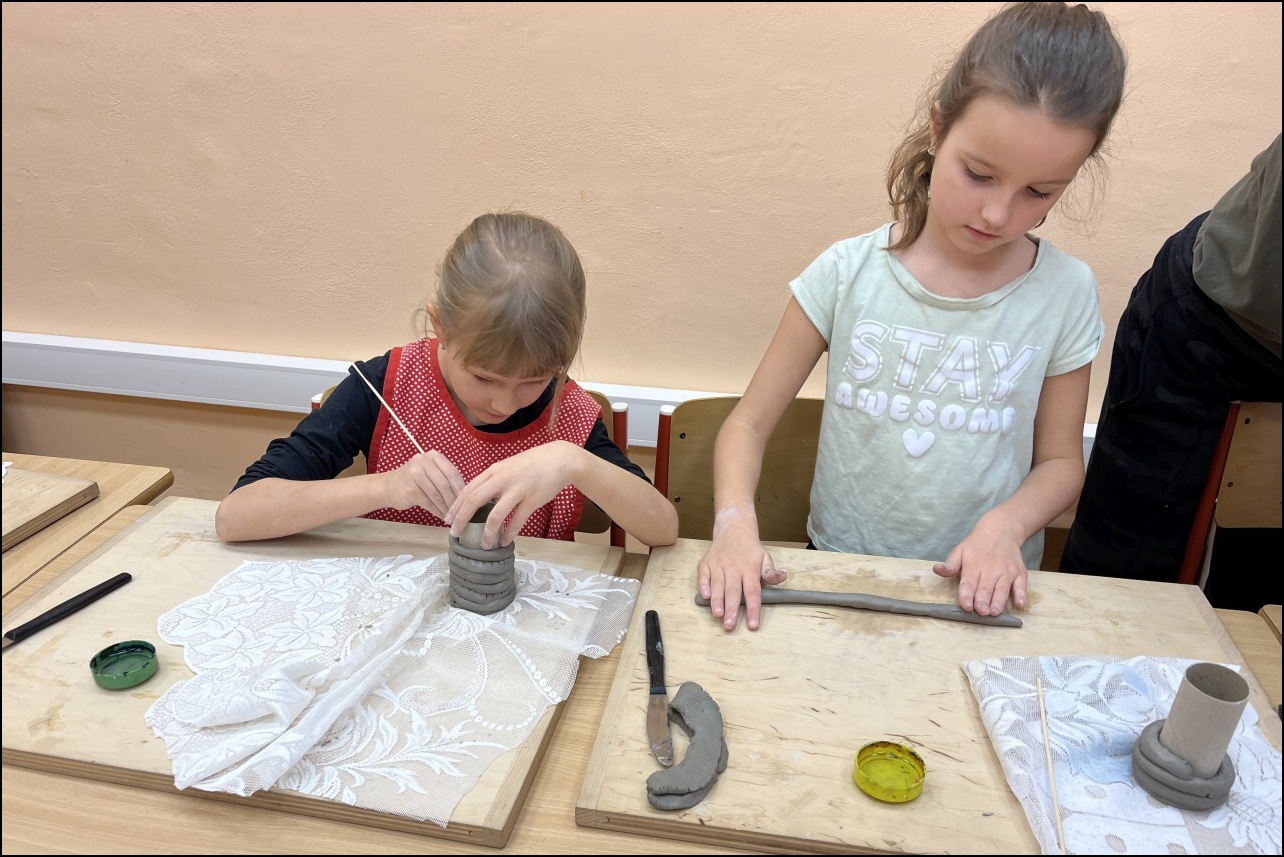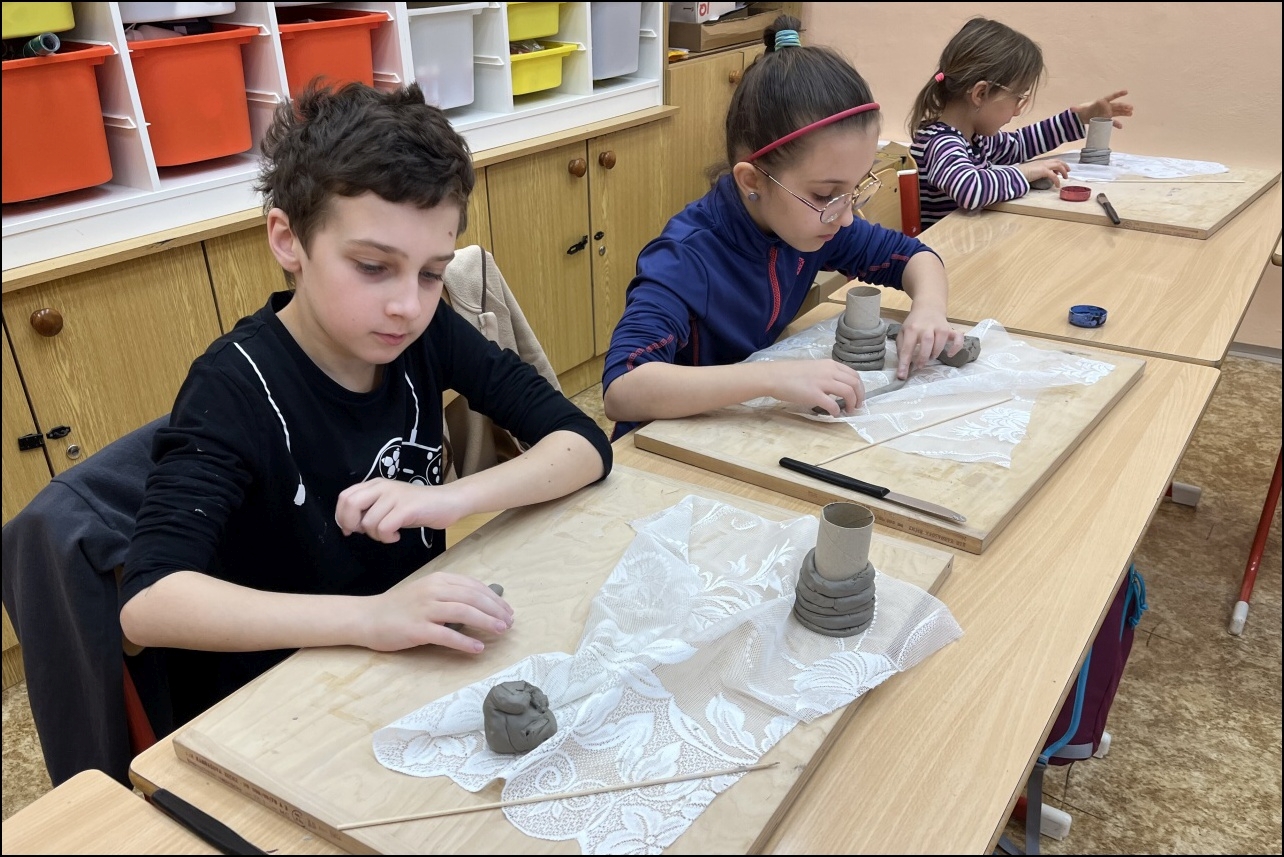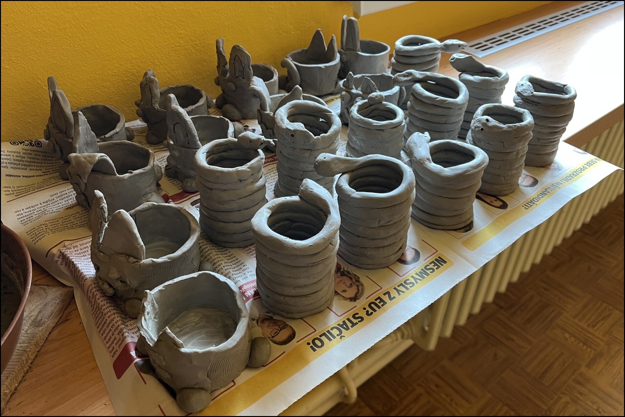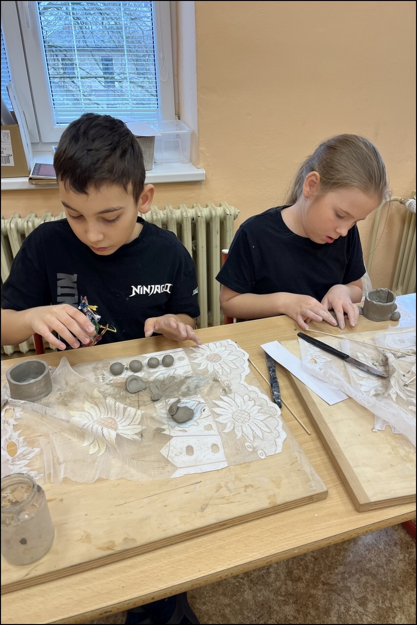 S dětmi jsme se sešli v 8:00 v DDM kde jsme pro ně měli připravené aktivity spojené s tvořením z hlíny. Pro mnoho dětí to byla úplně první zkušenost, a tak jsme si nejprve ukázali základní techniky. Na dětech bylo vidět nadšení. Nejvíce je bavilo, když se mohly „patlat“ v hlíně či s ní házet o desku. Prvním úkolem bylo vytvořit si stojánek na tužky ve tvaru hada. Vzniklo mnoho originálních hadů, někteří byli veselí, jiní strašidelní, ale všechny spojuje jedinečná fantazie malých tvůrců. Poté následovala výroba mističek ve tvaru zvířátek, kdy si každý vytvořil svého malého „společníka“.