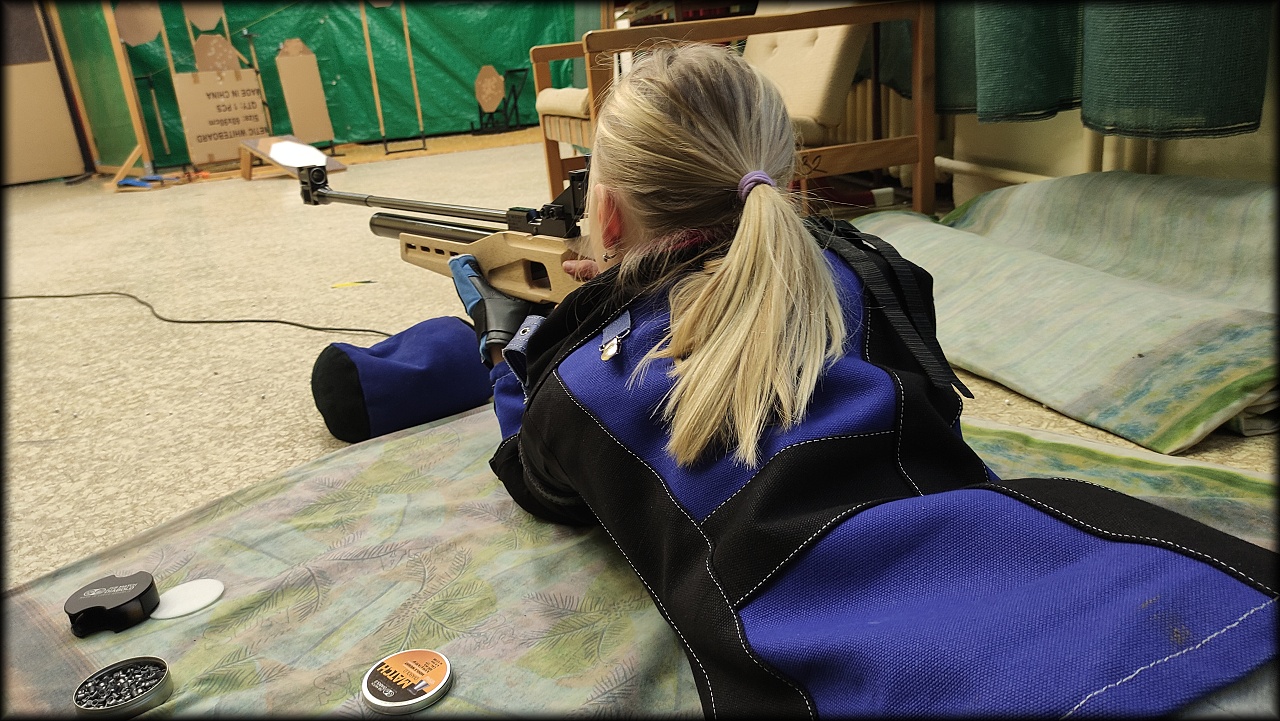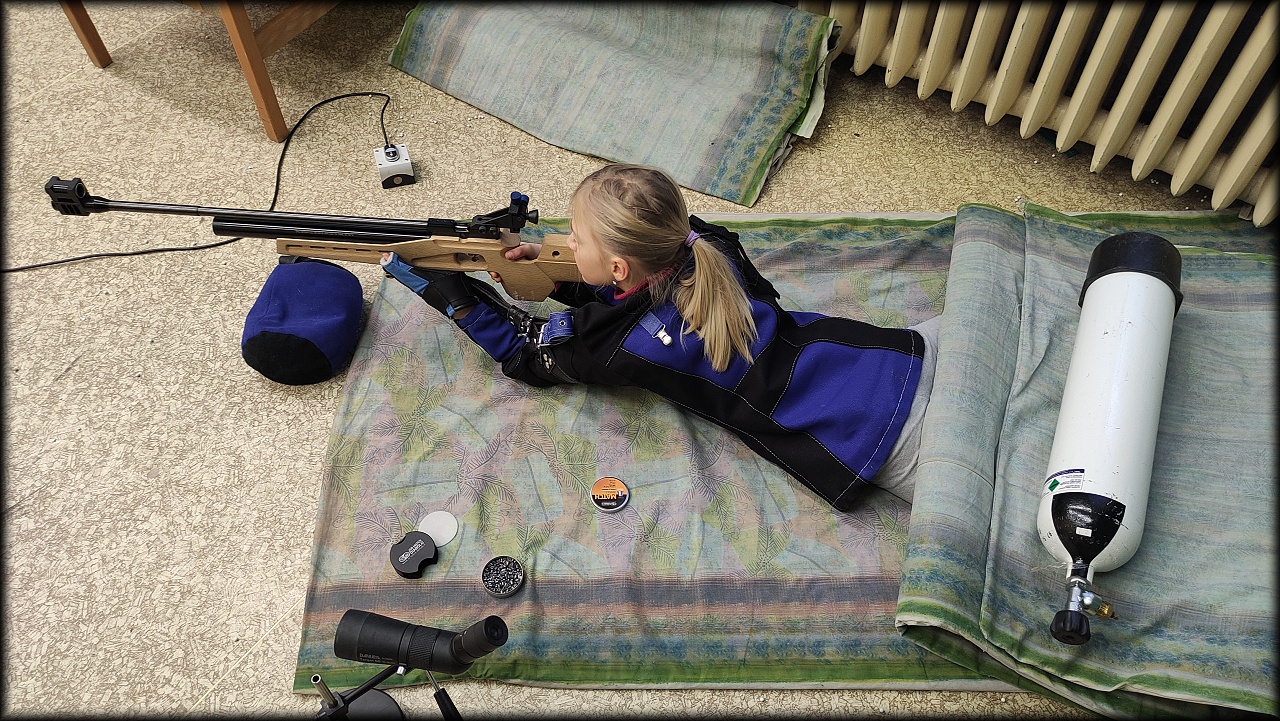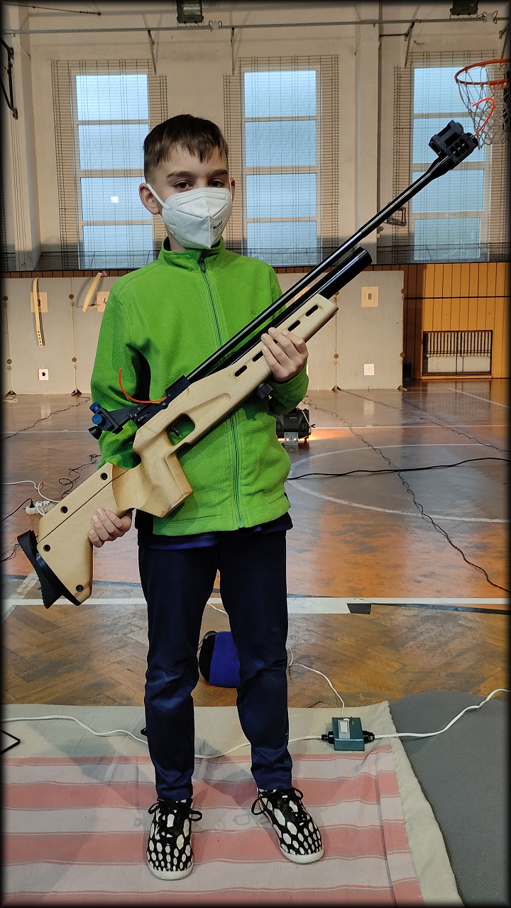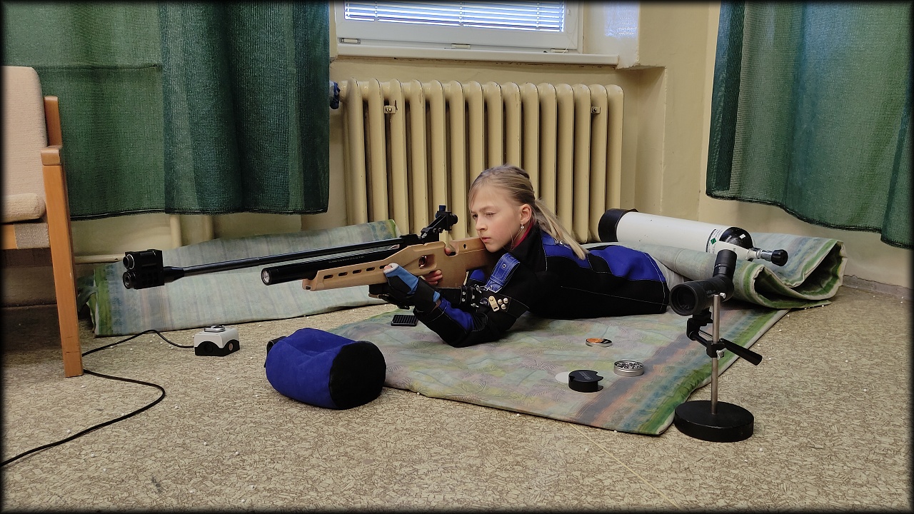 Vedoucí kroužku a trenér Lukáš Tichý již připravuje talentované mladší střelce. Poprvé si střelbu vyzkoušela i velmi šikovná Šárka Žáková. Děti se takto zatížením učí zafixovat správnou pozici při střelbě.