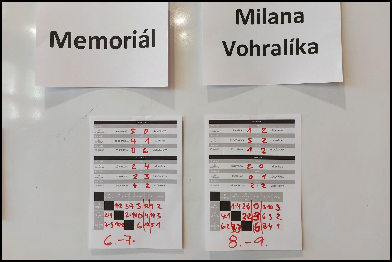 V každé kategorii se družstva utkala systémem každý s každým, dvoukolově. Vyhlášení proběhlo určením absolutního vítěze sloučením výsledků z obou kategorií. Naše mladší kategorie po vysledcích se ZŠ Úprkova 5:0, 4:2 a se ZŠ Gočárova 1:4, 2:3 obsadila 2. místo. Starši kluci skončili po výsledcích se ZŠ Úprkova 1:2, 0:2 a se ZŠ Gočárova 2:5, 0:1 na 3. příčce. Celkově pak naši kluci v turnaji obsadili 2. místo.