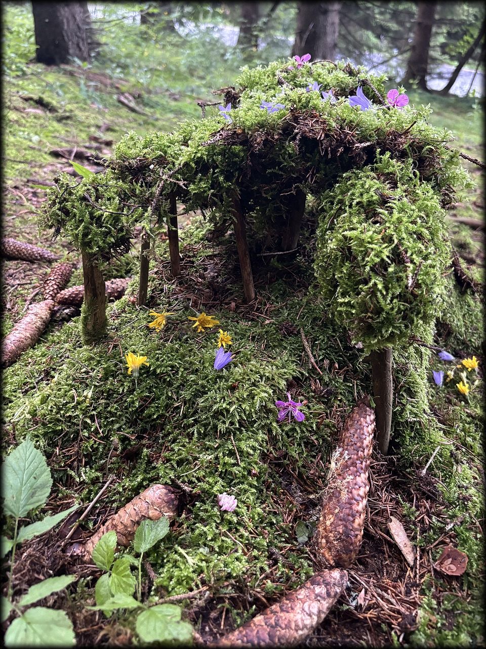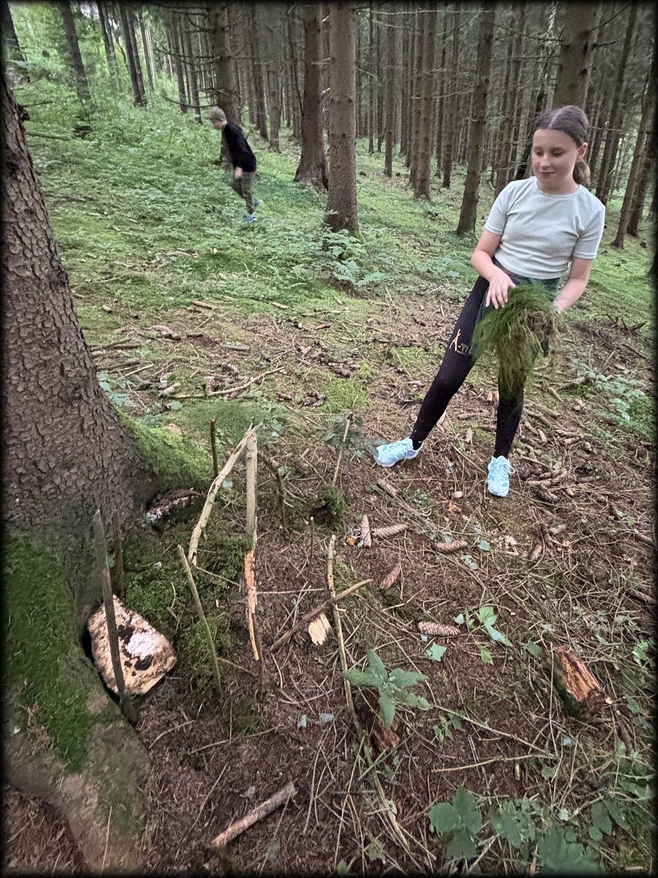 PONDĚLÍ: Dopoledne jsme měli vyhrazenou na cestu a ubytování, odpoledne už jsme hráli v krásném prostředí našeho sportovního areálu míčové hry (fotbal a přehazovanou). Večer jsme stavěli domečky pro lesní skřítky.