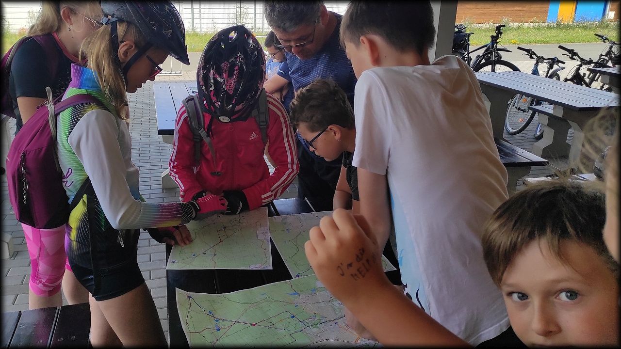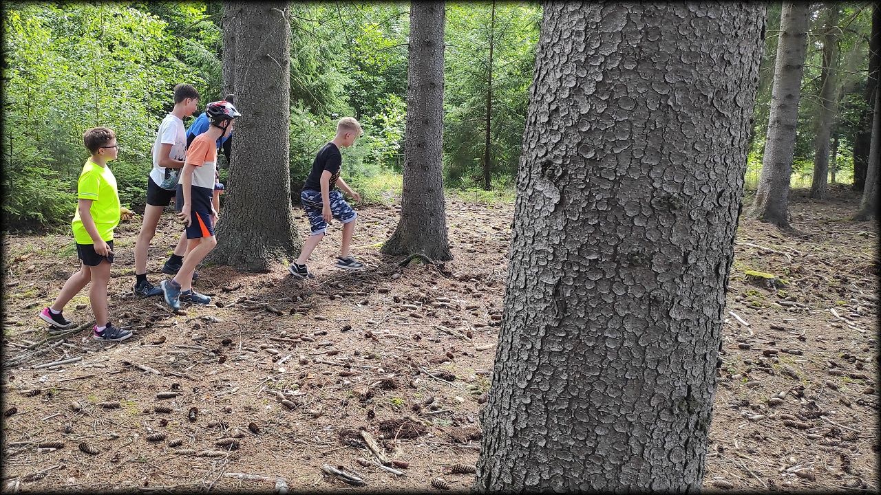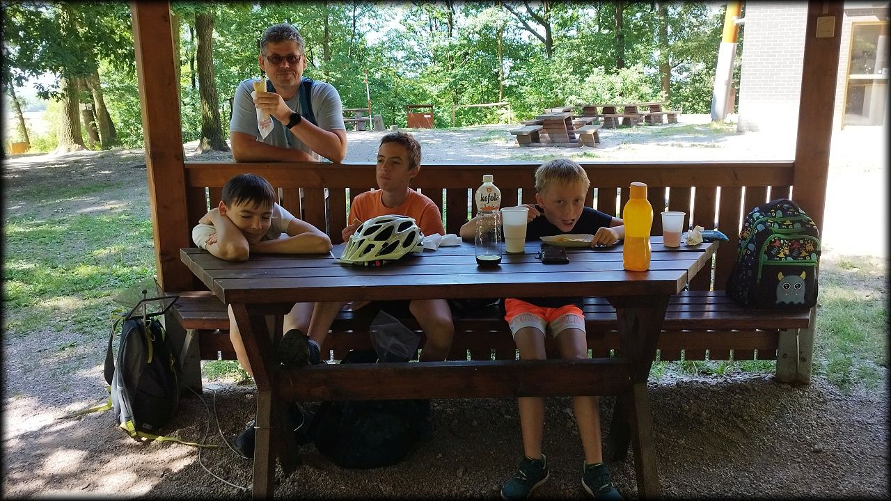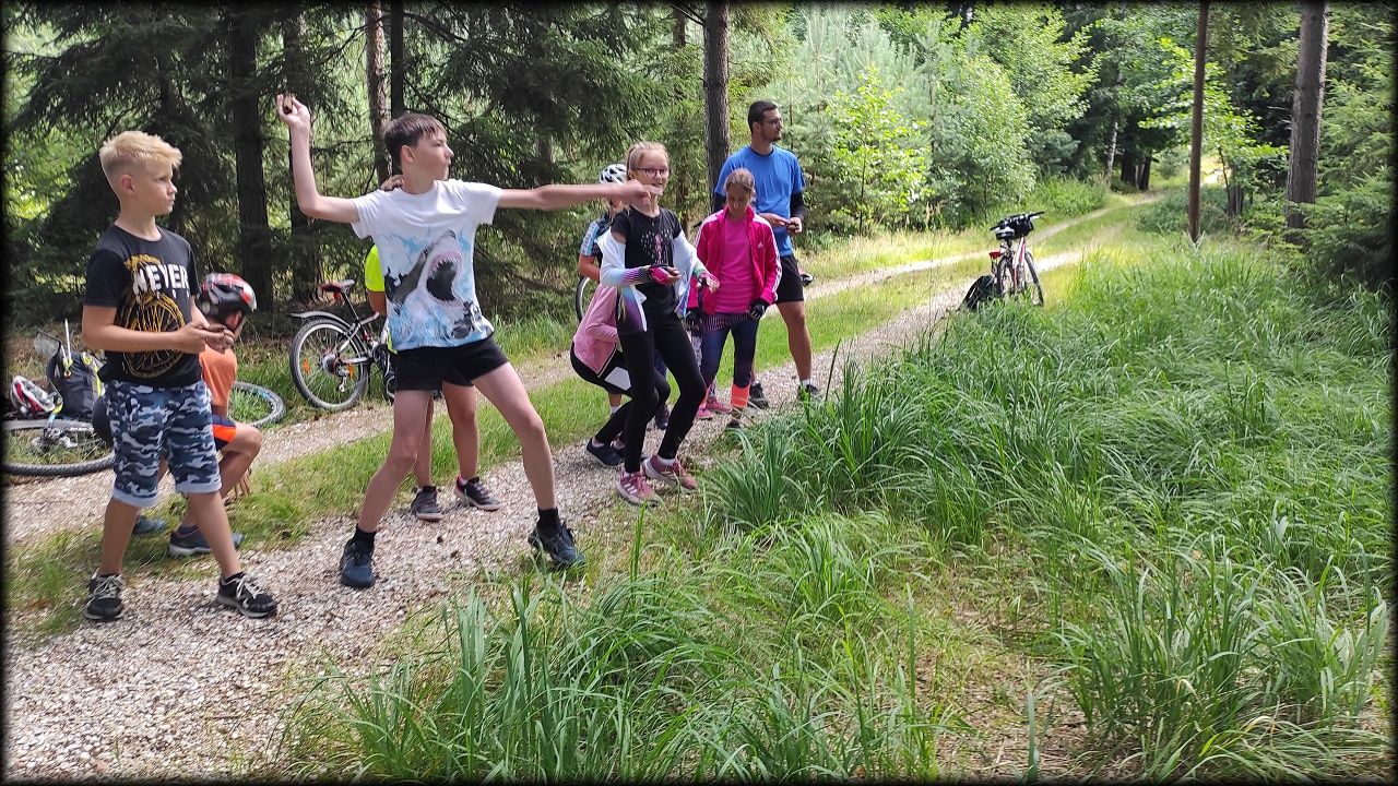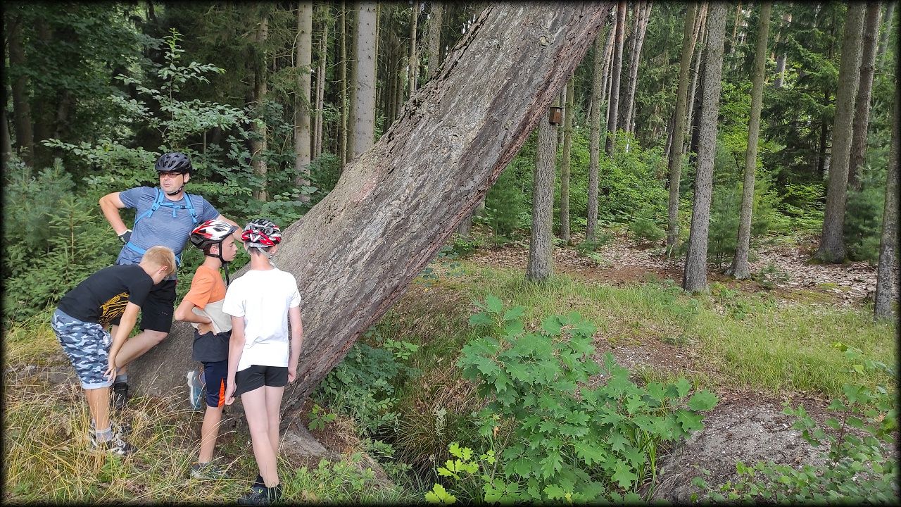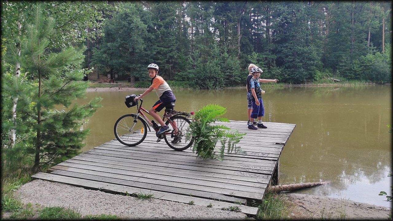 ČTVRTEK: Asi zabloudíme! Dnes trasu přes průjezdné body vybírají samy děti. Tak jedeme vzadu na konci pelotonu podle nich. Občas děti samy zastaví a ubezpečí se podle mapy, zda jedeme správně. Jen jednou, na začátku, jsme se vraceli. U rybníku Kříž zjišťujeme, jak vypadá budka pro netopýry a vidíme douglasku, u nás vzácný severoamerický strom. Je to ještě stromeček, má jen 100 let a 35 metrů. Pak jedem dál pohladit si divoká malá prasátka a daňky. Jeleny vidíme jen zdálky. Přijíždíme na občerstvení na Mazurových chalupách. Celý den hrajeme hlavolamy ze sirek, i přes mírné protesty, že jsou prázdniny, musí děti přemýšlet. A přes Výskyt hurá na oběd. Když se řekne dětem toto slovo, jízda se zrychluje. Dnes je přírodní kuřecí plátek se sýrem a rajčaty a hranolky. Cestu domů přes Malšovice už děti znají samy. Pochvala pro děti za práci s mapou!