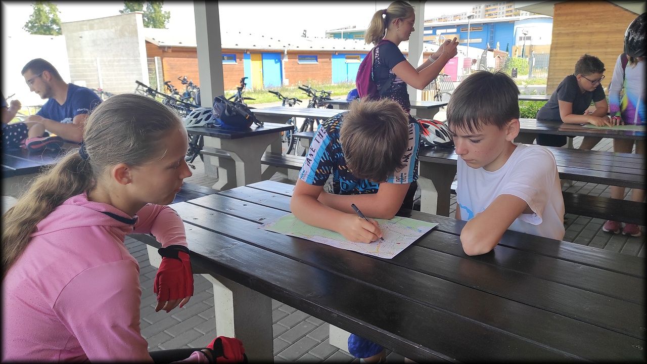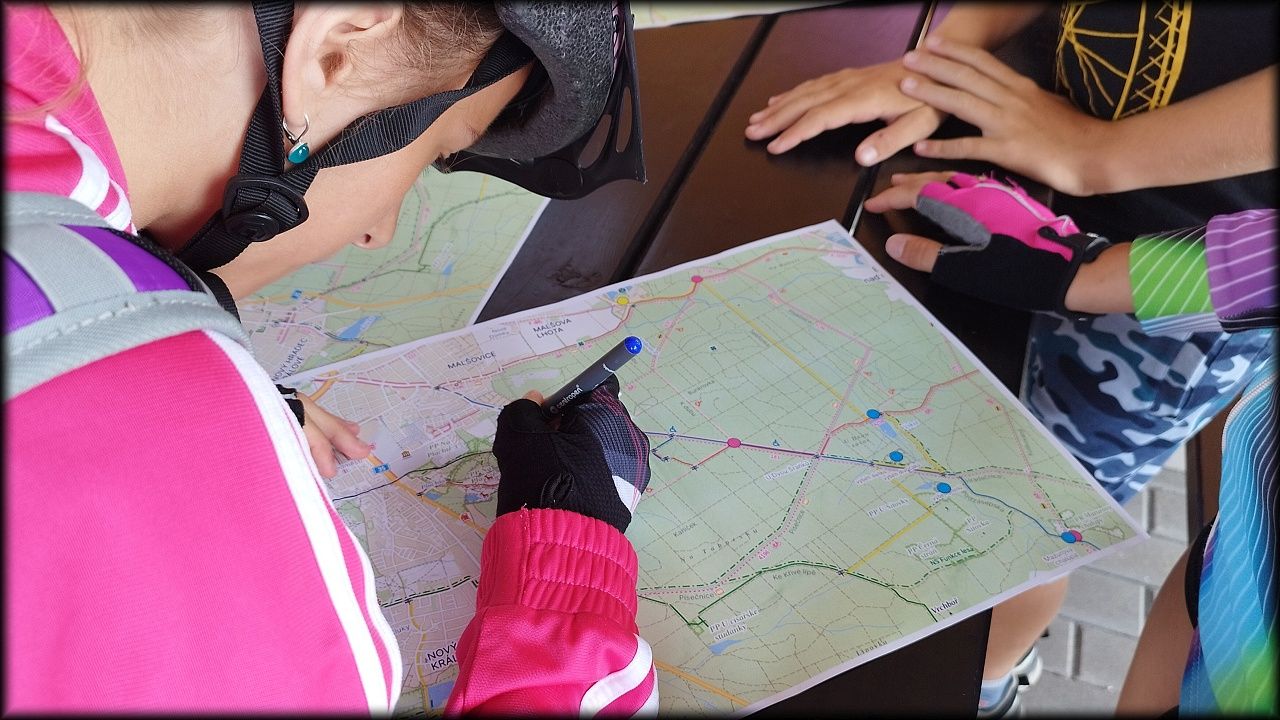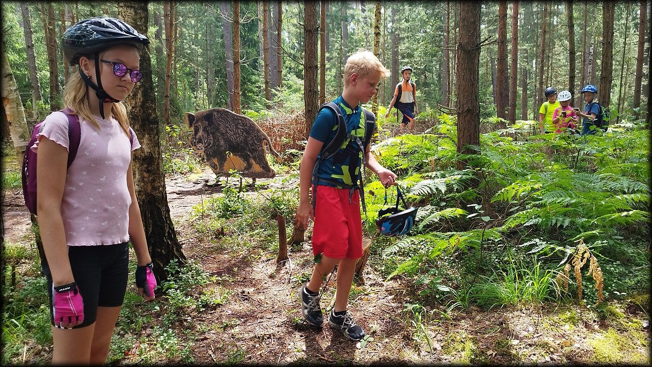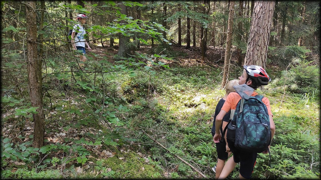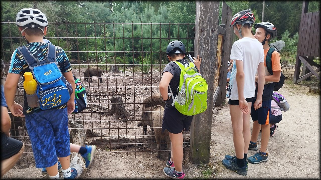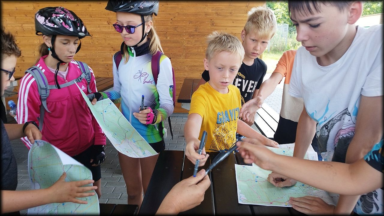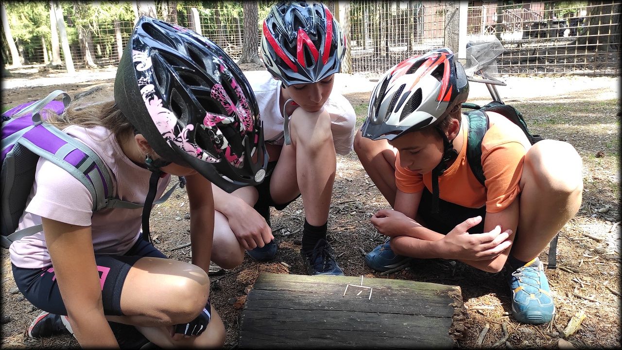 ČTVRTEK: Asi zabloudíme! Dnes trasu přes průjezdné body vybírají samy děti. Tak jedeme vzadu na konci pelotonu podle nich. Občas děti samy zastaví a ubezpečí se podle mapy, zda jedeme správně. Jen jednou, na začátku, jsme se vraceli. U rybníku Kříž zjišťujeme, jak vypadá budka pro netopýry a vidíme douglasku, u nás vzácný severoamerický strom. Je to ještě stromeček, má jen 100 let a 35 metrů. Pak jedem dál pohladit si divoká malá prasátka a daňky. Jeleny vidíme jen zdálky. Přijíždíme na občerstvení na Mazurových chalupách. Celý den hrajeme hlavolamy ze sirek, i přes mírné protesty, že jsou prázdniny, musí děti přemýšlet. A přes Výskyt hurá na oběd. Když se řekne dětem toto slovo, jízda se zrychluje. Dnes je přírodní kuřecí plátek se sýrem a rajčaty a hranolky. Cestu domů přes Malšovice už děti znají samy. Pochvala pro děti za práci s mapou!