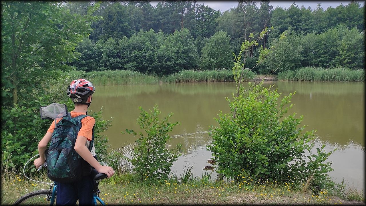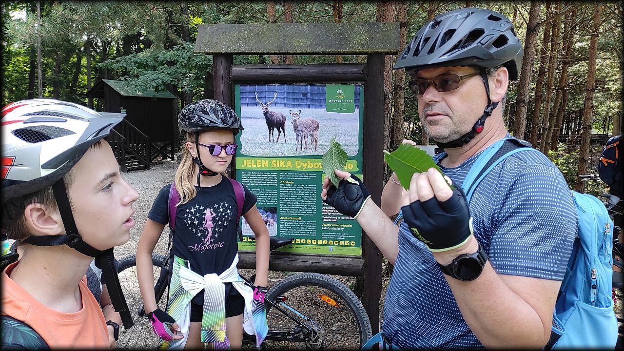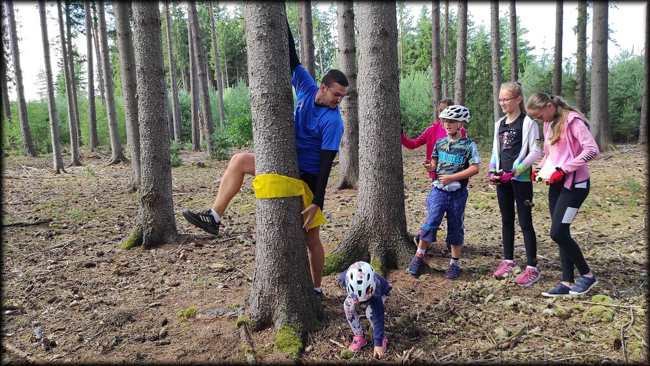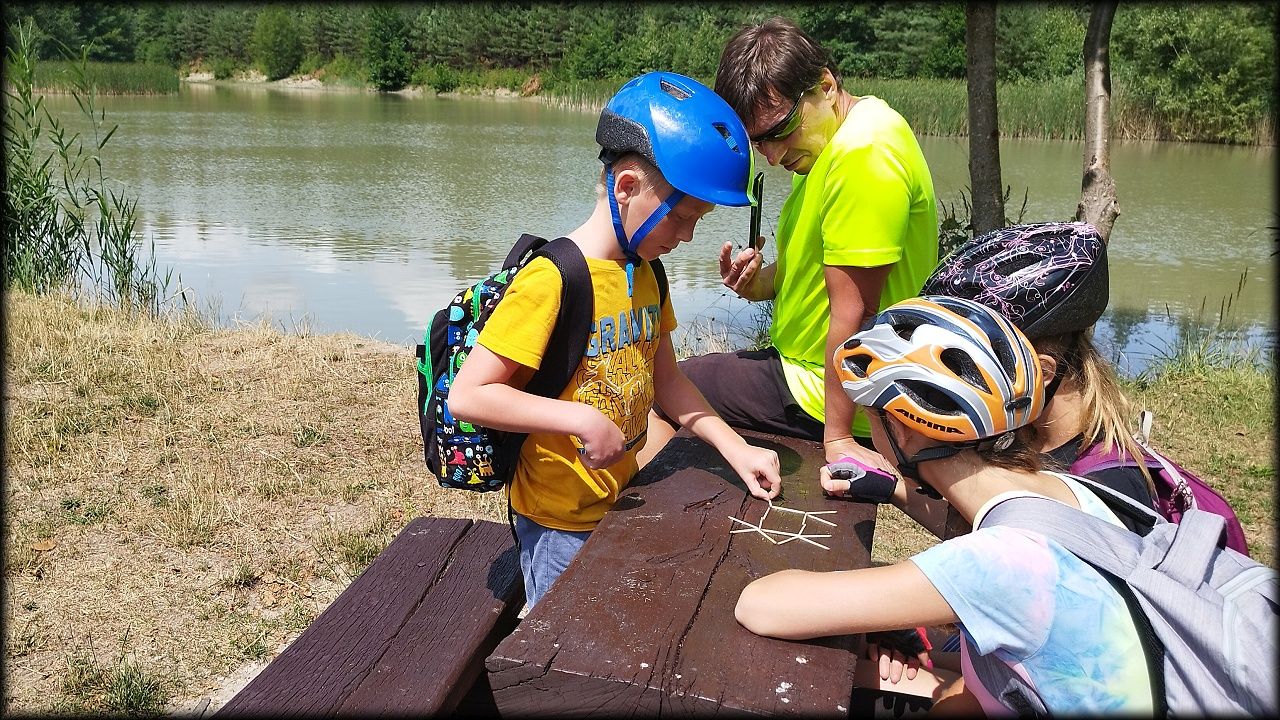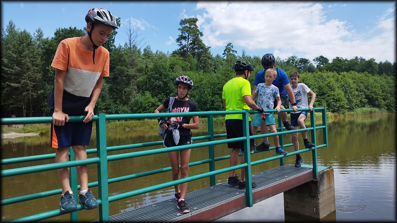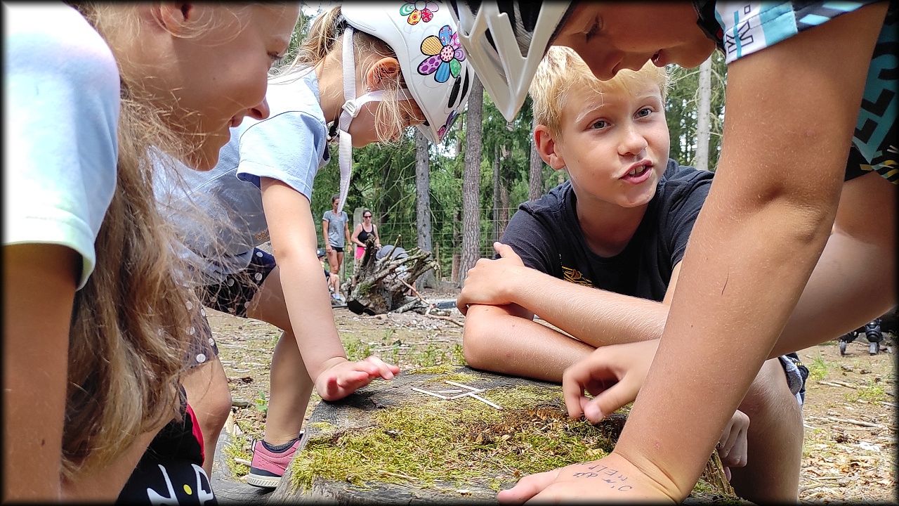 ČTVRTEK: Asi zabloudíme! Dnes trasu přes průjezdné body vybírají samy děti. Tak jedeme vzadu na konci pelotonu podle nich. Občas děti samy zastaví a ubezpečí se podle mapy, zda jedeme správně. Jen jednou, na začátku, jsme se vraceli. U rybníku Kříž zjišťujeme, jak vypadá budka pro netopýry a vidíme douglasku, u nás vzácný severoamerický strom. Je to ještě stromeček, má jen 100 let a 35 metrů. Pak jedem dál pohladit si divoká malá prasátka a daňky. Jeleny vidíme jen zdálky. Přijíždíme na občerstvení na Mazurových chalupách. Celý den hrajeme hlavolamy ze sirek, i přes mírné protesty, že jsou prázdniny, musí děti přemýšlet. A přes Výskyt hurá na oběd. Když se řekne dětem toto slovo, jízda se zrychluje. Dnes je přírodní kuřecí plátek se sýrem a rajčaty a hranolky. Cestu domů přes Malšovice už děti znají samy. Pochvala pro děti za práci s mapou!
