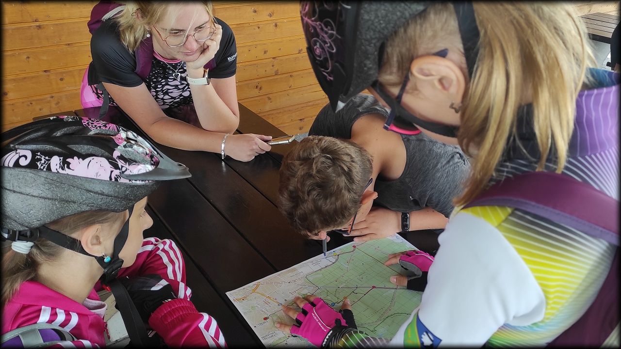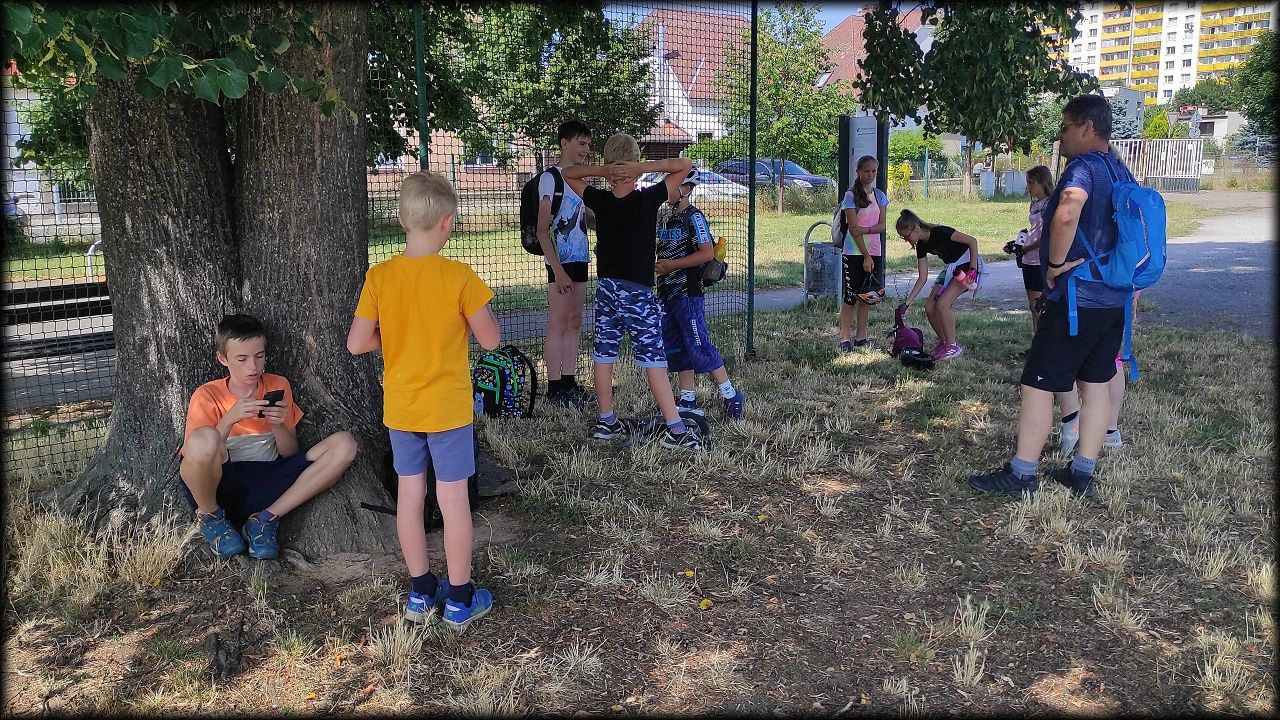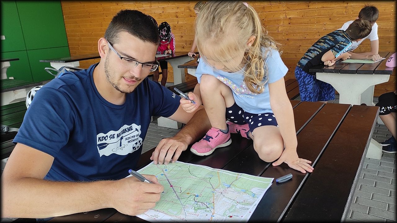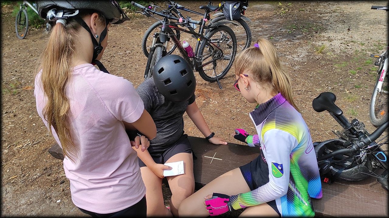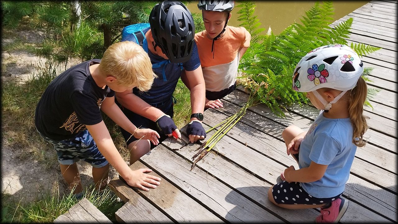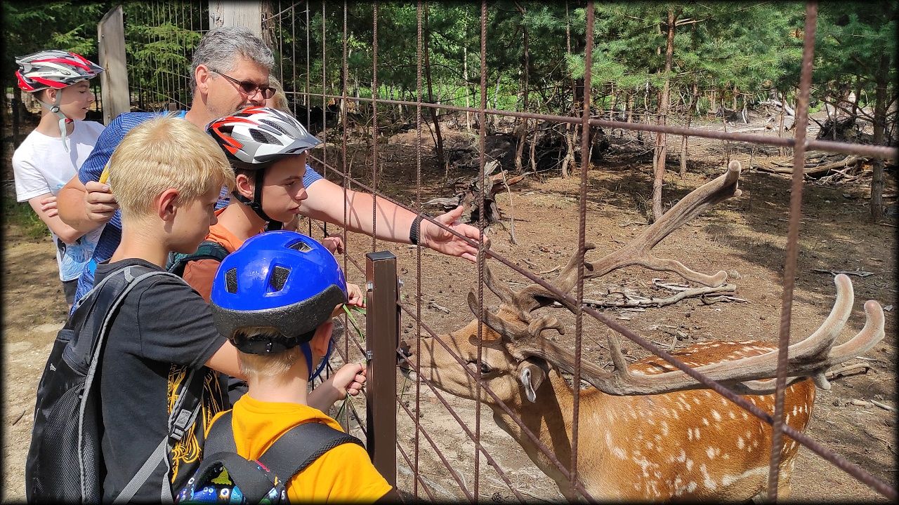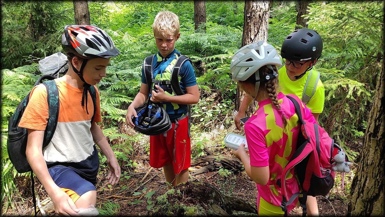 ČTVRTEK: Asi zabloudíme! Dnes trasu přes průjezdné body vybírají samy děti. Tak jedeme vzadu na konci pelotonu podle nich. Občas děti samy zastaví a ubezpečí se podle mapy, zda jedeme správně. Jen jednou, na začátku, jsme se vraceli. U rybníku Kříž zjišťujeme, jak vypadá budka pro netopýry a vidíme douglasku, u nás vzácný severoamerický strom. Je to ještě stromeček, má jen 100 let a 35 metrů. Pak jedem dál pohladit si divoká malá prasátka a daňky. Jeleny vidíme jen zdálky. Přijíždíme na občerstvení na Mazurových chalupách. Celý den hrajeme hlavolamy ze sirek, i přes mírné protesty, že jsou prázdniny, musí děti přemýšlet. A přes Výskyt hurá na oběd. Když se řekne dětem toto slovo, jízda se zrychluje. Dnes je přírodní kuřecí plátek se sýrem a rajčaty a hranolky. Cestu domů přes Malšovice už děti znají samy. Pochvala pro děti za práci s mapou!