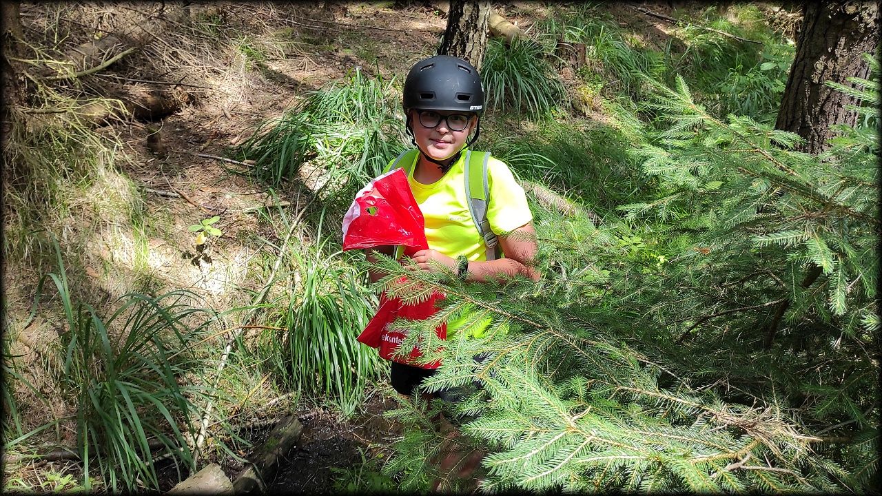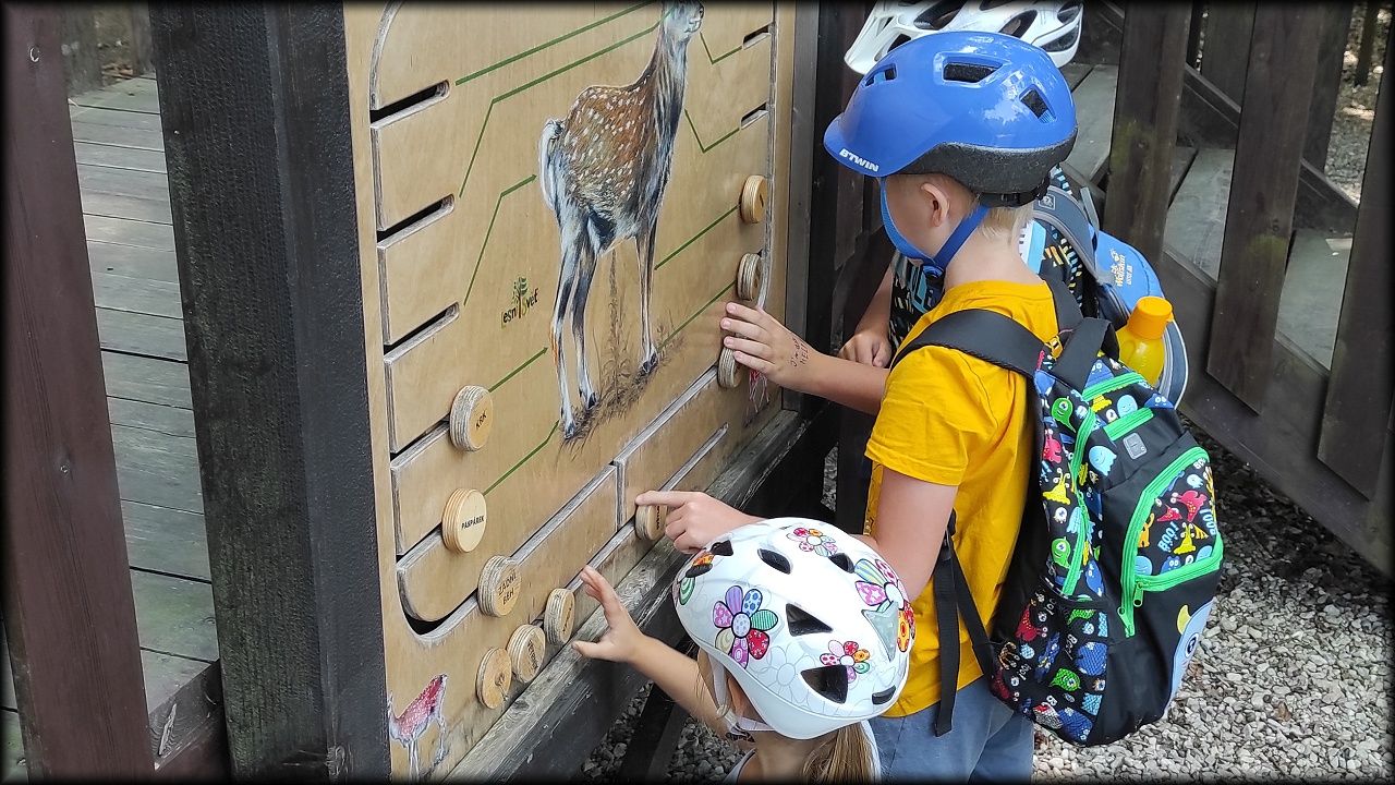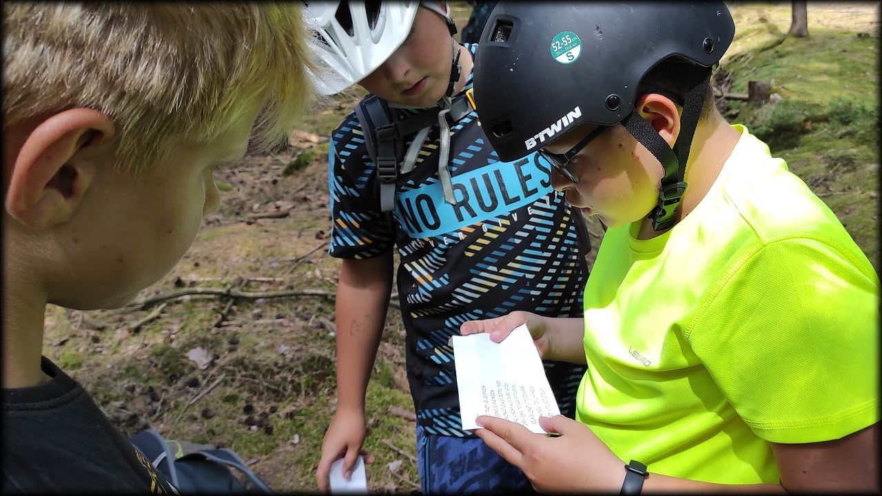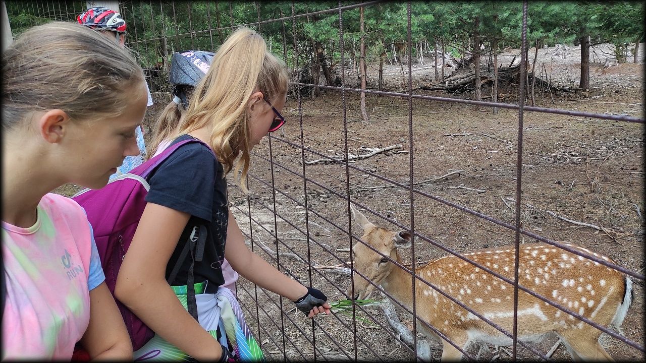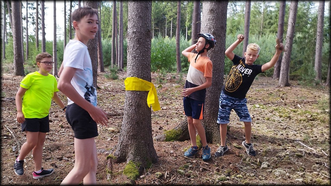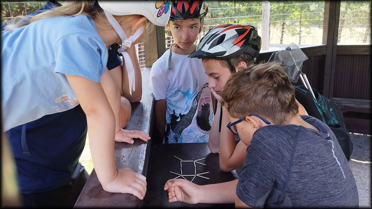 ČTVRTEK: Asi zabloudíme! Dnes trasu přes průjezdné body vybírají samy děti. Tak jedeme vzadu na konci pelotonu podle nich. Občas děti samy zastaví a ubezpečí se podle mapy, zda jedeme správně. Jen jednou, na začátku, jsme se vraceli. U rybníku Kříž zjišťujeme, jak vypadá budka pro netopýry a vidíme douglasku, u nás vzácný severoamerický strom. Je to ještě stromeček, má jen 100 let a 35 metrů. Pak jedem dál pohladit si divoká malá prasátka a daňky. Jeleny vidíme jen zdálky. Přijíždíme na občerstvení na Mazurových chalupách. Celý den hrajeme hlavolamy ze sirek, i přes mírné protesty, že jsou prázdniny, musí děti přemýšlet. A přes Výskyt hurá na oběd. Když se řekne dětem toto slovo, jízda se zrychluje. Dnes je přírodní kuřecí plátek se sýrem a rajčaty a hranolky. Cestu domů přes Malšovice už děti znají samy. Pochvala pro děti za práci s mapou!