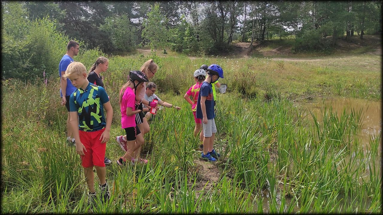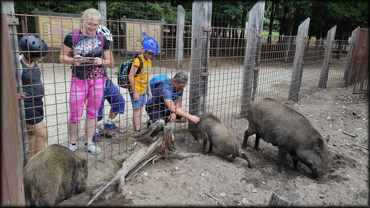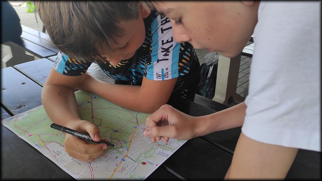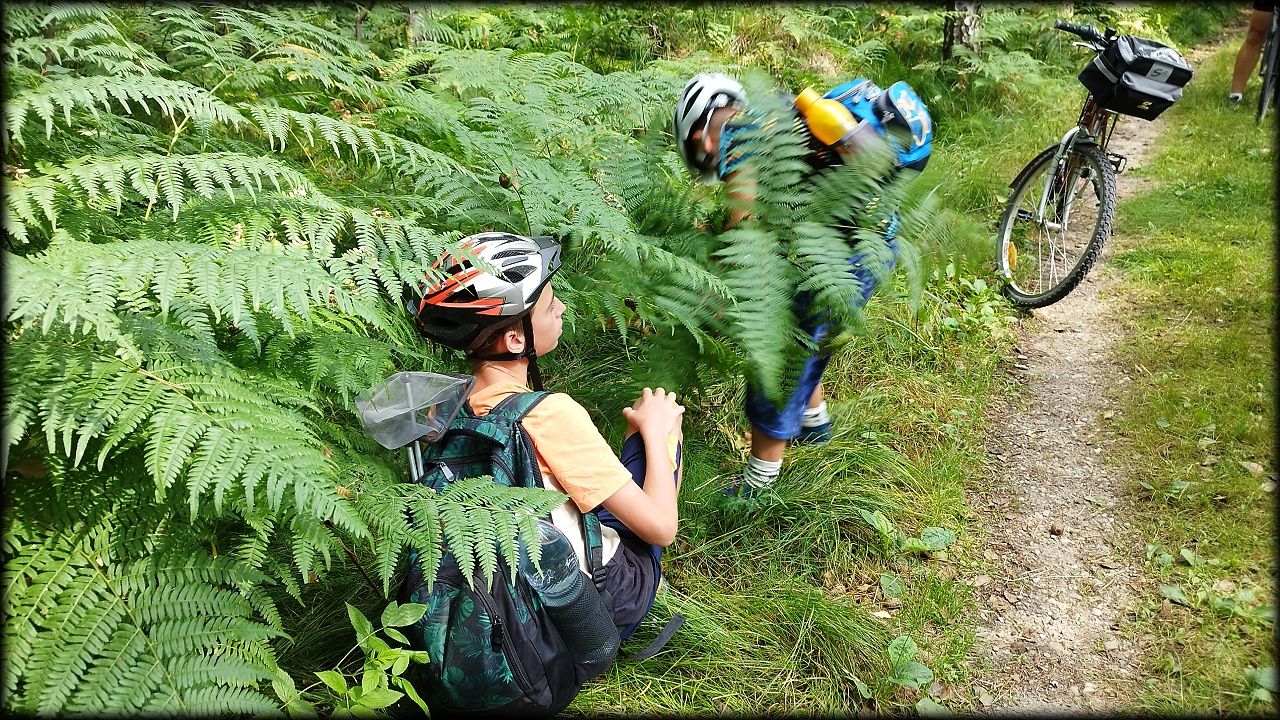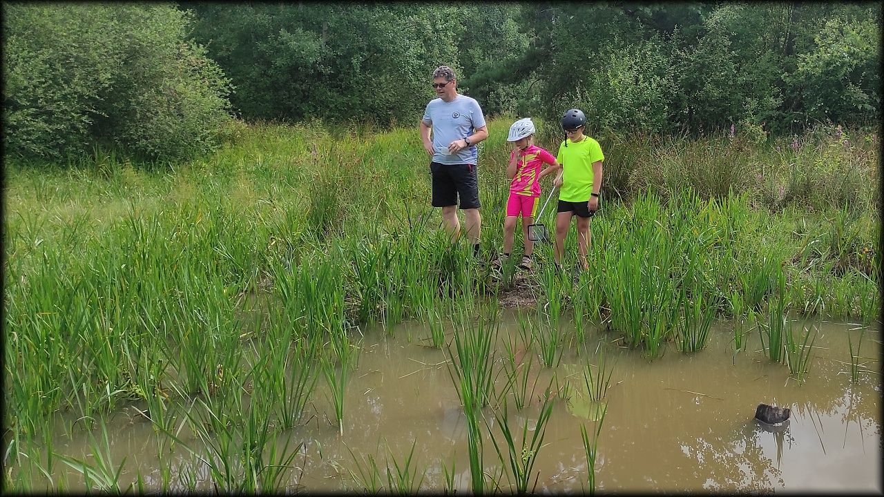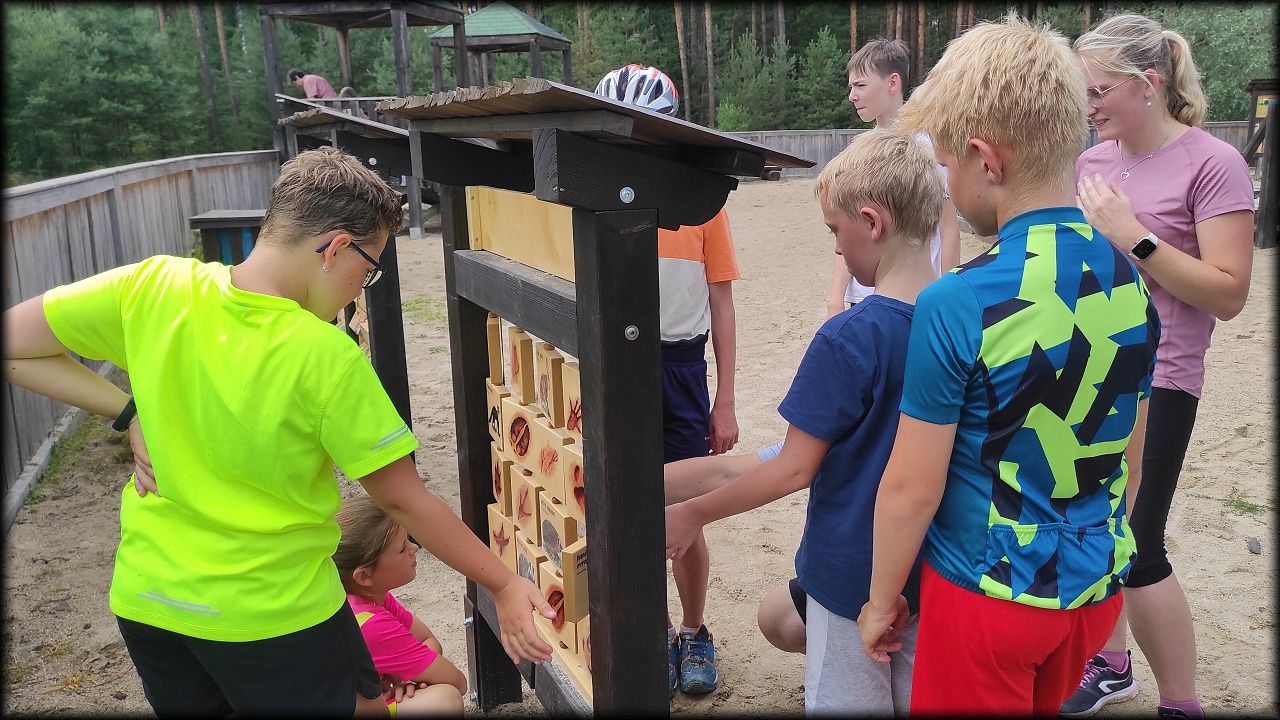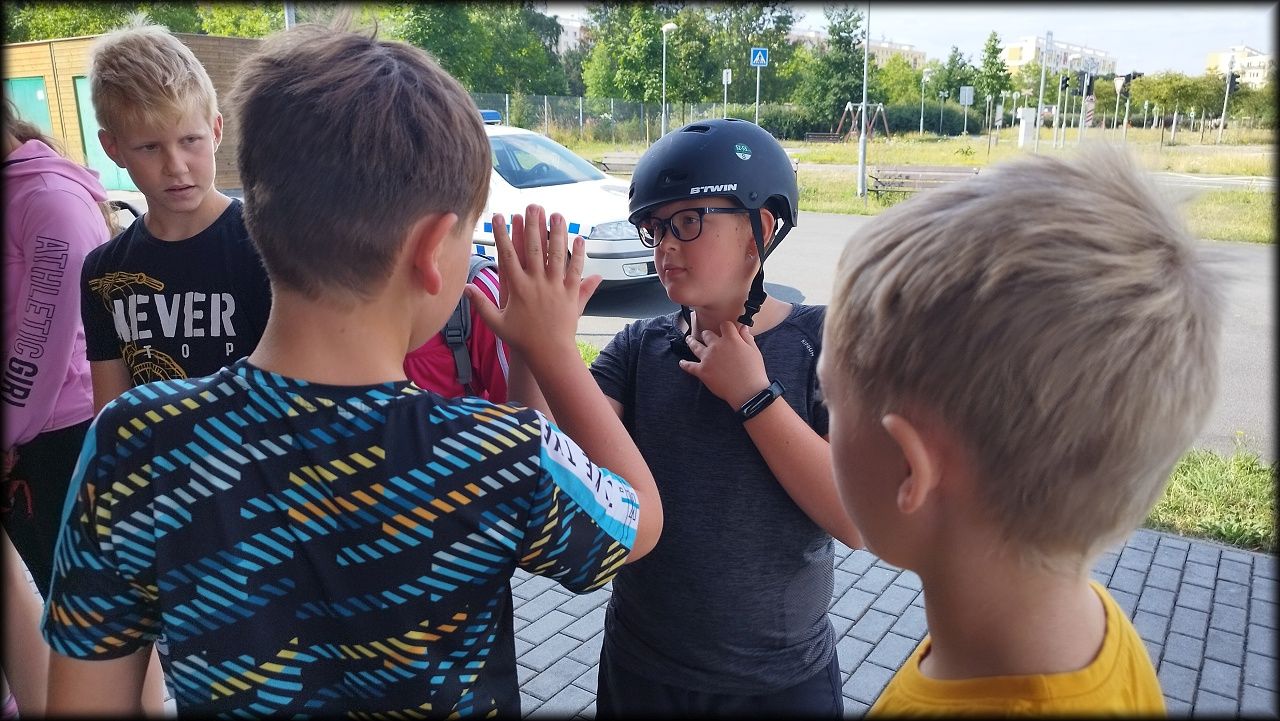 ČTVRTEK: Asi zabloudíme! Dnes trasu přes průjezdné body vybírají samy děti. Tak jedeme vzadu na konci pelotonu podle nich. Občas děti samy zastaví a ubezpečí se podle mapy, zda jedeme správně. Jen jednou, na začátku, jsme se vraceli. U rybníku Kříž zjišťujeme, jak vypadá budka pro netopýry a vidíme douglasku, u nás vzácný severoamerický strom. Je to ještě stromeček, má jen 100 let a 35 metrů. Pak jedem dál pohladit si divoká malá prasátka a daňky. Jeleny vidíme jen zdálky. Přijíždíme na občerstvení na Mazurových chalupách. Celý den hrajeme hlavolamy ze sirek, i přes mírné protesty, že jsou prázdniny, musí děti přemýšlet. A přes Výskyt hurá na oběd. Když se řekne dětem toto slovo, jízda se zrychluje. Dnes je přírodní kuřecí plátek se sýrem a rajčaty a hranolky. Cestu domů přes Malšovice už děti znají samy. Pochvala pro děti za práci s mapou!