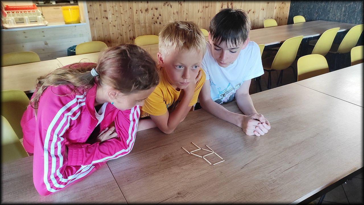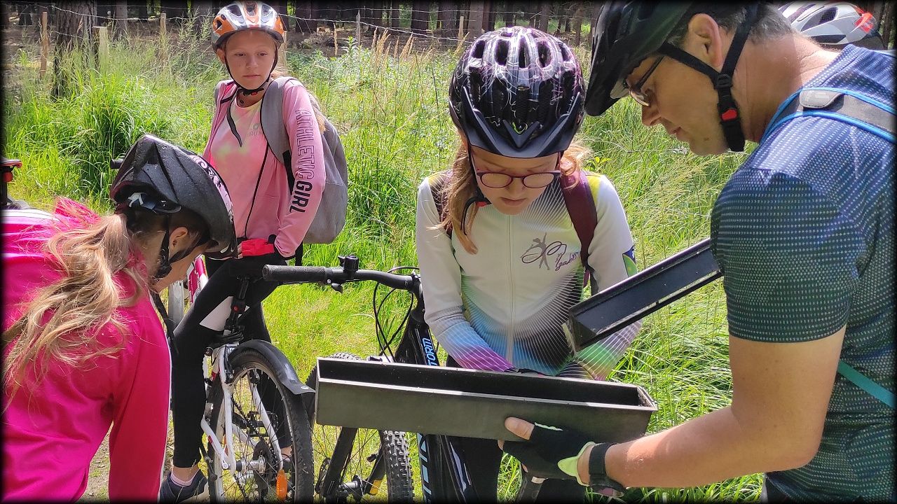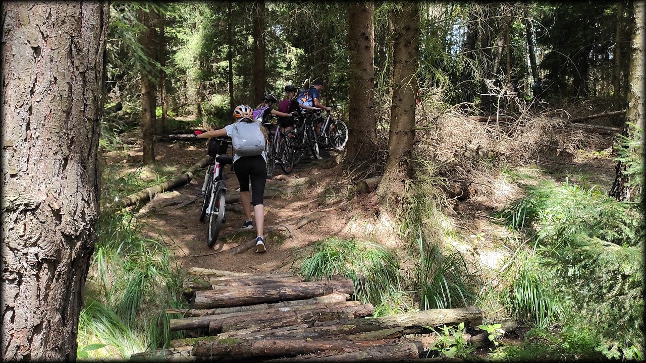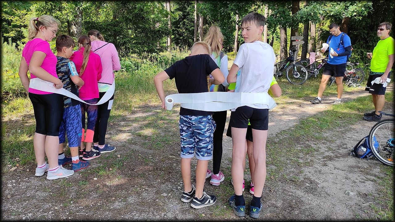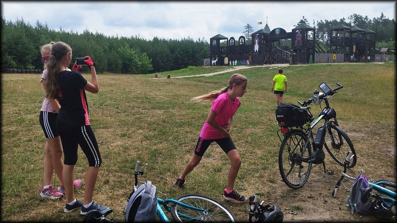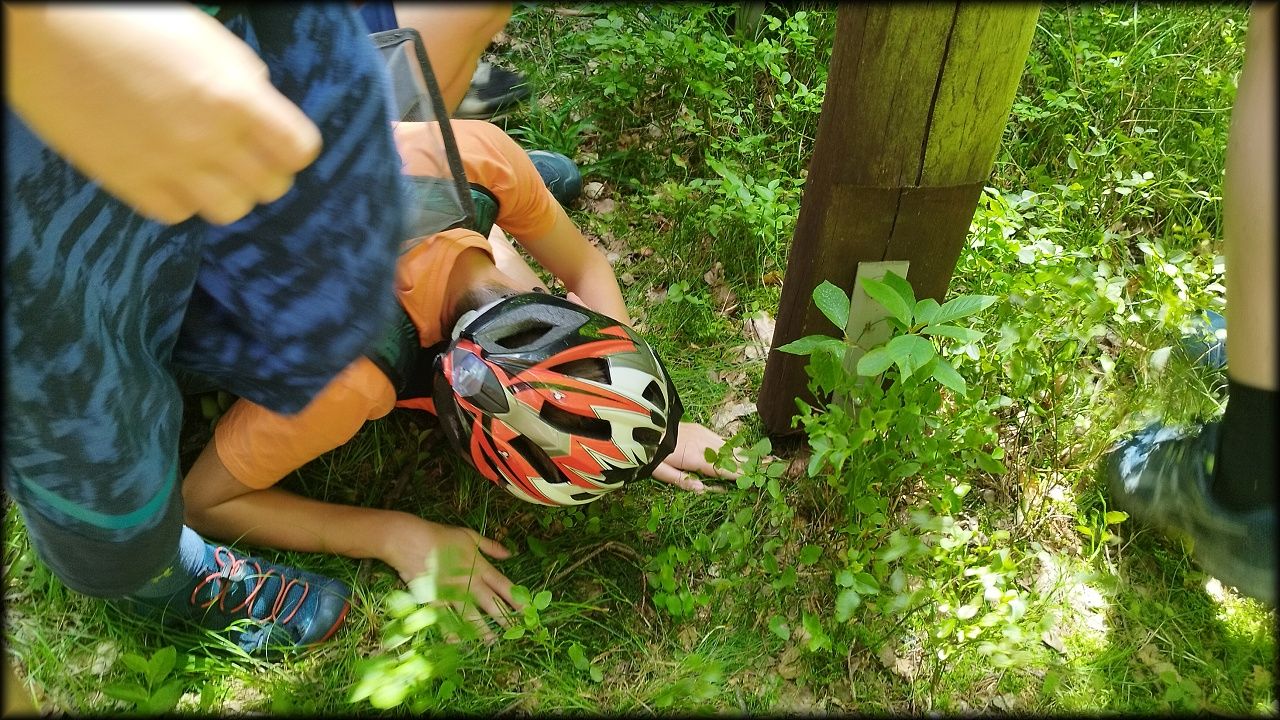 ČTVRTEK: Asi zabloudíme! Dnes trasu přes průjezdné body vybírají samy děti. Tak jedeme vzadu na konci pelotonu podle nich. Občas děti samy zastaví a ubezpečí se podle mapy, zda jedeme správně. Jen jednou, na začátku, jsme se vraceli. U rybníku Kříž zjišťujeme, jak vypadá budka pro netopýry a vidíme douglasku, u nás vzácný severoamerický strom. Je to ještě stromeček, má jen 100 let a 35 metrů. Pak jedem dál pohladit si divoká malá prasátka a daňky. Jeleny vidíme jen zdálky. Přijíždíme na občerstvení na Mazurových chalupách. Celý den hrajeme hlavolamy ze sirek, i přes mírné protesty, že jsou prázdniny, musí děti přemýšlet. A přes Výskyt hurá na oběd. Když se řekne dětem toto slovo, jízda se zrychluje. Dnes je přírodní kuřecí plátek se sýrem a rajčaty a hranolky. Cestu domů přes Malšovice už děti znají samy. Pochvala pro děti za práci s mapou!