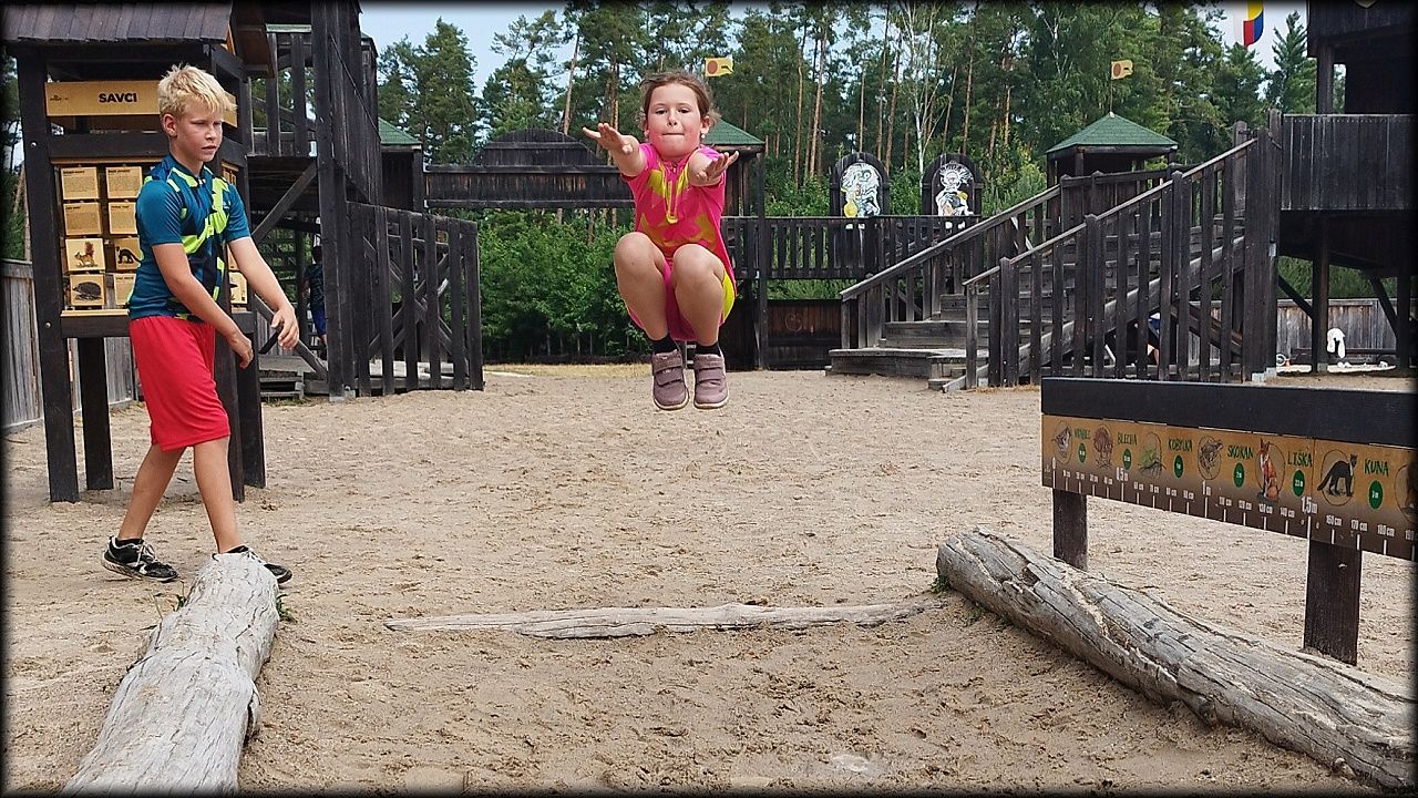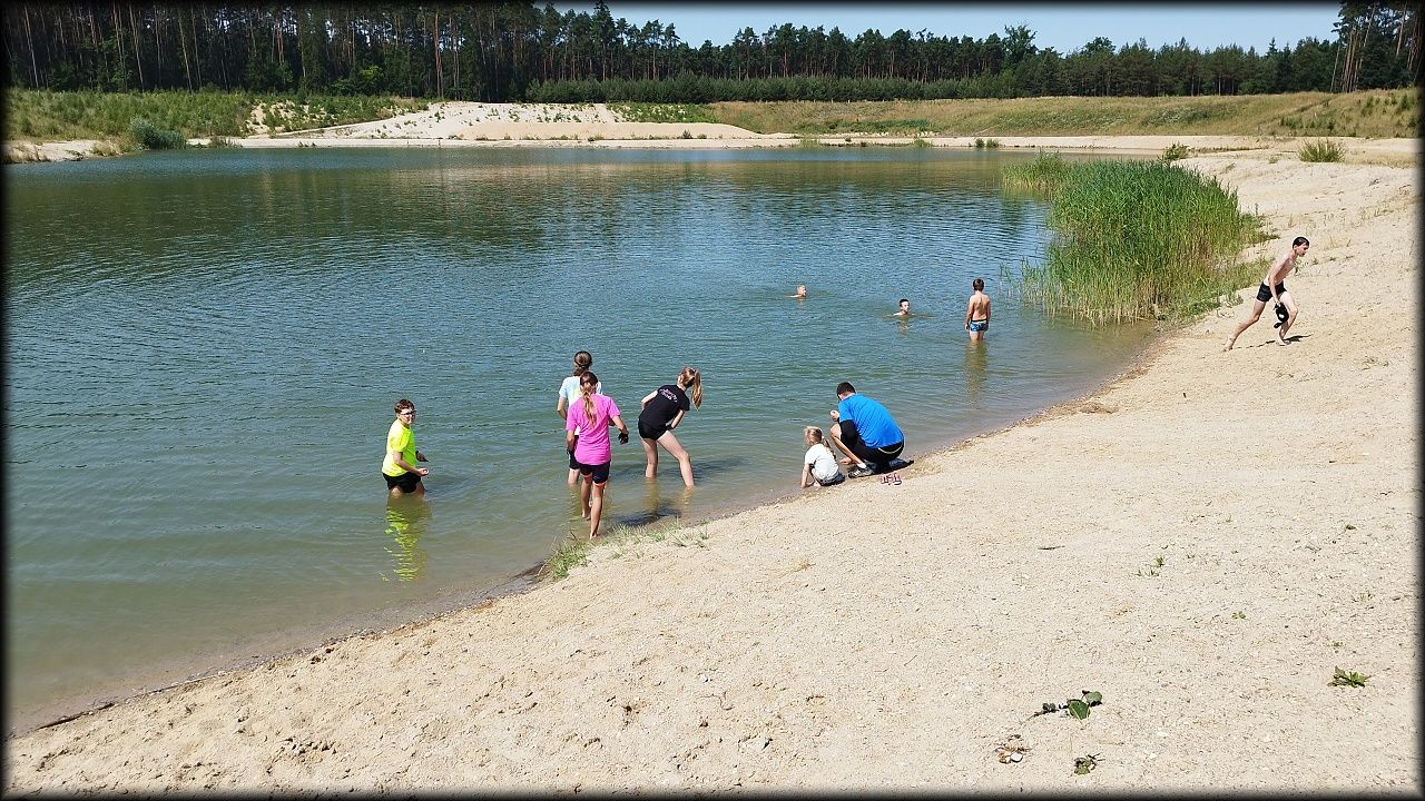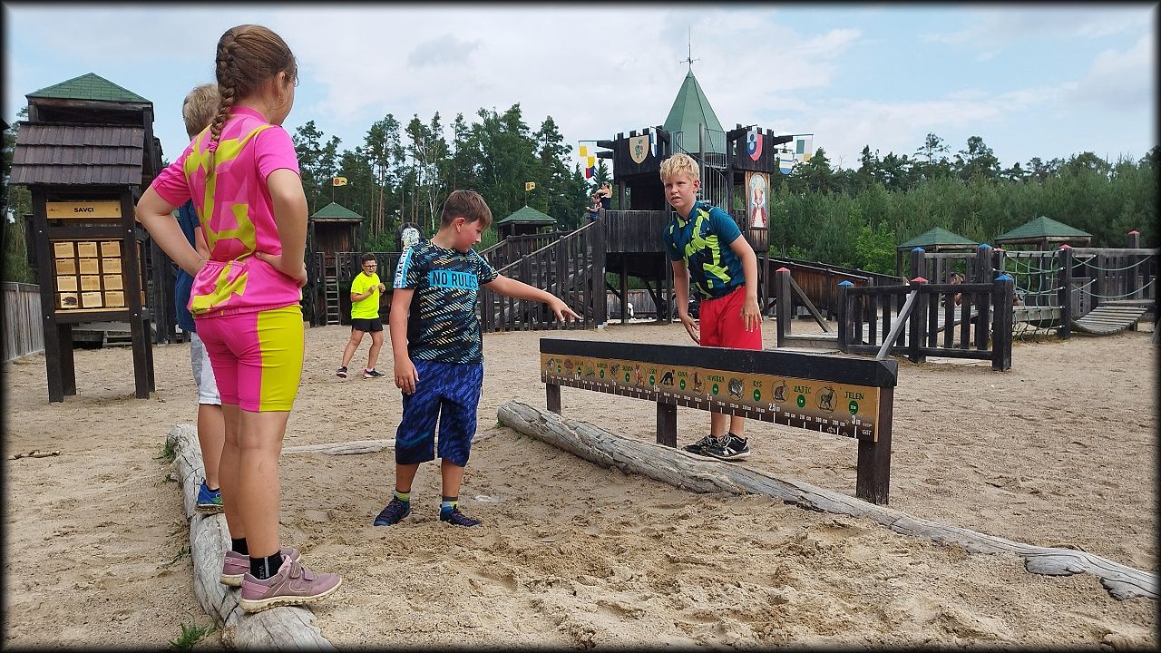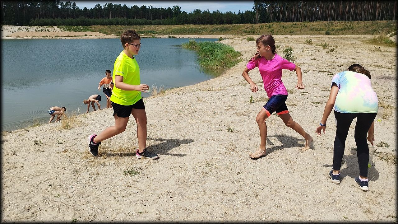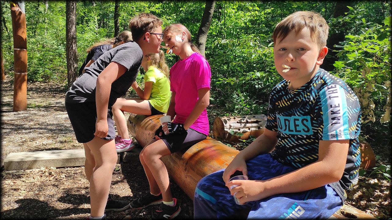 PONDĚLÍ: Po seznamovací hře jsme vyjeli do přírodního parku Na Plachtě, kde jsme do sítěk a do rukou ulovili různé živočichy, žabičky, pulce, dokonce jsme měli štěstí i na larvu čolka velkého. Pak jsme se vydali na krátkou zastávku na hradiště, kde jsme se snažili určovat zvířecí stopy. Cestou jsme si vyzkoušeli základy Geocachingu. K obědu byl řízek s bramborovou kaší a osvěžili jsme se vykoupáním. Ideální den na rozjezd.