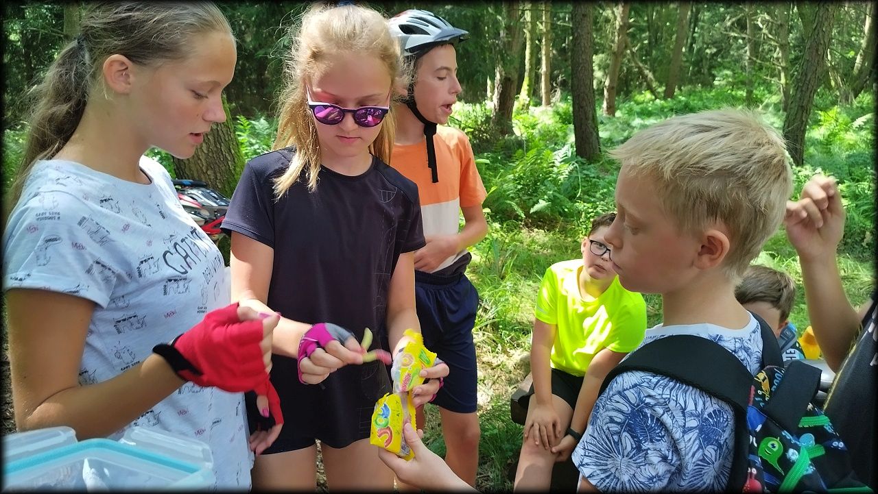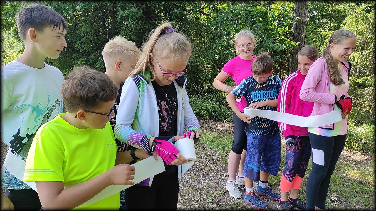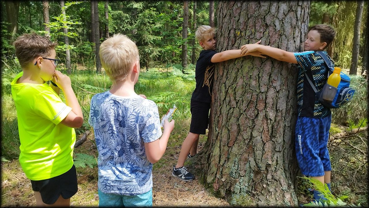 STŘEDA: Po úvodní hře jsme vyjeli po trase Planetární stezky mezi rybníky Roudnička, Datlík, Cikán a Biřička. Každý rybník má jiný účel. Cestou lesem k vodní nádrži Cesta myslivců jsme si zahráli hru "těžba stromů". U Cesty myslivců nám pytláci schovali poklad. Ale nebylo to jen tak, indicie k nalezení byly zašifrovány do úkolů a bylo třeba přemýšlet. Nakonec jsme poklad vypátrali a pytlákům vyfoukli u Císařské studánky. Ještě cestou na oběd jsme viděli nejstarší borovici v hradeckých lesích, která roste už 180 let. K obědu byly bramborové knedlíky plněné uzeným masem se zelím a domů jsme se vraceli tentokrát jinou cestou lesem.