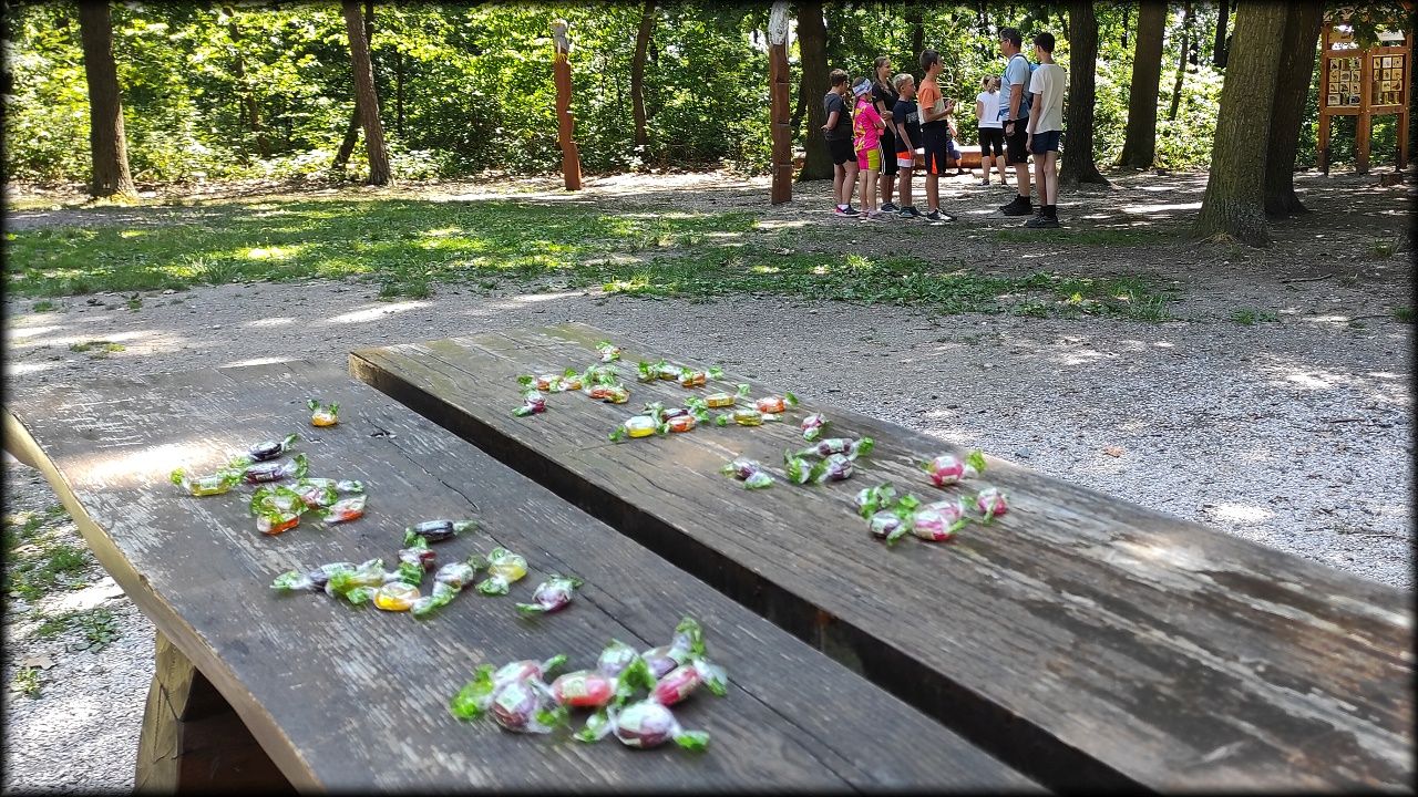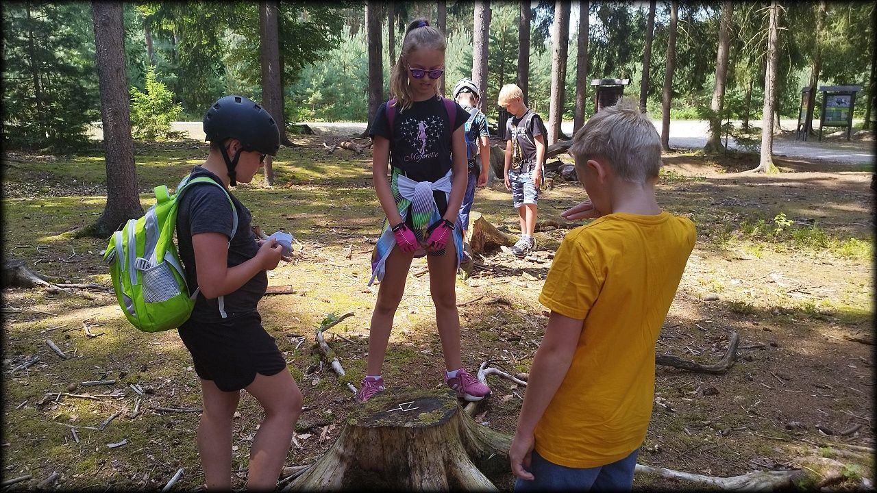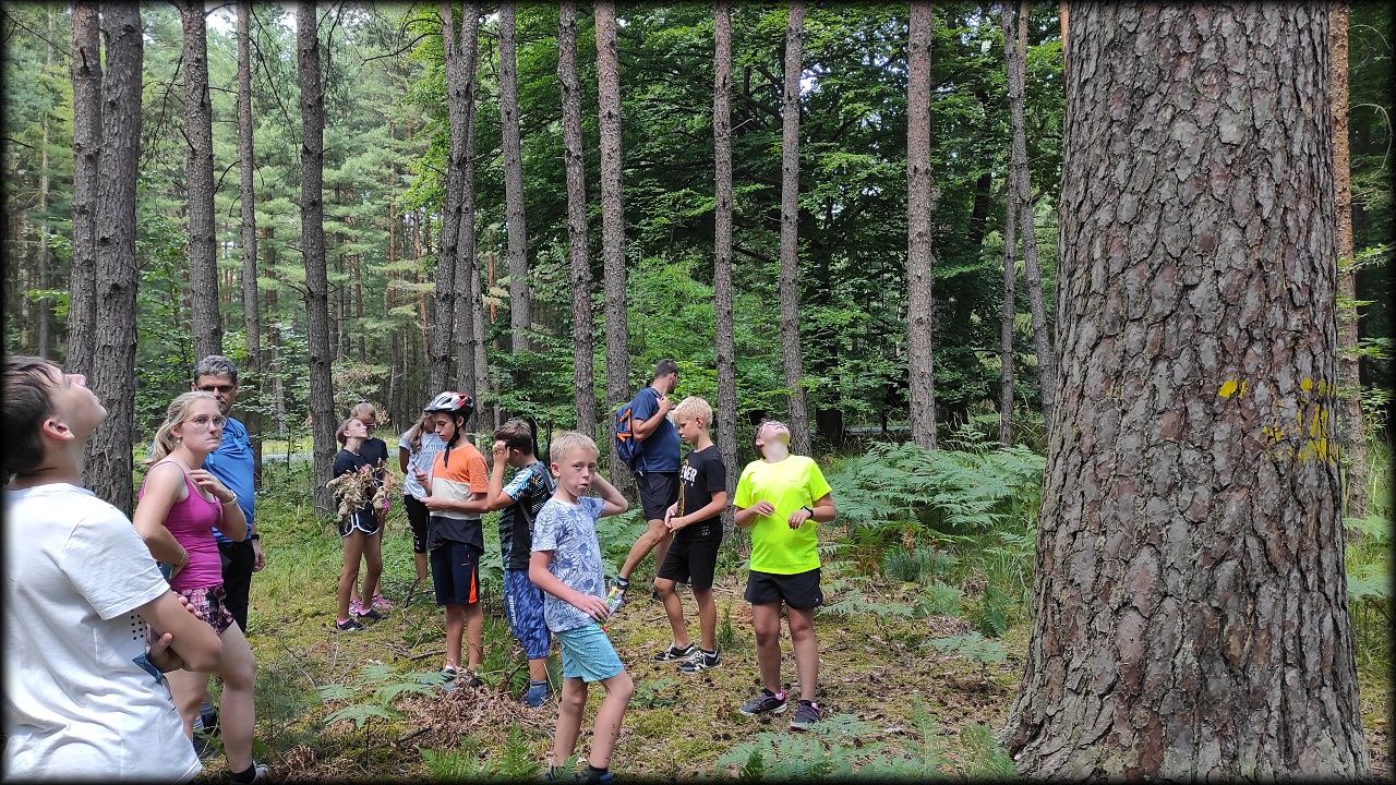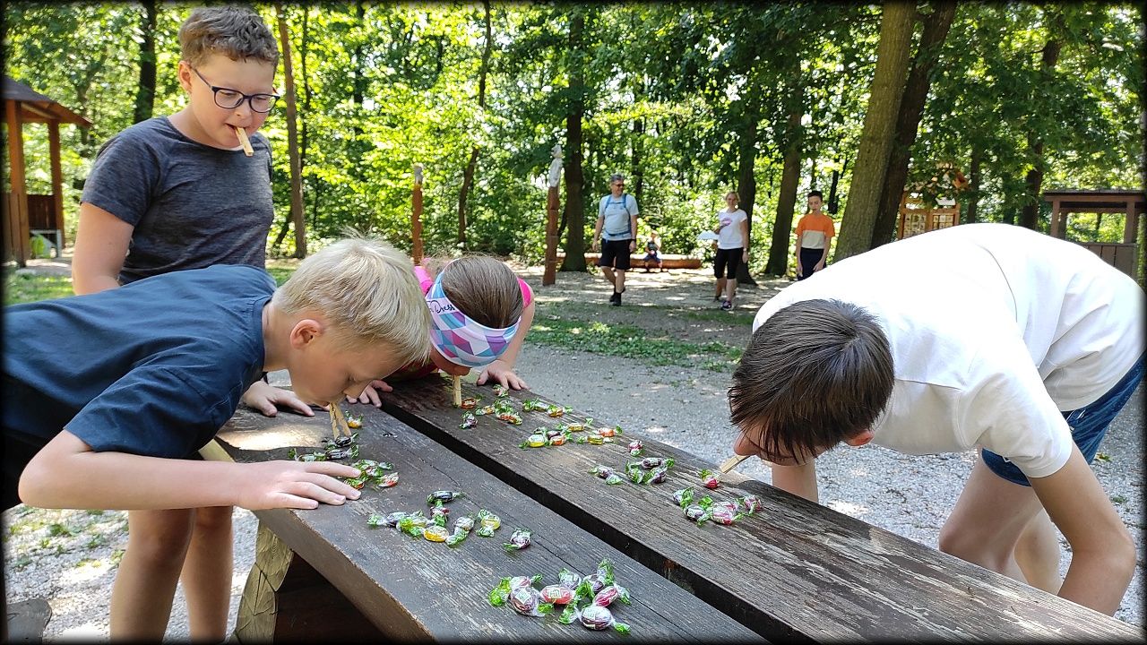 STŘEDA: Po úvodní hře jsme vyjeli po trase Planetární stezky mezi rybníky Roudnička, Datlík, Cikán a Biřička. Každý rybník má jiný účel. Cestou lesem k vodní nádrži Cesta myslivců jsme si zahráli hru "těžba stromů". U Cesty myslivců nám pytláci schovali poklad. Ale nebylo to jen tak, indicie k nalezení byly zašifrovány do úkolů a bylo třeba přemýšlet. Nakonec jsme poklad vypátrali a pytlákům vyfoukli u Císařské studánky. Ještě cestou na oběd jsme viděli nejstarší borovici v hradeckých lesích, která roste už 180 let. K obědu byly bramborové knedlíky plněné uzeným masem se zelím a domů jsme se vraceli tentokrát jinou cestou lesem.