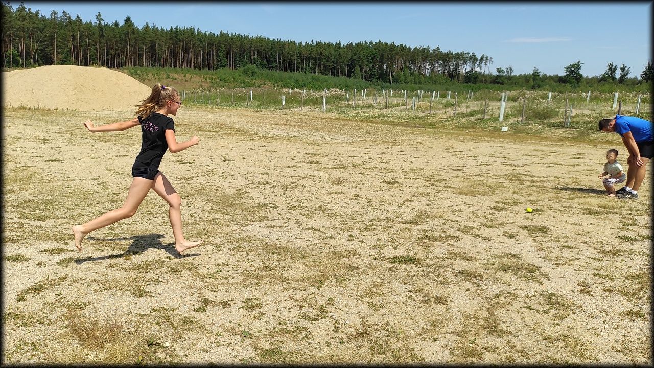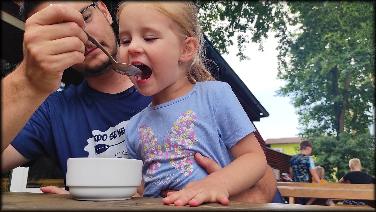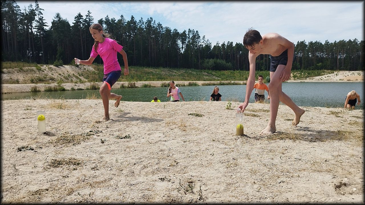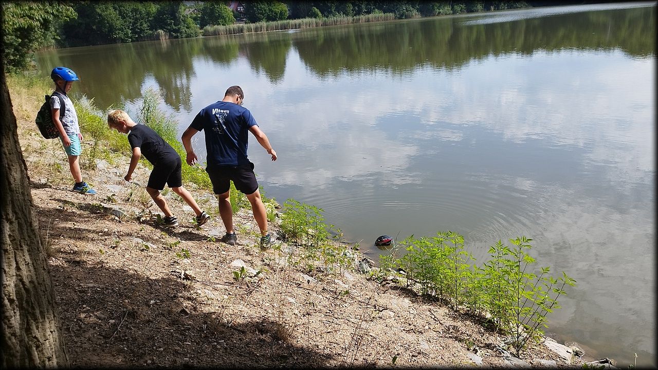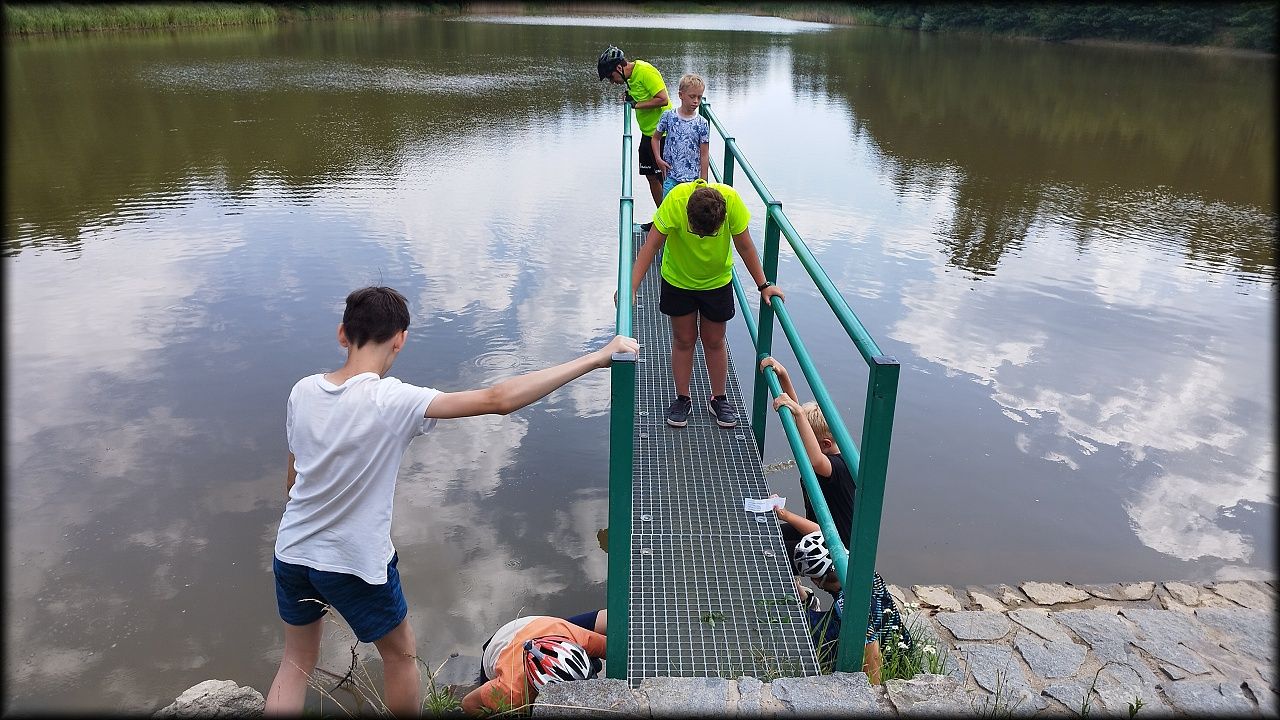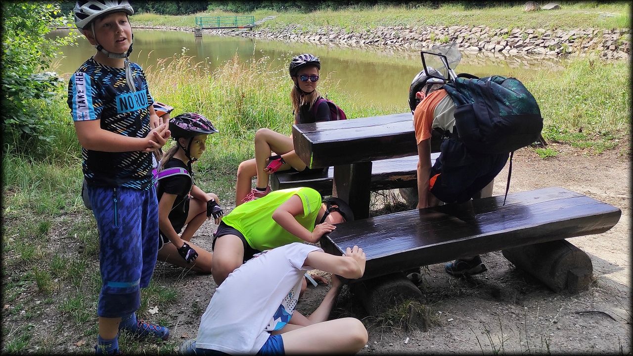 PÁTEK: Známou cestou přes Plachtu vjíždíme na Hradečnici. Jak odbočíme směr Běleč na vedlejší lesní cestu, hned si zahrajeme "štafetu se šiškami a stromy". Také se dozvídáme, jakou divokou rostlinkou se dříve sladilo, než se zjistilo, že je mírně jedovatá. Při další zastávce byla hra "housenka se zakukluje", zjistili jsme, jak se hlídá v lese kůrovec a přes Bělečský mlýn jsme dorazili na Marokánku. Čistá voda lákala k osvěžení a ke dvěma vodním soutěžím. Na zpáteční cestě jsme píchli. Jednou se to muselo stát. P. uč. Hlaváček je nejenom zkušený přírodovědec, ale také zručný opravář. Mnoho dětských očí se zájmem sledovalo, jak se duše provizorně lepí. To je úděl každého cyklisty. K obědu byly masové koule s rajskou omáčkou a těstoviny, pak jsme naposledy zamávali Stříbrnému rybníku a hurá domů!