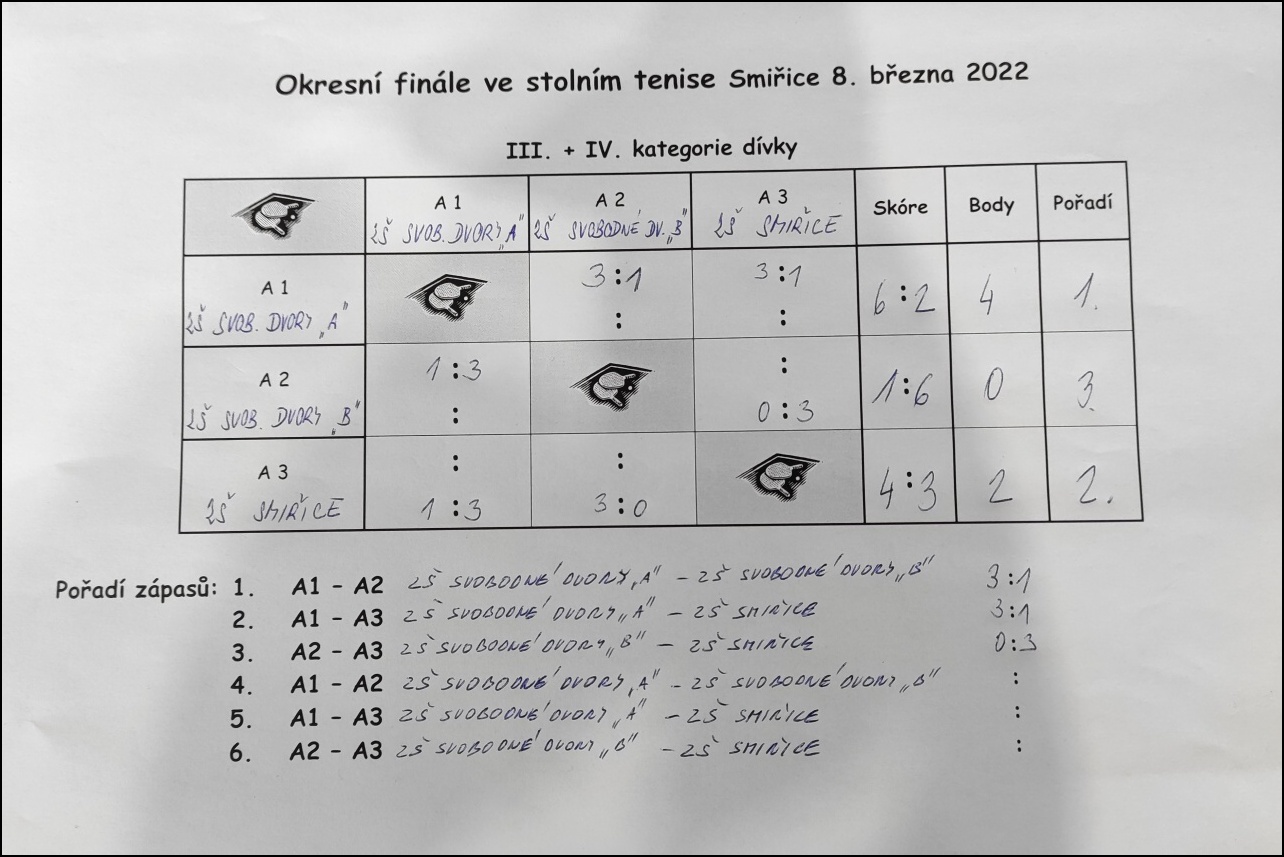 V úterý 8.3. se ve Smiřicích uskutečnilo okresní kolo ve stolním tenise III. + IV. kategorie dívek a chlapců.