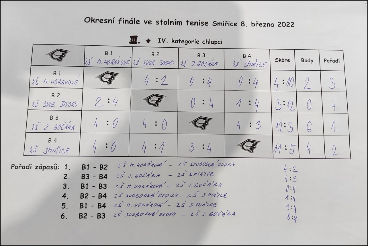 Velice úspěšně reprezentovali školu chlapci Petr Matuška, Jakub Malý a Josef Kvíčera. Ti sice těsně prohráli první zápas 3:4, ale další dva již s přehledem zvládli a po jedné prohře a dvou výhrách získali taktéž stříbrné medaile. Mimo soutěž se pak utkaly v souboji "B" týmy ZŠ Smiřice a ZŠ Svobodné Dvory, který vyzněl lépe pro naše chlapce ve složení Adam Cepl, Václav Kvíčera a Patrik Pozdílek.