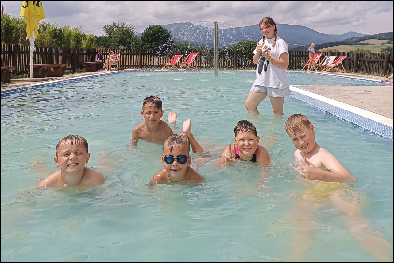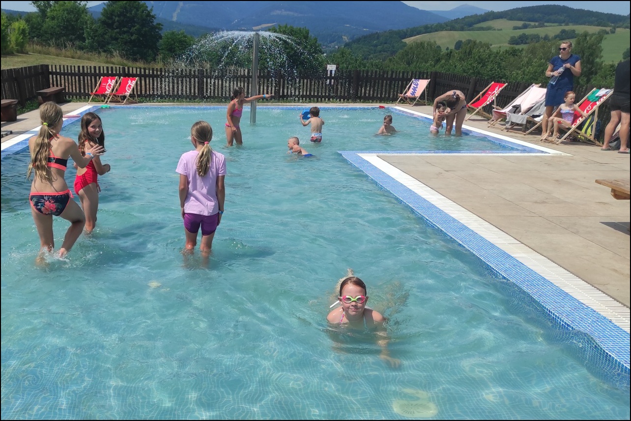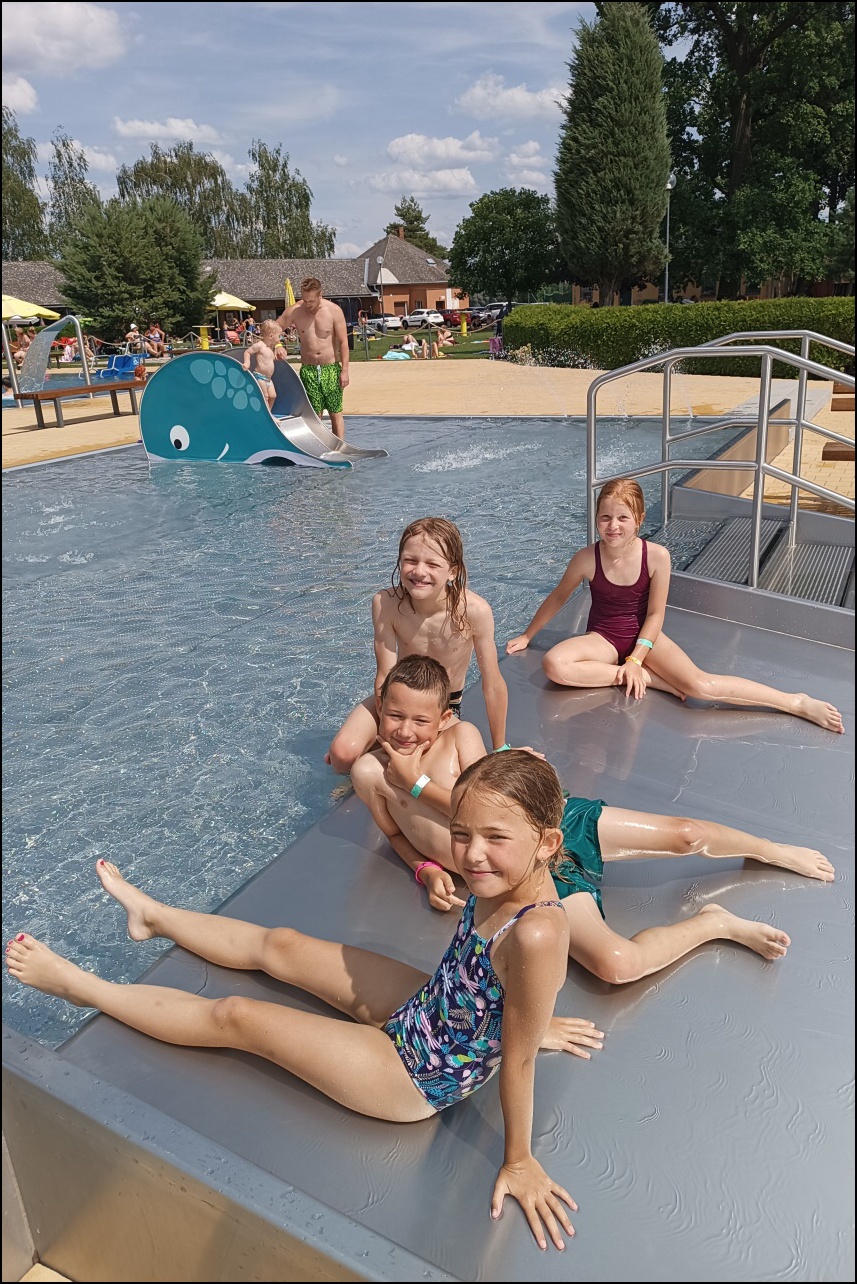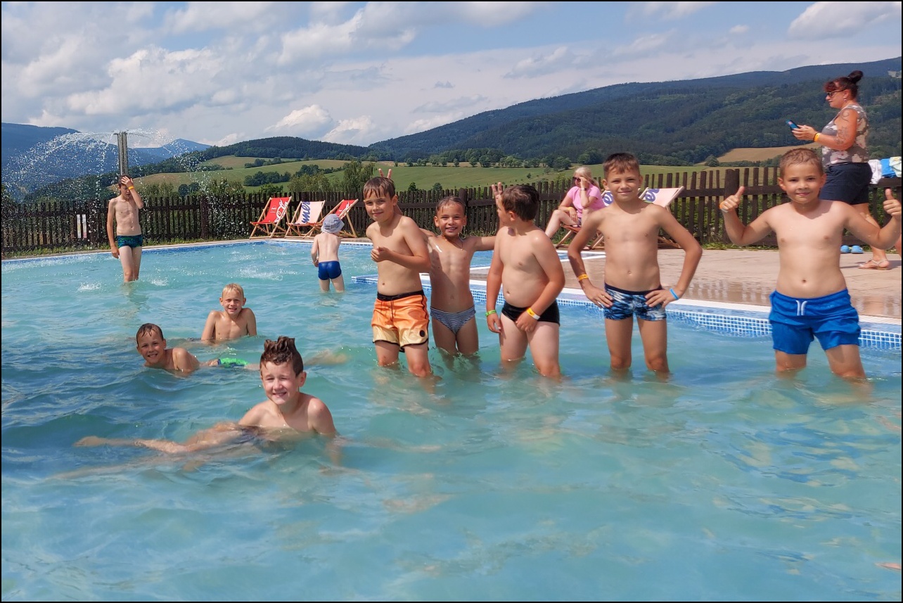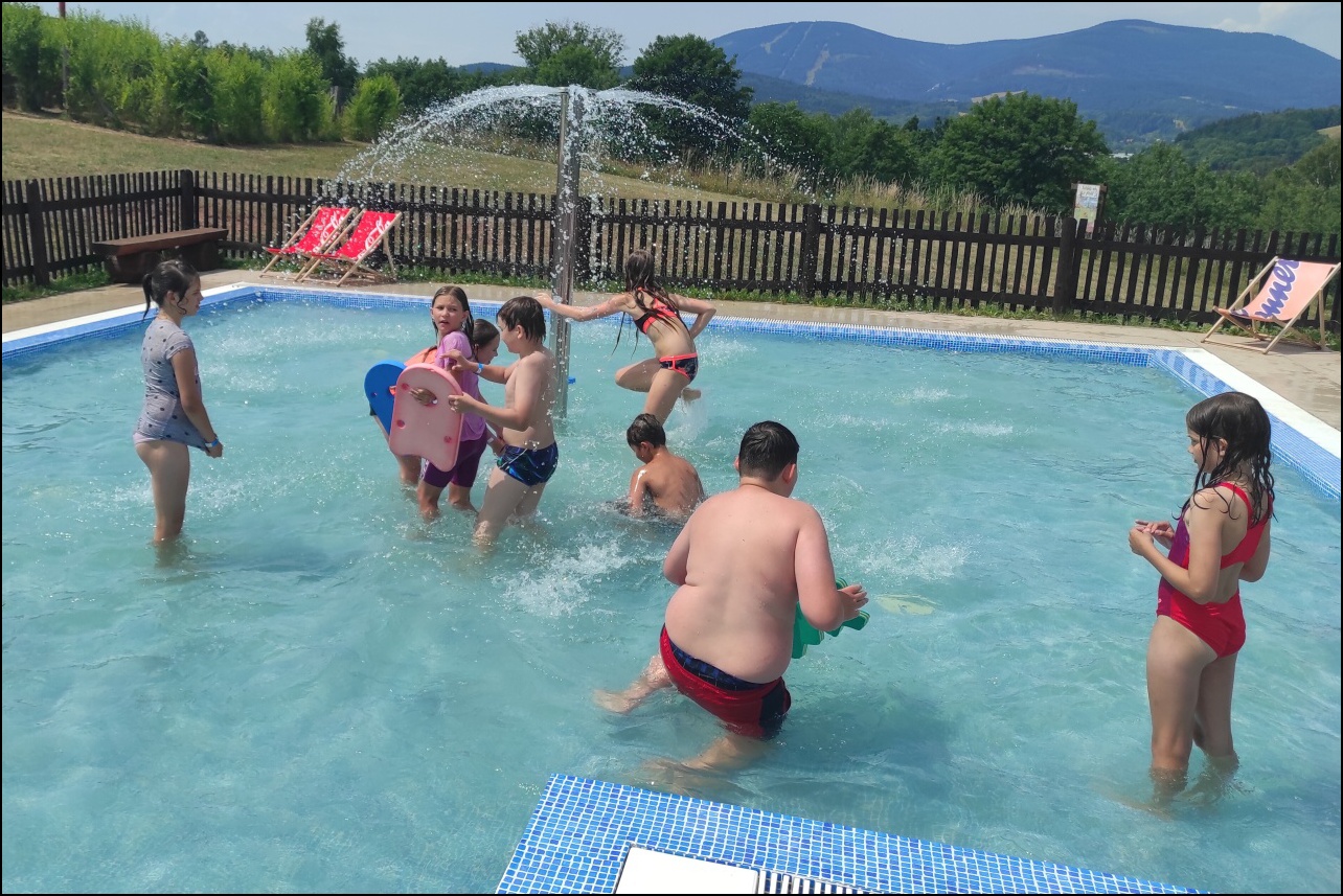 Nově zrekonstruovaný bazén, který většina dětí ještě neznala. byl pro všechny jedním velkým překvapením. Příjemné prostředí, zábavné prolézačky ve vodě a skvělá skluzavka se zasloužili o to, že si skotačení ve velkých vedrech všichni velice užili a určitě jsme toto koupaliště nenavštívili naposledy.