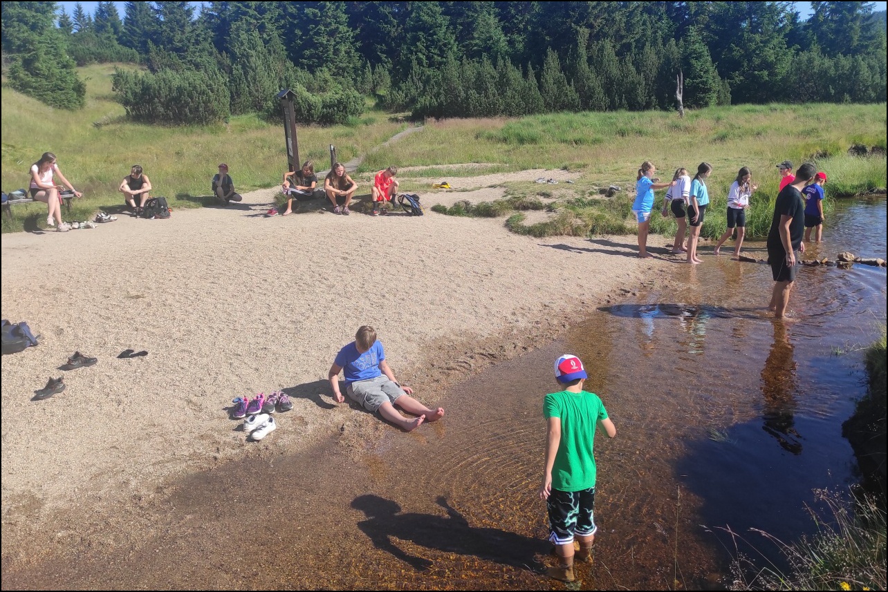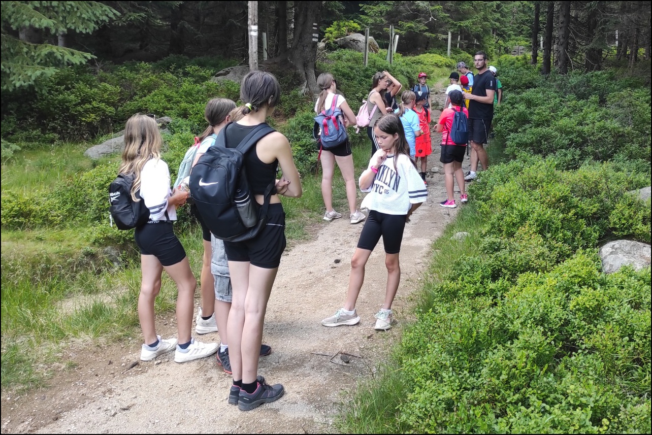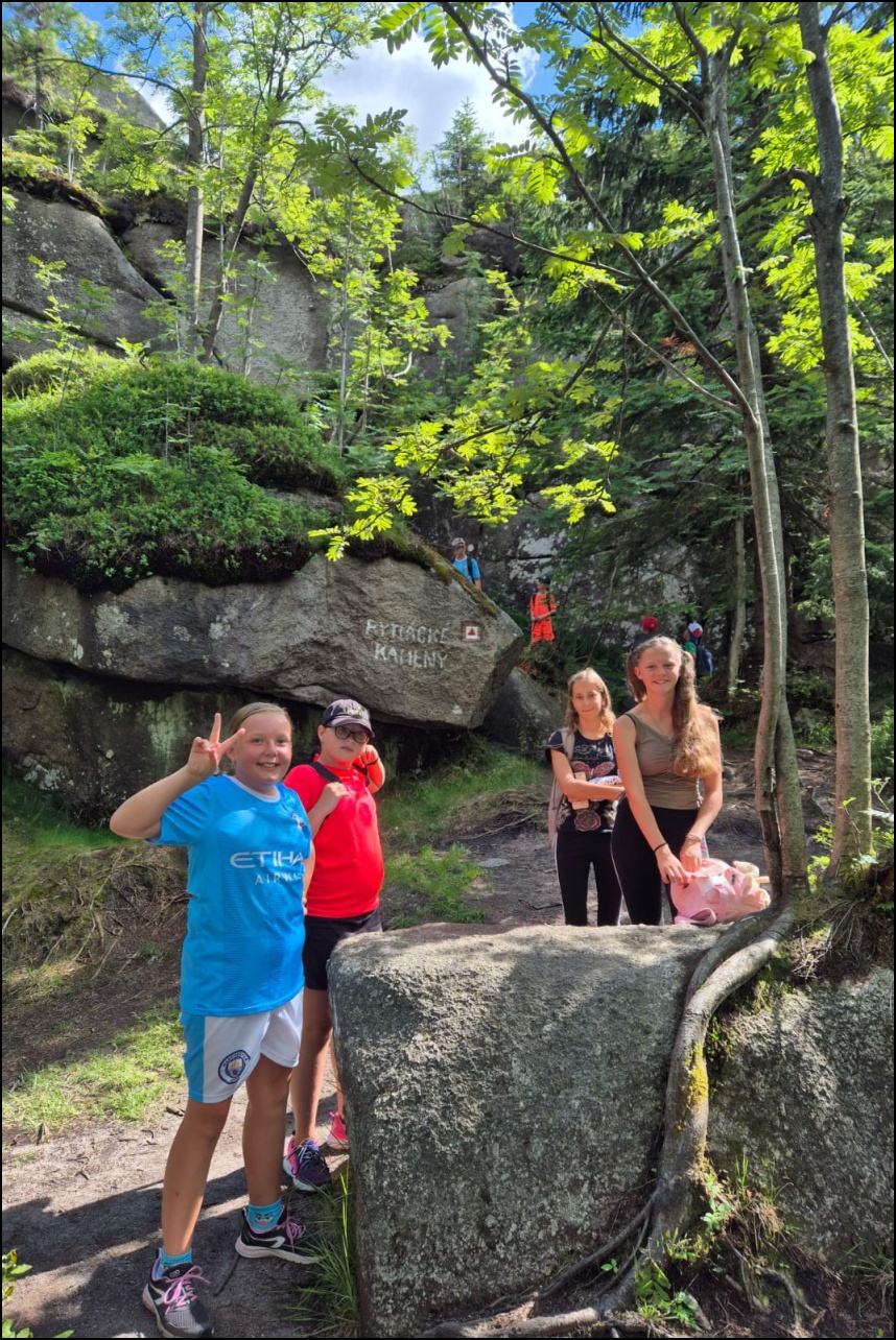 Probudili jsme se do nádherného slunečného dne, který lákal ke sportu a krátkému výletu. Dopoledne jsme si v tělocvičně zahráli pro většinu novou pálkovací hru - brännball. Pravidla zněla nejprve celkem složitě, ale po prvních minutách hry všichni pochopili, co mají dělat. Všechny sport velice zaujal a tak jsme mohli vidět velice vyrovnané zápasy plné napětí, homerunů a zaujetí. Během volna mezi zápasy si děti vyzkoušely laserovou střelnici. Po obědě nás čekal výlet přes Jelení stráň - nejvyšší bod procházky - 1018 m.n.m. na Pytlácké kameny. Zde jsme se dozvěděli původ názvu i krátký příběh o pytlákovi a pašerákovi Hennrichovi, který v těchto skalách pobýval. Při sestupu zpět na Hotel jsme se podívali na chráněnou rašeliništní oblast, kde jsme mohli vidět mimo jiné i chráněnou masožravku rosnatku okrouhlolistou. Večer jsme si v tělocvičně zahráli miniturnaj ve fotbale a opět nacvičovali střelbu s laserové pušky. Pak už hurá do postelí po náročném dni - něco málo přes 8 km pěšího výletu a pár kilometrů naběhaných v tělocvičně.