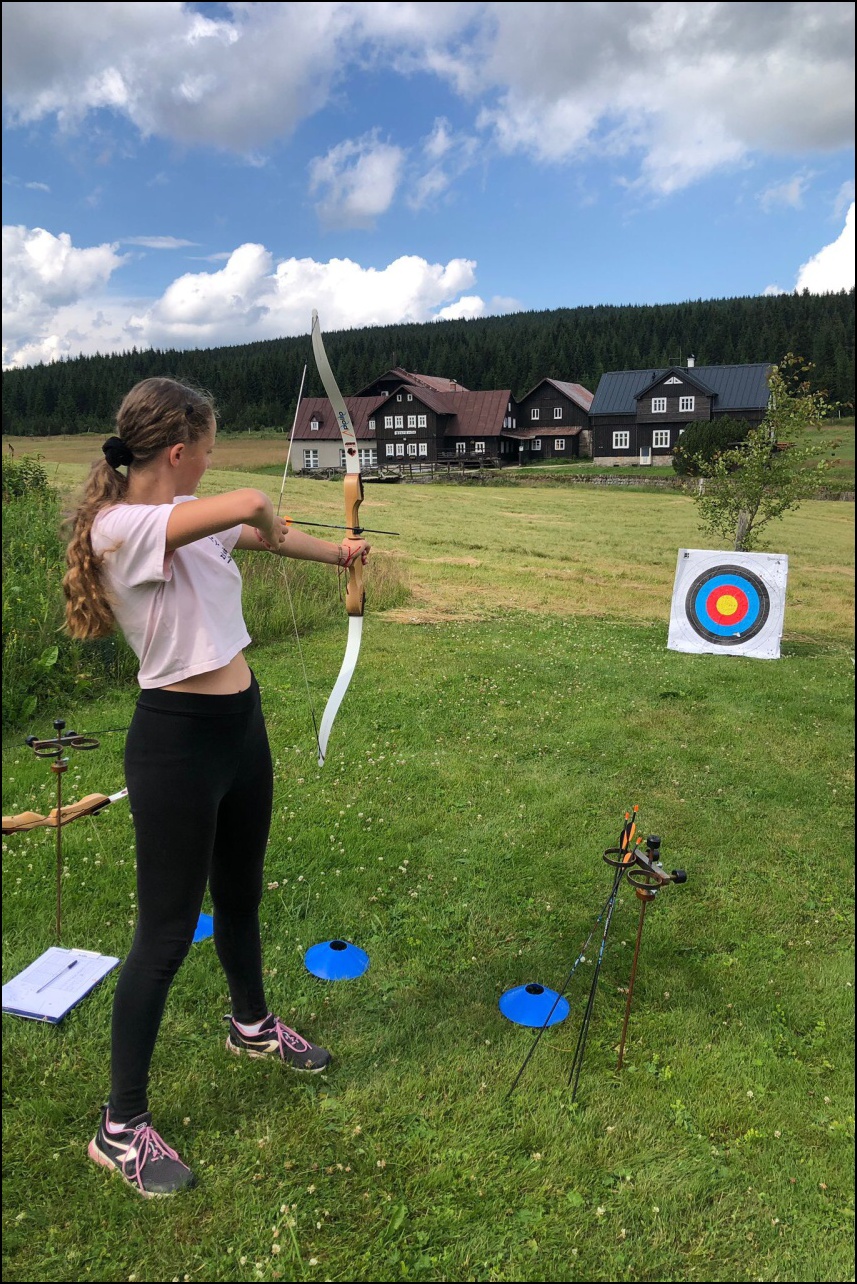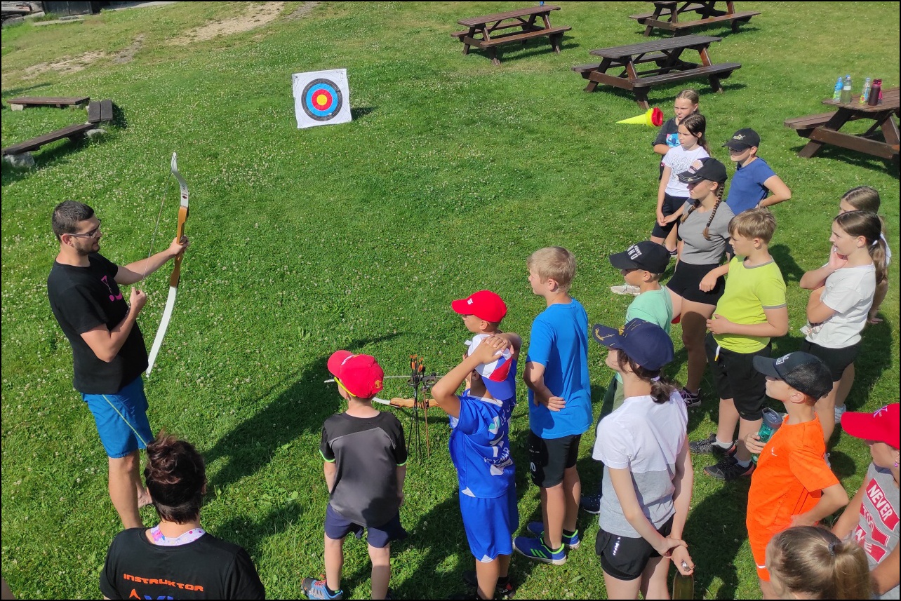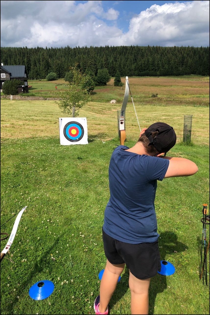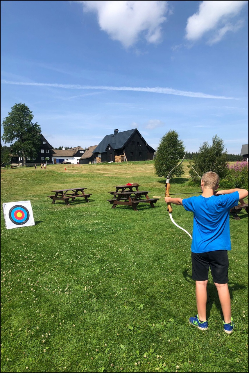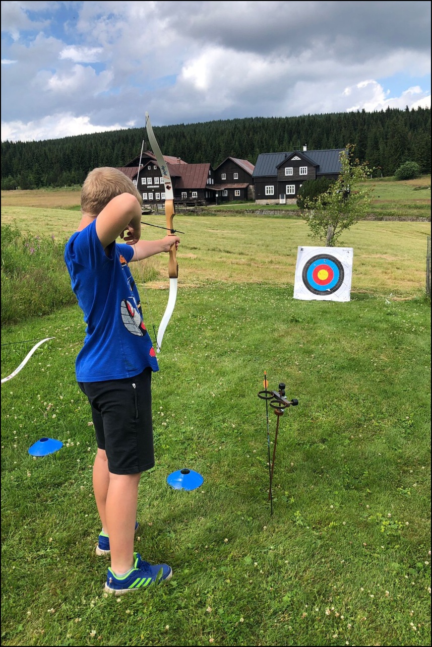 Sportovní pobyt se nám blíží ke konci a my jsme měli stále 2 sady medailí, které musely najít své majitele. Dopoledne proběhl souboj v "míčovém" osmiboji. Děti se snažily získat co nejmenší počet trestných bodů v disciplínách - kop na branku, hod tenisakem na cíl, hod na disk golfový koš, hod kolíkem na Kubb, střelba florbalovou holí na branku, cvrnkání pink ponkového míčku do kelímku, hod na koš, hod volejbalovým míčem na cíl. Po obědě nás čekala druhá medailová disciplína a to střelecké závody. Ty začaly krátkým během, po kterém následovala střelba z luku, poté opět krátké běžecké kolečko a druhá střelba, tentokráte z laserové pušky. Po předposledním kole přišel na řadu hod na cíl. Pak už jen poslední běh a hurá do cíle. Vyhlásili jsme výsledky a dále se bavili minisoutěžemi ve střelbě. Po večeři jsme déšť přečkali u x boxu a tanečních podložek. Po dešti přišel krásný večer u ohně. Opékali jsme si buřty a pečivo. Poslední večer si naše vedoucí lezeckého kroužku připravila pro děti malé překvapení formou nočního lezení s čelovkami. Jako třešničku na dortu jsme zadařili krátkou stezku odvahy z tělocvičny zpět do hotelu. "Večerku" jsme sice poněkud protáhli, děti však získaly opět spoustu zážitků.