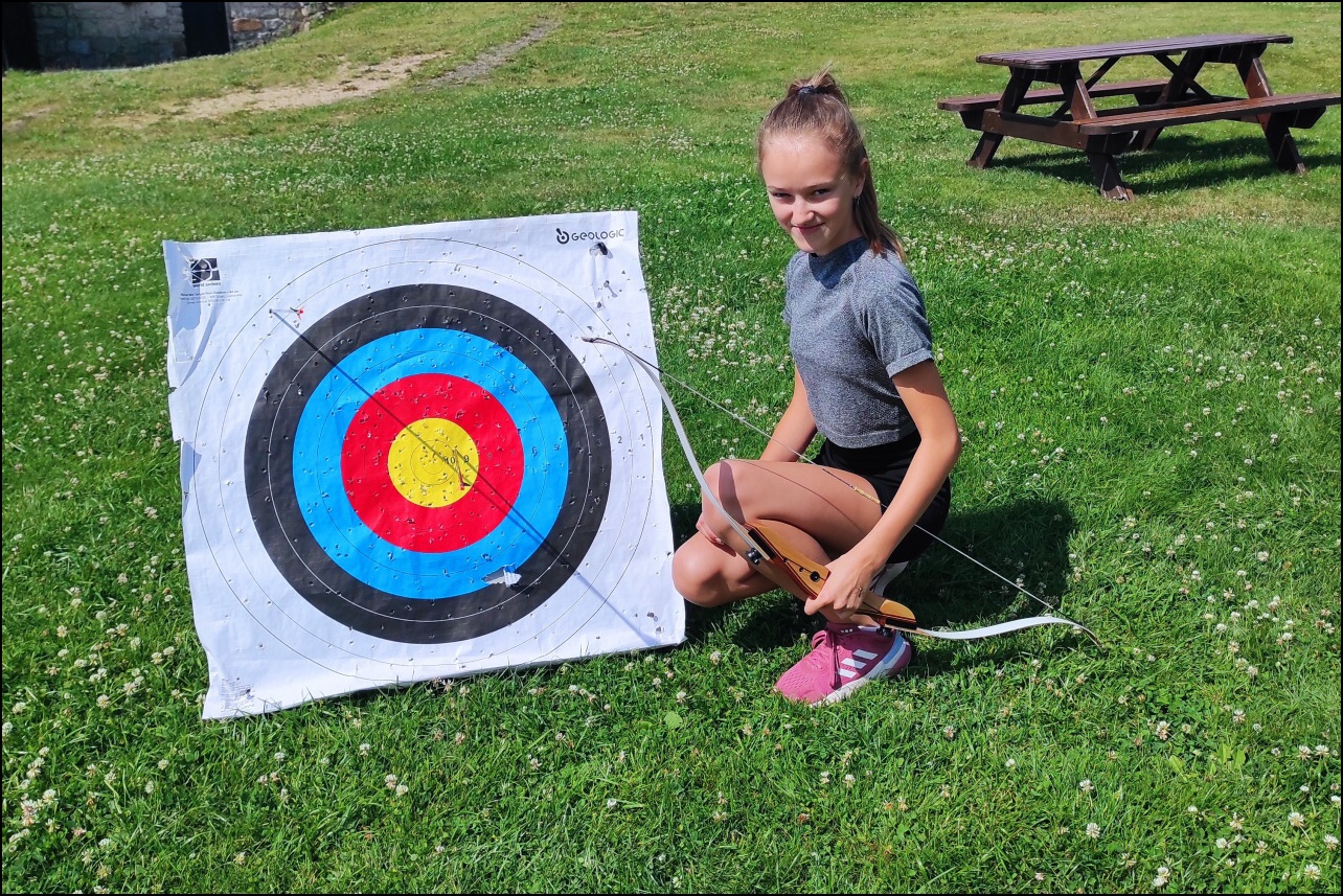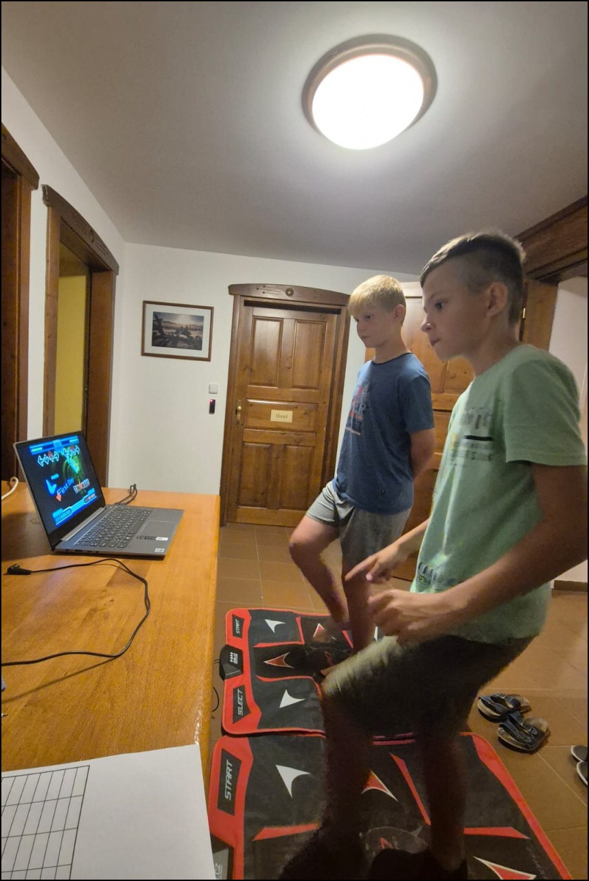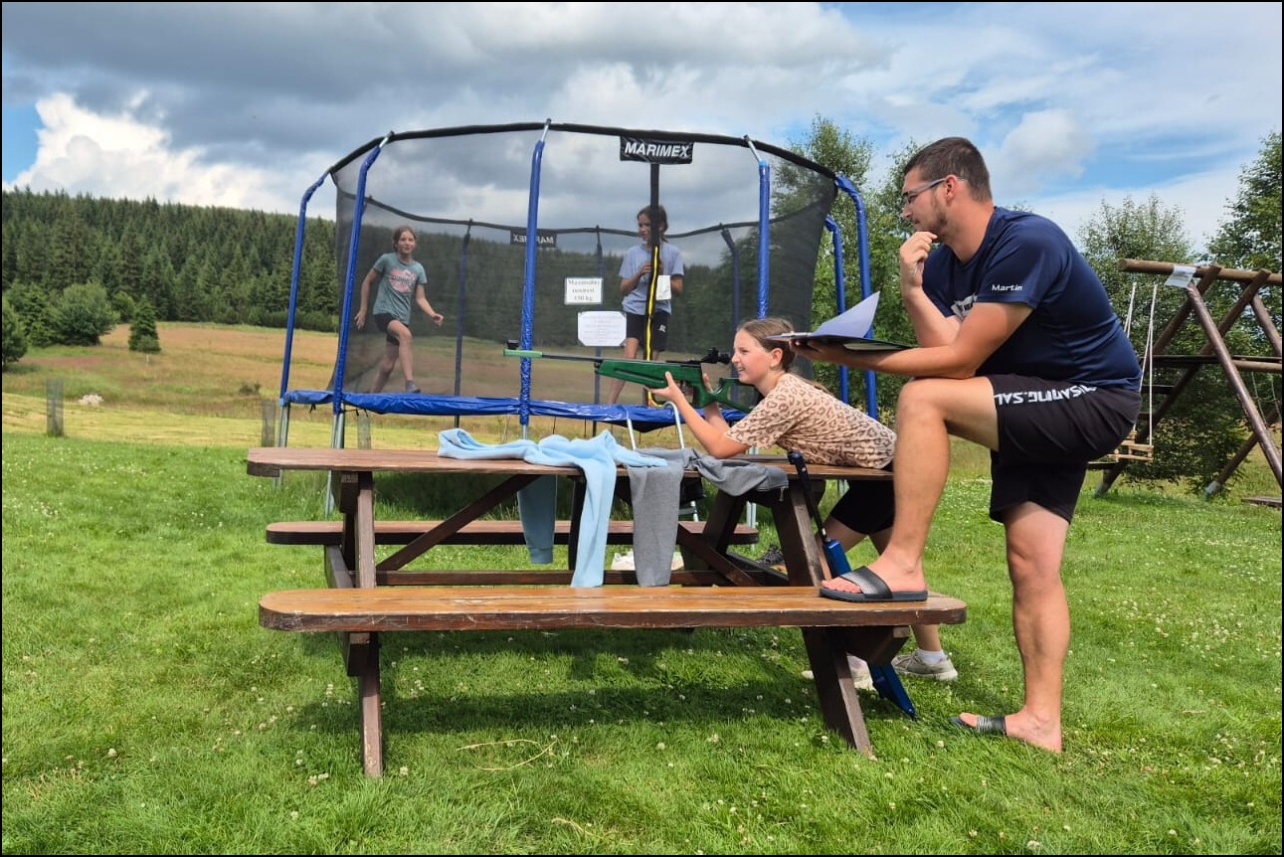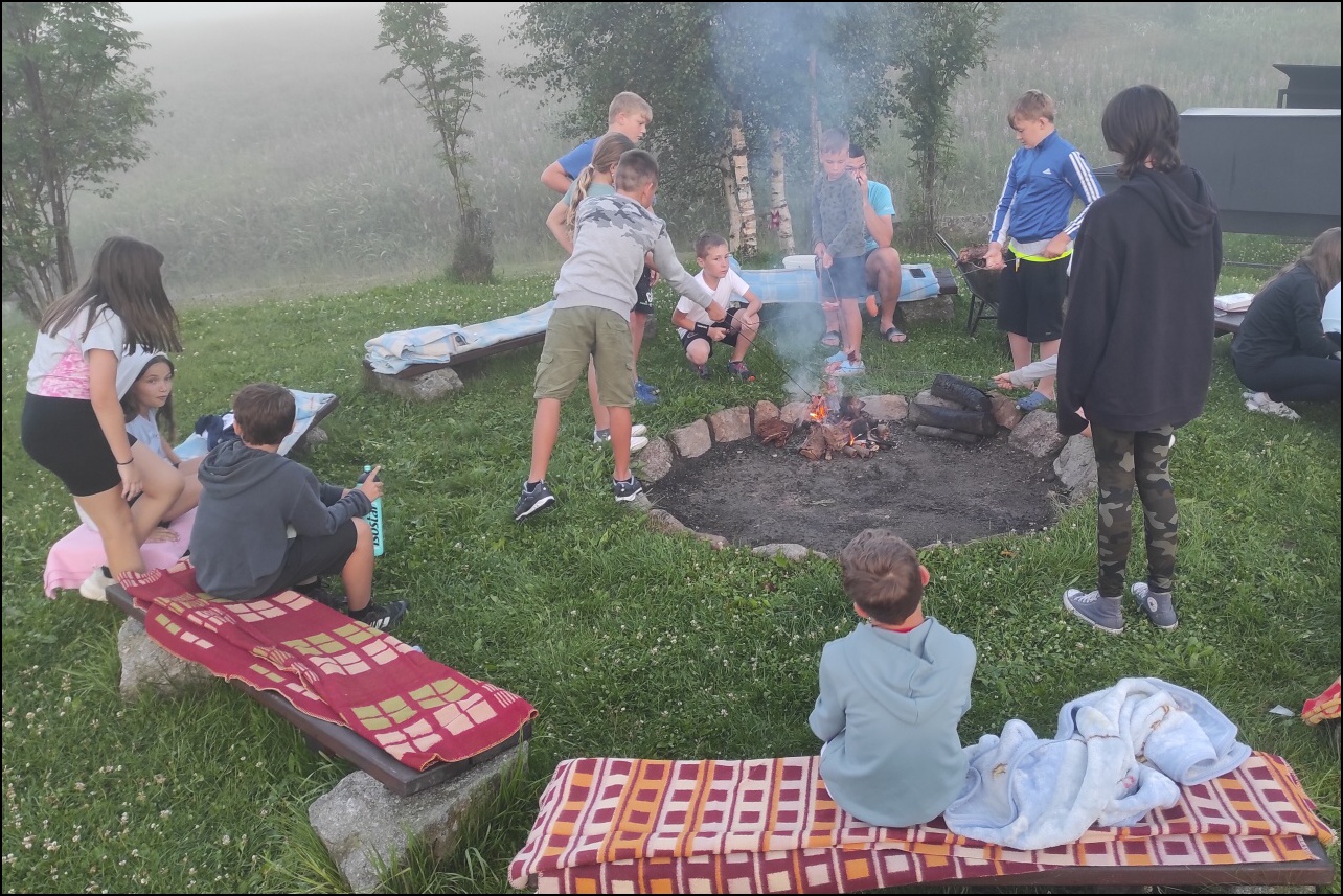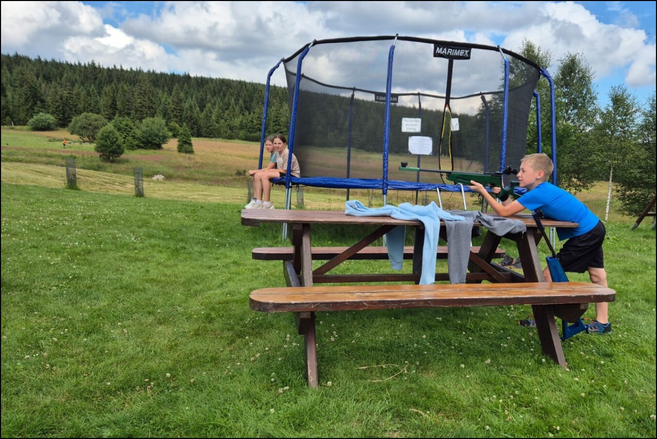 Sportovní pobyt se nám blíží ke konci a my jsme měli stále 2 sady medailí, které musely najít své majitele. Dopoledne proběhl souboj v "míčovém" osmiboji. Děti se snažily získat co nejmenší počet trestných bodů v disciplínách - kop na branku, hod tenisakem na cíl, hod na disk golfový koš, hod kolíkem na Kubb, střelba florbalovou holí na branku, cvrnkání pink ponkového míčku do kelímku, hod na koš, hod volejbalovým míčem na cíl. Po obědě nás čekala druhá medailová disciplína a to střelecké závody. Ty začaly krátkým během, po kterém následovala střelba z luku, poté opět krátké běžecké kolečko a druhá střelba, tentokráte z laserové pušky. Po předposledním kole přišel na řadu hod na cíl. Pak už jen poslední běh a hurá do cíle. Vyhlásili jsme výsledky a dále se bavili minisoutěžemi ve střelbě. Po večeři jsme déšť přečkali u x boxu a tanečních podložek. Po dešti přišel krásný večer u ohně. Opékali jsme si buřty a pečivo. Poslední večer si naše vedoucí lezeckého kroužku připravila pro děti malé překvapení formou nočního lezení s čelovkami. Jako třešničku na dortu jsme zadařili krátkou stezku odvahy z tělocvičny zpět do hotelu. "Večerku" jsme sice poněkud protáhli, děti však získaly opět spoustu zážitků.