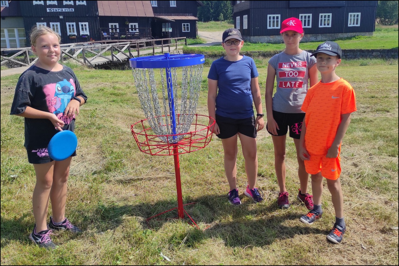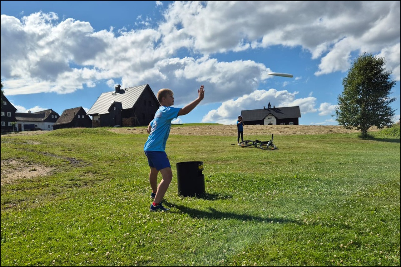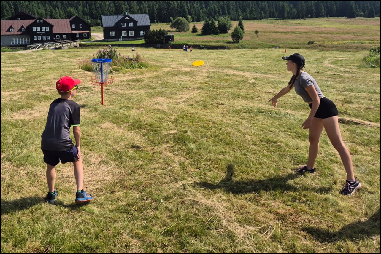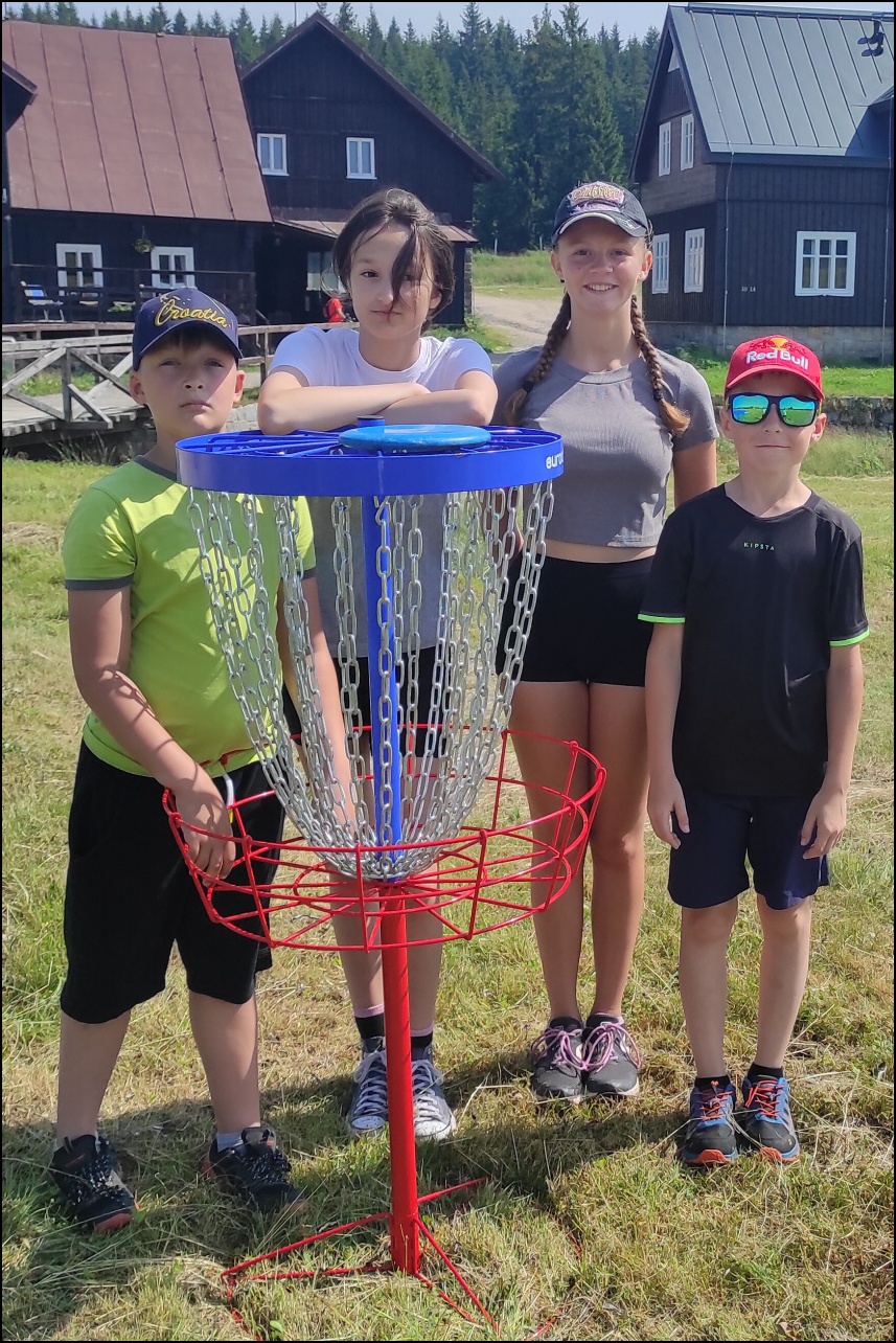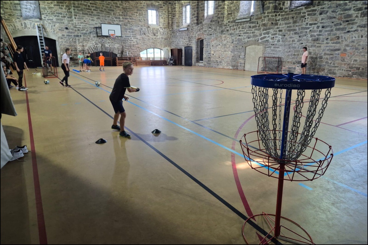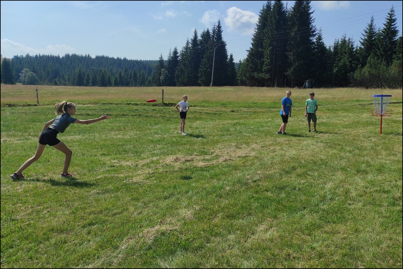 Jelikož jsme očekávali poobědový déšť, rozhodli jsme se dopolední tělocvičnu vynechat a užívat si sluníčka venku. To nás hřálo při další, pro většinu neznámé, hře - disk golf. Po zdolání všechn tras zakončených košem jsme výsledky rychle vyhodnotili a vyhlásili nejlepší disk golfový tým. Chvíli volna před obědem děti využily k osvěžení v potoce nebo malinko namáhaly mozkové závity při dalších "sirkových" hádankách. Odpoledne se v tělocvičně odehrál miniturnaj ve florbale. Opět jsme mohli vidět velice kvalitní a napínavé zápasy, ve kterých se skóre přelévalo ze strany na stranu. Po odehrání následovaly aktivity dle přání a sil dětí - stěna, florbal, basketbal, odpočinek. Jelikož někteří cítili únavu poněkud více, zařadili jsme na večer odpočinkový program ve formě deskových her, x boxu a tanečních podložek. Opět den plný sportu za námi a další před námi, tak hurá do peřin a ráno v plné síle do sálovek!