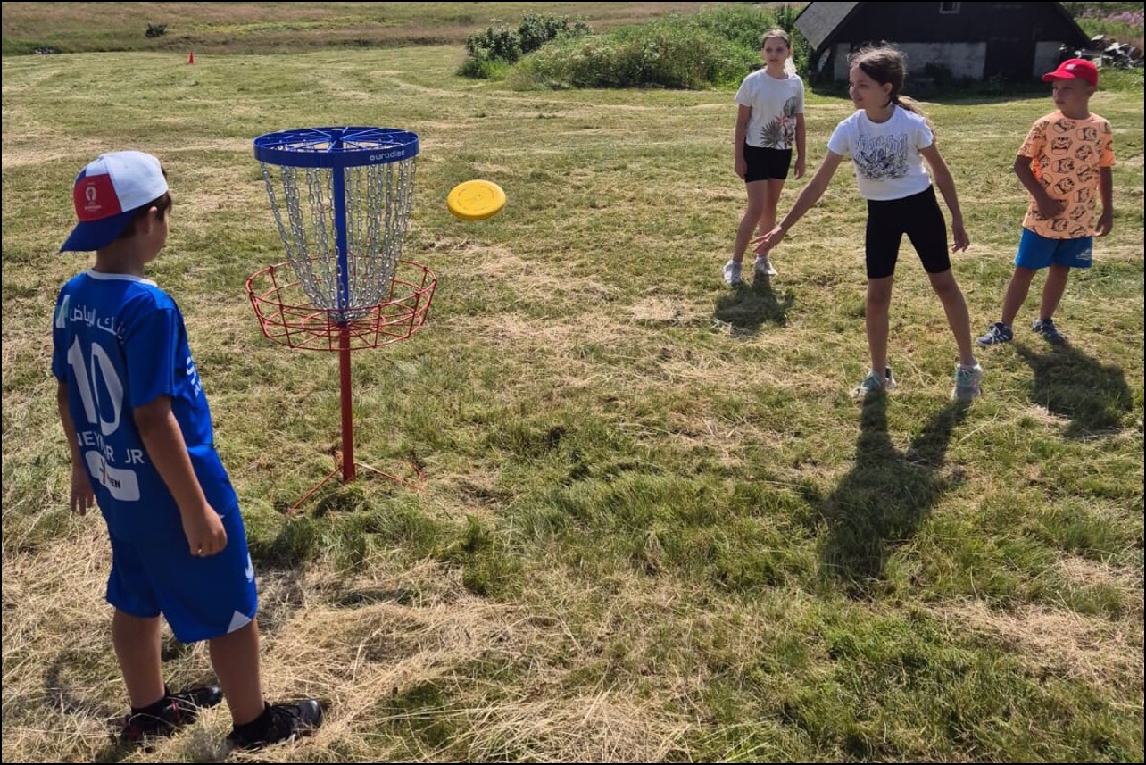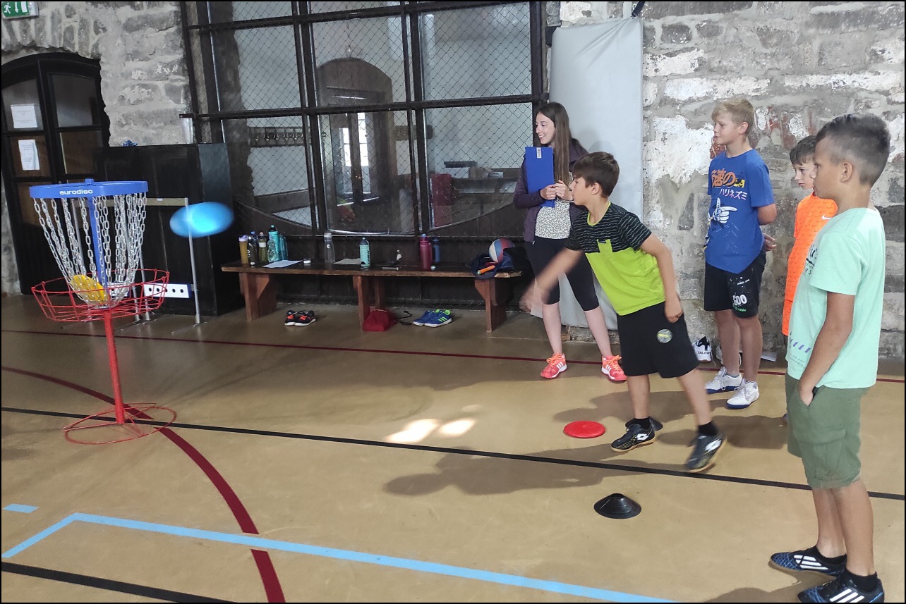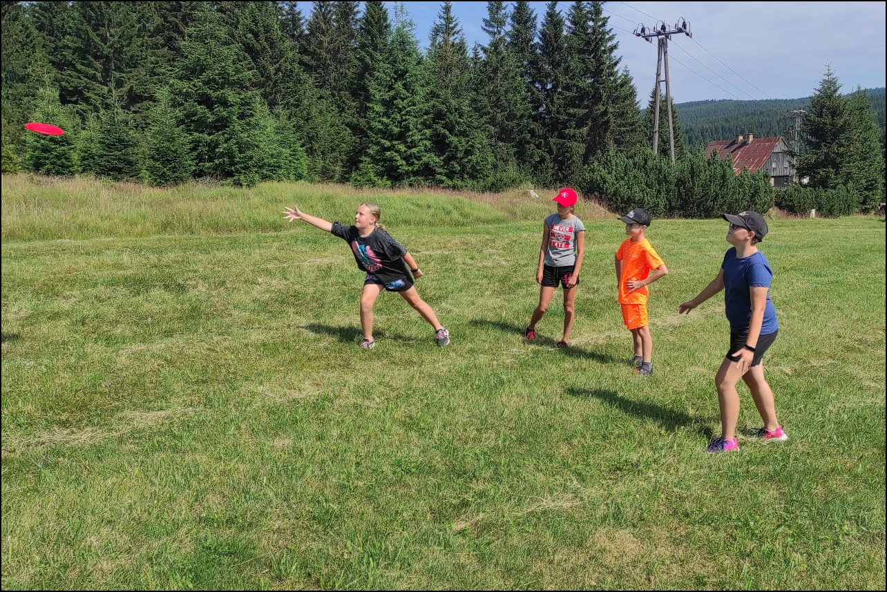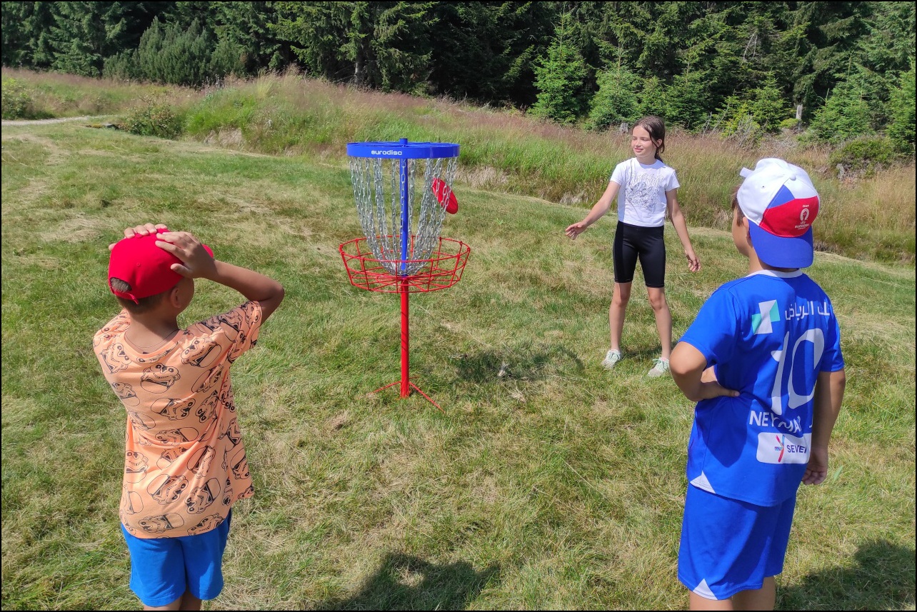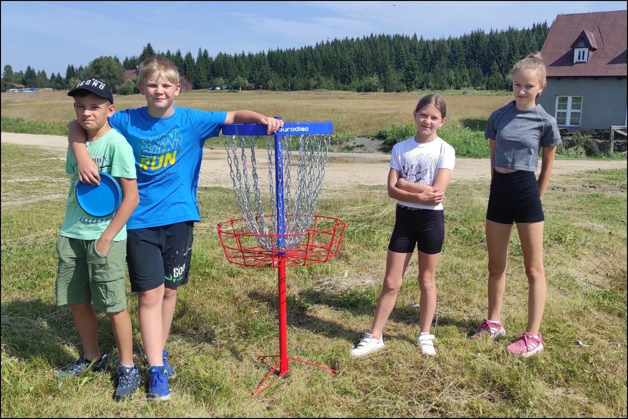 Jelikož jsme očekávali poobědový déšť, rozhodli jsme se dopolední tělocvičnu vynechat a užívat si sluníčka venku. To nás hřálo při další, pro většinu neznámé, hře - disk golf. Po zdolání všechn tras zakončených košem jsme výsledky rychle vyhodnotili a vyhlásili nejlepší disk golfový tým. Chvíli volna před obědem děti využily k osvěžení v potoce nebo malinko namáhaly mozkové závity při dalších "sirkových" hádankách. Odpoledne se v tělocvičně odehrál miniturnaj ve florbale. Opět jsme mohli vidět velice kvalitní a napínavé zápasy, ve kterých se skóre přelévalo ze strany na stranu. Po odehrání následovaly aktivity dle přání a sil dětí - stěna, florbal, basketbal, odpočinek. Jelikož někteří cítili únavu poněkud více, zařadili jsme na večer odpočinkový program ve formě deskových her, x boxu a tanečních podložek. Opět den plný sportu za námi a další před námi, tak hurá do peřin a ráno v plné síle do sálovek!