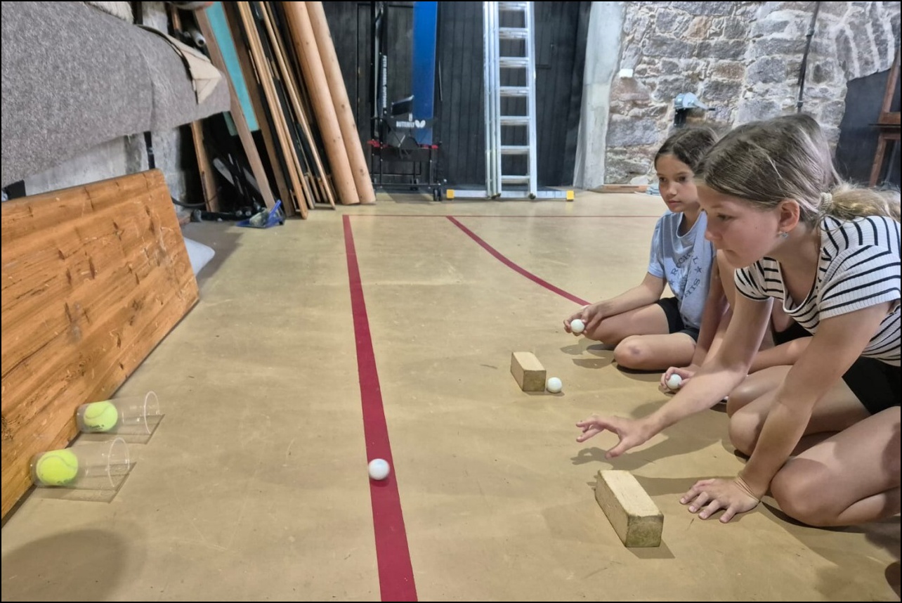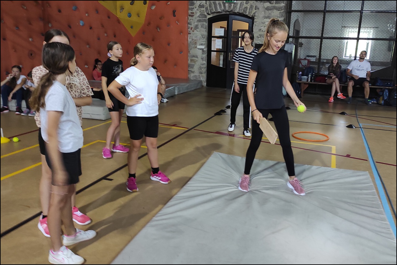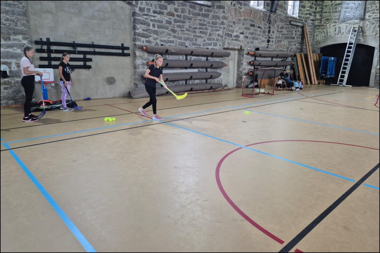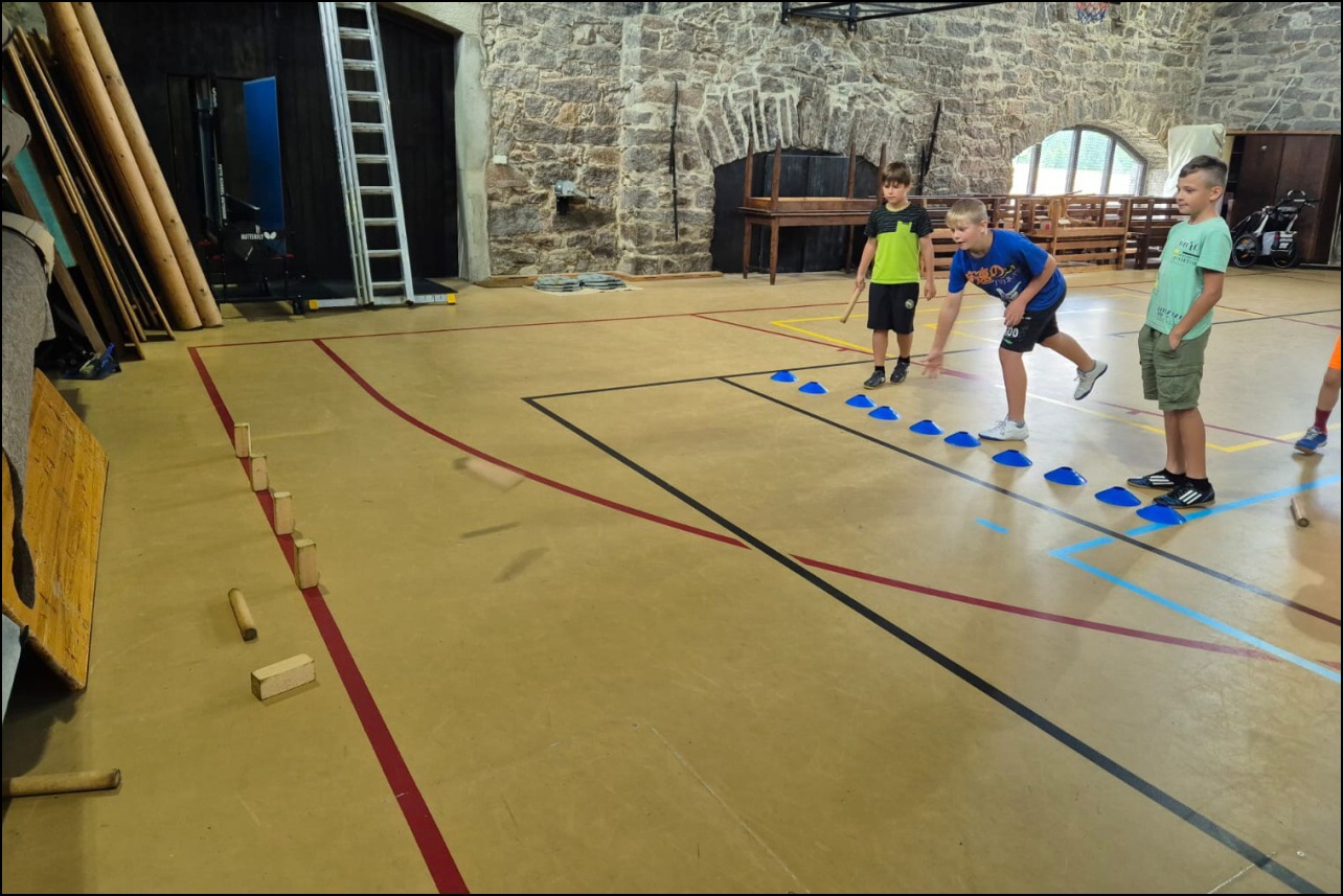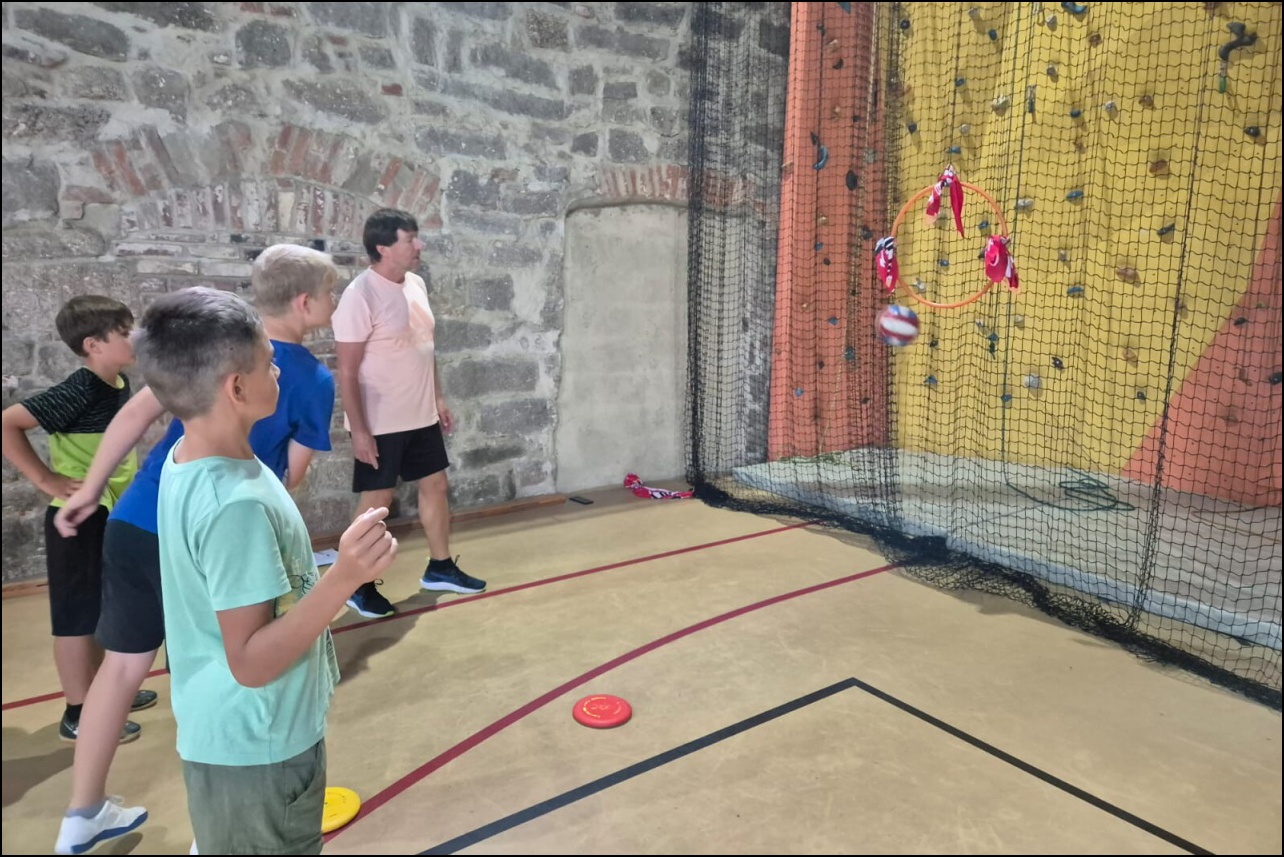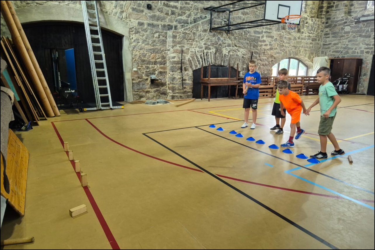 Jelikož jsme očekávali poobědový déšť, rozhodli jsme se dopolední tělocvičnu vynechat a užívat si sluníčka venku. To nás hřálo při další, pro většinu neznámé, hře - disk golf. Po zdolání všechn tras zakončených košem jsme výsledky rychle vyhodnotili a vyhlásili nejlepší disk golfový tým. Chvíli volna před obědem děti využily k osvěžení v potoce nebo malinko namáhaly mozkové závity při dalších "sirkových" hádankách. Odpoledne se v tělocvičně odehrál miniturnaj ve florbale. Opět jsme mohli vidět velice kvalitní a napínavé zápasy, ve kterých se skóre přelévalo ze strany na stranu. Po odehrání následovaly aktivity dle přání a sil dětí - stěna, florbal, basketbal, odpočinek. Jelikož někteří cítili únavu poněkud více, zařadili jsme na večer odpočinkový program ve formě deskových her, x boxu a tanečních podložek. Opět den plný sportu za námi a další před námi, tak hurá do peřin a ráno v plné síle do sálovek!