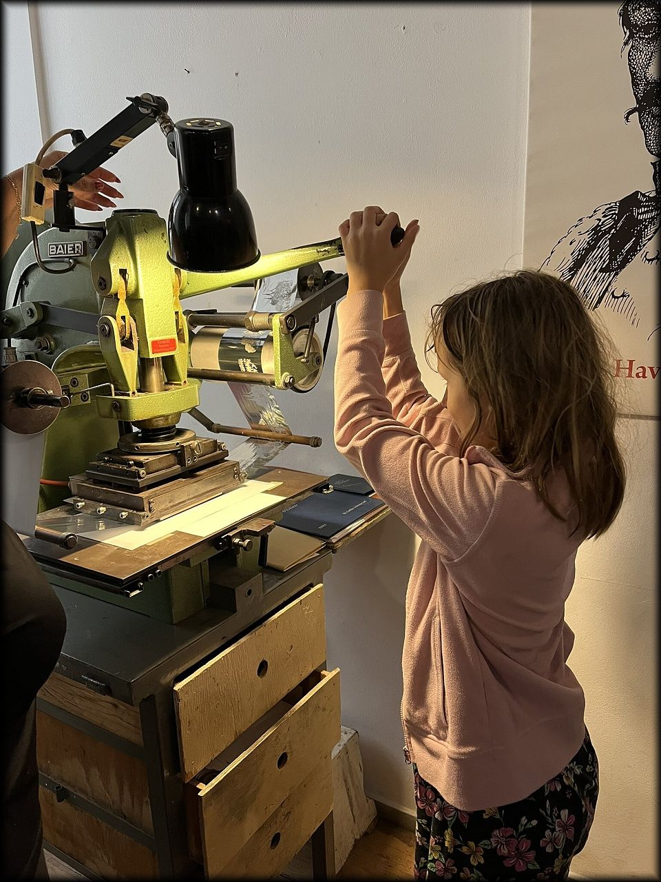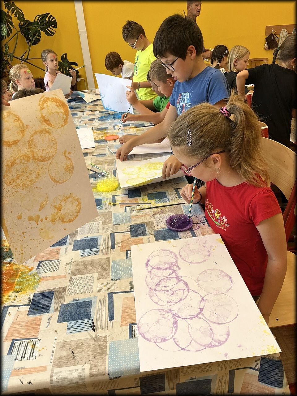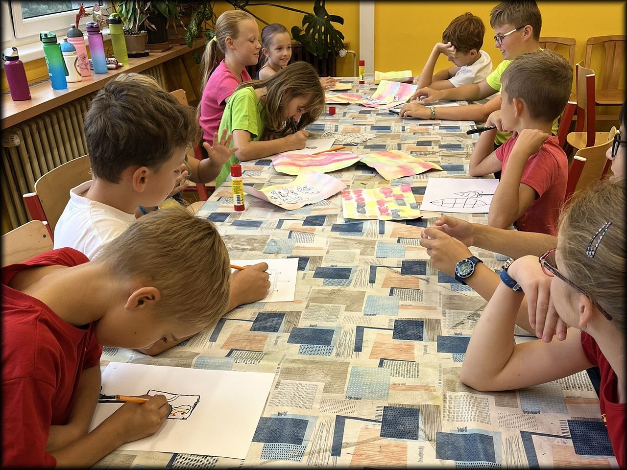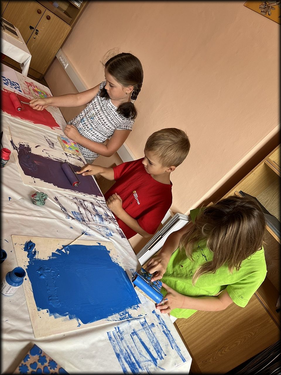 Začátek příměstského tábora Umělcem na vlastní kůži – v říši barev a grafiky byl plný kreativity a dobrodružství. V pondělí jsme se ihned pustili do práce. Náš první úkol spočíval v tvorbě podkladu pro odrývaný obrázek. Po dokončení jsme se pustili do tvorby matric, díky kterým děti v dalším dnu přenesly své motivy na látkové tašky. Po ukončení dopolední výtvarné činnosti jsme se vydali na obědem a poté nás čekala vzrušující cesta do podzemí v Josefově. Na děti zde čekal krásný program, který byl doprovázen příběhem. Děti si zde prošly tajemné části podzemí a měly dokonce možnost se projít i po tmě, což byl pro všechny nezapomenutelný zážitek.