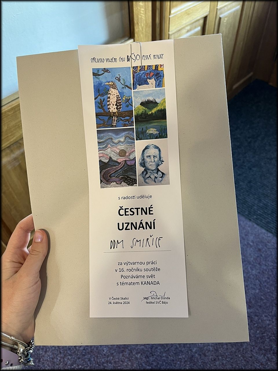 Všechny práce byly představeny na výstavě POZNÁVÁME SVĚT: KANADA v SVČ Bájo, kterou bylo možné shlédnout od 24. 5. do 9. 6. 2024. Vernisáž výstavy se uskutečnila v pátek 24. května 2024 za účasti našich dětí, které zaslouženě převzaly ČESTNÉ UZNÁNÍ. DĚTEM I VEDOUCÍM VÝTVARNÉHO KROUŽKU MALÝ DA VINCI GRATULUJEME!