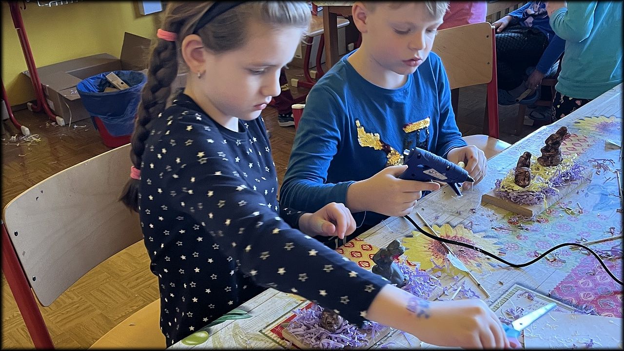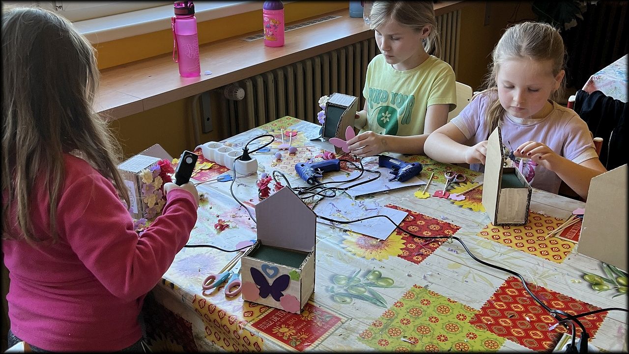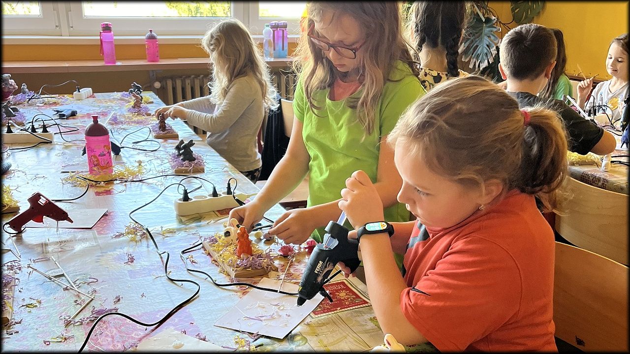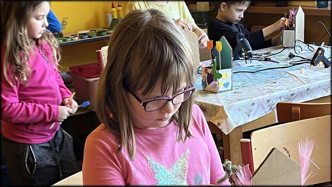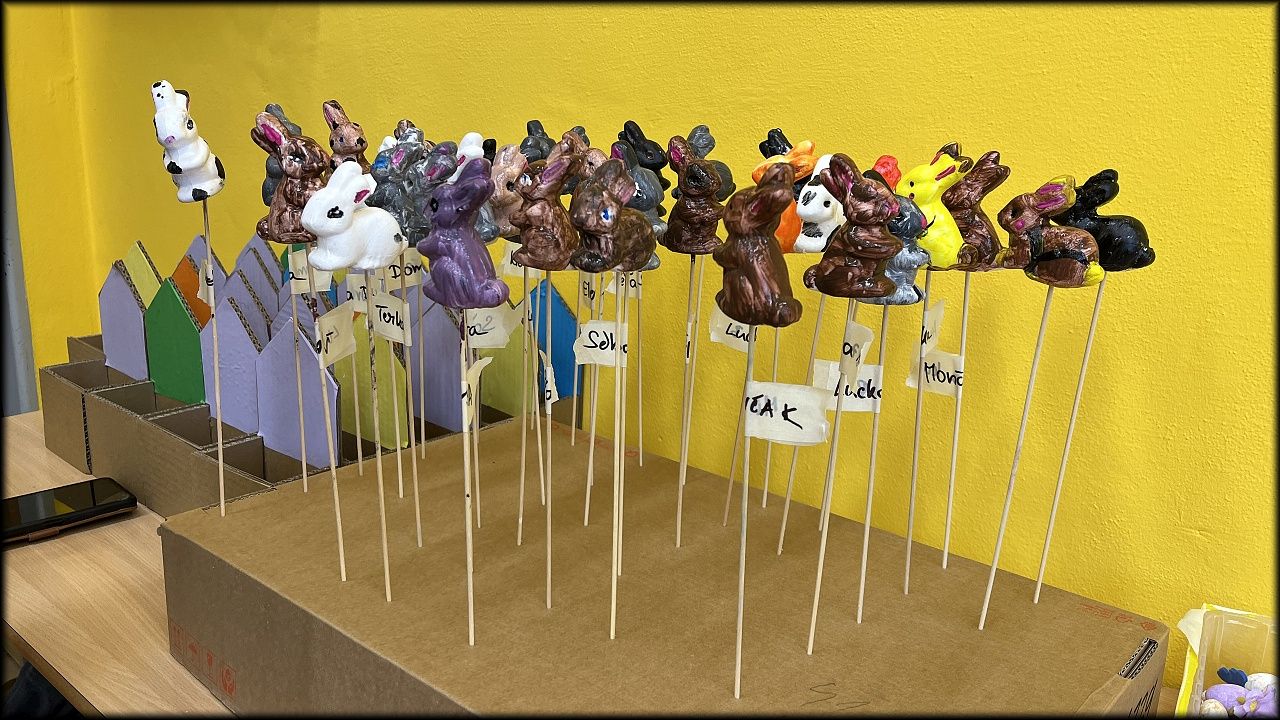 O prázdninách 28.3.2024 jsme se s 24 moc šikovnými dětmi setkali v rámci Velikonoční dílny v prostorech DDM Smiřice. S dětmi jsme se pustili do tvorby několika velikonočních dekorací. V průběhu dopoledne si děti malovaly polyesterové králíky a vajíčka podle svých představ. Vzniklo nám mnoho zajímavých druhů, které vycházely z dětské fantazie. Po dokončení malování jsme se pustili do výroby pometel. Děti si zdobily svá pometla, na kterých se objevovaly hnízdečka pro ptáčky a vajíčka, mnoho barevných kytiček a mašliček a mnoho dalšího. I při této práci nám děti ukázaly svou kreativní stránku, díky které vzniklo mnoho krásných pometel. Následně jsme se vydali na dobrodružnou cestu na oběd. S plnými břichy jsme se vrátili z holohlavské jídelny zpět do DDM, kde na nás již čekali nabarvení králíci a vajíčka. Společně jsme se pustili do tvorby měkoučkých domečků pro králíčky a vajíčko. Naší poslední aktivitou byla výroba kartonového domečku. Děti zde pracovaly s floristickou houbou, do které zapichovaly různé druhy přírodnin. Na úplný konec si tyto domečky ozdobily ze všech stran pomocí různých kytiček, motýlků a dalších velikonočních ozdob.